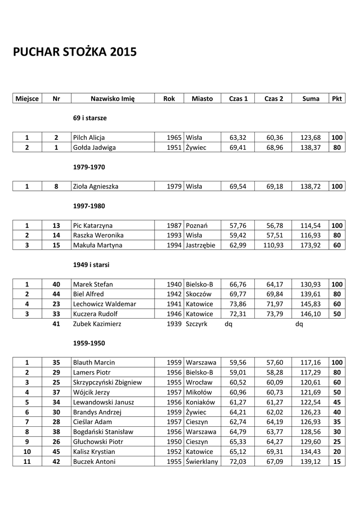 PUCHAR STOŻKA 2015 Miejsce Nr Nazwisko Imię Rok Miasto Czas 1 Czas 2 Suma Pkt 1965 Wisła 1951 Żywiec 63,32 69,41 60,36 68,96 123,68 138,37 100 80 1979 Wisła 69,54 69,18 138,72 100 1987 Poznań 1993 Wisła 1994 Jastrzębie 57,76 59,42 62,99 56,78 57,51 110,93 114,54 116,93 173,92 100 80 60 66,76 69,77 73,86 72,31 dq 64,17 69,84 71,97 73,79 130,93 139,61 145,83 146,10 dq 100 80 60 50 59,56 59,01 60,52 60,96 61,27 64,21 62,74 64,79 65,33 65,12 72,03 57,60 58,28 60,09 60,73 61,27 62,02 64,19 63,77 64,27 69,31 67,09 117,16 117,29 120,61 121,69 122,54 126,23 126,93 128,56 129,60 134,43 139,12 100 80 60 50 45 40 35 30 25 20 15 69 i starsze 1 2 2 1 Pilch Alicja Gołda Jadwiga 1979-1970 1 8 Zioła Agnieszka 1997-1980 1 2 3 13 14 15 Pic Katarzyna Raszka Weronika Makuła Martyna 1949 i starsi 1 2 4 3 40 44 23 33 41 Marek Stefan Biel Alfred Lechowicz Waldemar Kuczera Rudolf Zubek Kazimierz 1940 1942 1941 1946 1939 Bielsko-B Skoczów Katowice Katowice Szczyrk 1959 1956 1955 1957 1956 1959 1957 1956 1950 1952 1955 Warszawa Bielsko-B Wrocław Mikołów Koniaków Żywiec Cieszyn Warszawa Cieszyn Katowice Świerklany 1959-1950 1 2 3 4 5 6 7 8 9 10 11 35 29 25 37 34 30 28 38 26 45 42 Blauth Marcin Lamers Piotr Skrzypczyński Zbigniew Wójcik Jerzy Lewandowski Janusz Brandys Andrzej Cieślar Adam Bogdański Stanisław Głuchowski Piotr Kalisz Krystian Buczek Antoni 12 24 36 27 43 Kwiecień Ryszard Wożniak Wiesław Bąk Tadeusz Rutkowski Krzysztof 1953 1952 1955 1956 Sosnowiec Warszawa Bieruń Katowice 70,82 dq dq dq 69,58 140,40 dq dq dq 10 Zwardoń Katowice Busko Zdr Cieszyn Warszawa Żory Warszawa Warszawa Łódż Raszyn Warszawa Będzin Sosnowiec Katowice Zalesie 1963 Grn 1961 Górki Wlk 1961 Stanica 59,04 58,41 58,76 58,74 59,70 60,65 60,55 61,47 64,49 65,02 64,03 64,88 66,73 72,07 55,62 56,45 56,26 59,75 59,03 60,67 61,03 63,16 62,35 62,22 63,23 62,82 61,95 70,84 114,66 114,86 115,02 118,49 118,73 121,32 121,58 124,63 126,84 127,24 127,26 127,70 128,68 142,91 100 80 60 50 45 40 35 30 25 20 15 10 5 5 83,02 64,15 dq 63,50 146,52 dq dq Czas 1 Czas 2 Suma Pkt Zakopane 56,39 Gdynia 57,45 Dzięgielów 58,88 Zakopane 58,40 Warszawa 59,59 Chorzów 62,59 Chorzów 67,07 Tychy 77,13 Gliwice dq Żelisławice dq Juszczyn dq 55,76 55,62 56,58 57,64 57,40 60,14 66,02 68,90 112,15 113,07 115,46 116,04 116,99 122,73 133,09 146,03 dq dq dq 100 80 60 50 45 40 35 30 1969-1960 1 2 3 4 5 6 7 8 9 10 11 12 13 14 64 63 49 66 61 54 58 47 62 57 60 65 55 59 Talik Zdzisław Bojanowski Łukasz Prośniok Krzysztof Aszkiełowicz Grzegorz Wieczorek Marcin Zastawny Piotr Kowalski Bartłomiej Krzymień Tomasz Dębski Andrzej Sędłak Stanisław Kołaczkowski Tomasz Smętek Witold Wacław Andrzej Staniek Andrzej 15 50 48 52 Prądzyński Michał Mężyk Stanisław Kryj Mariusz Miejsce Nr Nazwisko Imię 1963 1964 1967 1967 1966 1963 1960 1963 1966 1962 1965 1962 1968 1962 Rok Miasto dq 5 1979-1970 1 2 3 4 5 6 7 8 77 79 81 78 75 76 84 80 83 85 86 Skarbek Maliczewski Rafał Mydlarski Jarosław Nieboras Janusz Wadrzyk Bartłomiej Kołder Michał Krempa Piotr Kubala Rafał Matusik Marcin Sapeta Szymon Nowak Roman Wożny Roman 1997-1980 1976 1977 1975 1976 1975 1971 1970 1974 1977 1971 1974 1 2 3 4 5 6 7 8 9 10 11 107 104 108 93 110 105 106 99 97 95 96 94 98 101 109 Kuczański Mieszko Skrzypczyński Marek Szarzec Mateusz Madejczyk Borys Kalisz Błażej Bednarz Andrzej Pilch Adam Kiecko Piotr Kochaj Jerzy Jażwiński Maciej Głuchowski Adam Troszok Tobiasz Kwaśniewski Łukasz Procner Mateusz Szymura Rafał 1996 1980 1992 1992 1981 1983 1986 1983 1983 1990 1989 1986 1984 1990 1982 Ustroń Wrocław Wisła Wisła Katowice Zwardoń Wisła Wisła Meszna Łódż Cieszyn Wisła Zwardoń Wisła Katowice 56,40 57,00 57,18 56,73 58,10 59,40 60,03 61,01 61,72 67,17 97,68 61,19 dq dq dq 54,26 54,19 55,16 55,86 57,40 56,84 58,61 59,06 61,58 65,74 58,12 nz 110,66 111,19 112,34 112,59 115,50 116,24 118,64 120,07 123,30 132,91 155,80 dq dq dq dq 100 80 60 50 45 40 35 30 25 20 15