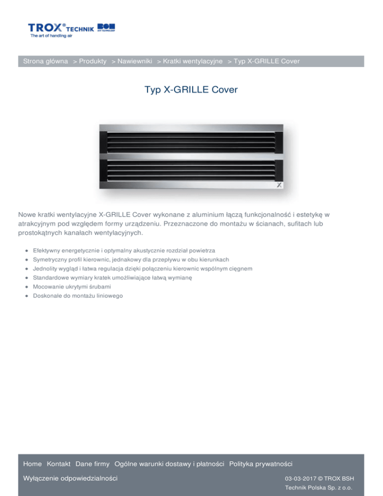 Strona główna > Produkty > Nawiewniki > Kratki wentylacyjne > Typ X-GRILLE Cover Typ X-GRILLE Cover Nowe kratki wentylacyjne X-GRILLE Cover wykonane z aluminium łączą funkcjonalność i estetykę w atrakcyjnym pod względem formy urządzeniu. Przeznaczone do montażu w ścianach, sufitach lub prostokątnych kanałach wentylacyjnych. Efektywny energetycznie i optymalny akustycznie rozdział powietrza Symetryczny profil kierownic, jednakowy dla przepływu w obu kierunkach Jednolity wygląd i łatwa regulacja dzięki połączeniu kierownic wspólnym cięgnem Standardowe wymiary kratek umożliwiające łatwą wymianę Mocowanie ukrytymi śrubami Doskonałe do montażu liniowego Home Kontakt Dane firmy Ogólne warunki dostawy i płatności Polityka prywatności Wyłączenie odpowiedzialności 03-03-2017 © TROX BSH Technik Polska Sp. z o.o. Strona główna > Produkty > Nawiewniki > Kratki wentylacyjne > Typ X-GRILLE Cover OPIS URZĄDZENIA Wraz z nowymi kratkami typu X-GRILLE, estetycznymi i wzbogaconymi o innowacyjne rozwiązania, firma TROX oferuje nowy, optymalny energetycznie produkt o szerokim zakresie zaawansowanych szczegółów. Dwa warianty kratek Basic i Cover dostępne są w standardowych wymiarach. Nowa konstrukcja kierownic zapewnia optymalny akustycznie rozdział powietrza. TECHNOLOGIA prostokątne 40 – 3.200 l/s 140 – 11.400 m³/h B: 225 – 1.225 mm H: 125 – 525 mm Aluminium Home Kontakt Dane firmy Ogólne warunki dostawy i płatności Polityka prywatności Wyłączenie odpowiedzialności 03-03-2017 © TROX BSH Technik Polska Sp. z o.o. Strona główna > Produkty > Nawiewniki > Kratki wentylacyjne > Typ X-GRILLE Cover TROX BSH Technik Polska Sp. z o.o. Kontakt online Formularz kontaktowy Kontakt TROX BSH Stara Iwiczna Zgłoszenie usterki Zapytanie ofertowe - szafy Telefon: +48 22 73718 58 Fax: +48 22 737 18 59 Tel. Komórkowy: +48 662 129 415 Kontakt TROX BSH Technik Polska Sp. z o.o. ul. Kolejowa 13, Stara Iwiczna 05-500 Piaseczno telefon +48 22 737 18 58 fax +48 22 737 18 59 e-mail: [email protected] Home Kontakt Dane firmy Ogólne warunki dostawy i płatności Polityka prywatności Wyłączenie odpowiedzialności 03-03-2017 © TROX BSH Technik Polska Sp. z o.o.