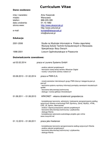 Dane osobowe: imię i nazwisko: miasto: telefon: data urodzenia: strona www: email: Curriculum Vitae Artur Kacprzak Warszawa 888205395 01.10.1982 http://www.akacprzak.pl http://www.arkonet.pl [email protected] [email protected] Edukacja: 20012006 Studia na Wydziale Informatyki w PolskoJapońskiej Wyższej Szkole Technik Komputerowych w Warszawie. Specjalizacja: Bazy Danych. 19962001 Liceum Ogólnokształcące w Piasecznie Doświadczenie zawodowe: od 03.02.2014 praca w Lourens Systems GmbH analiza założeń projektowych tworzenie noewj wersji serwisu iMusician Digital rozwój I utrzymanie serwisu watson.ch 03.08.2013 – 01.02.2014 praca w PWN S.A. rozwój serwisów internetowych grupy PWN (ibuk.pl. ksiegarnia.pwn.pl, pwn.pl) tworzenie systemu wymiany informacji pomiędzy serwisami niezależnych spółek tworzenie dokumentacji technicznej obsługa i rozwój aplikacji intranetowych 01.08.2011 – 01.08.2013 ARKONET własna działalność gospodarcza kompleksowe tworzenie, wdrażanie i testowanie oprogramowania według wytycznych Klienta w technologi PHP (Symfony, Zend), MySQL, HTML, CSS, JS, Sphinx, Memcached analiza i doprecyzowywanie założeń projektowych tworzenie dokumentacji technicznej i użytkownika obsługa Klienta kompleksowe wykonanie autorskiego projektu gier online www.crazymill.net 01.12.2010 – 01.08.2011 praca jako freelancer kompleksowe tworzenie oprogramowania według wytycznych Klienta analiza założeń projektowych tworzenie dokumentacji technicznej i użytkownika obsługa Klienta 01.06.2010 – 01.12.2010 praca w Sun Software Solutions sp. z o.o. na stanowisku programisty PHP udział w dużym projekcie dotowanym z UE. analiza założeń projektowych. wytwarzanie oprogramowania zgodnie z metodyką prowadzenia projektów Scrum. tworzenie dokumentacji technicznej na potrzeby UE. współpraca z osobami z większą wiedzą i doświadczeniem. poznanie i wykorzystywanie kilku nowych technologi. 01.04.2010 – 01.12.2010 praca w Connect One sp. z o.o. na stanowisku programisty PHP. udział projektach dotowanym z UE. analiza założeń projektowych. wytwarzanie oprogramowania zgodnie z metodyką prowadzenia projektów Scrum. tworzenie dokumentacji technicznej na potrzeby UE. współpraca z osobami z większą wiedzą i doświadczeniem. poznanie i wykorzystywanie kilku nowych technologi. 02.02.2009 – 31.03.2010 praca w GEMIUS S.A na stanowisku kierownika zespołu utrzymania aplikacji. Prowadzenie 3osobowego zespołu programistów Projektowanie, analiza, programowanie, wdrażanie i testowanie oprogramowania. Administracje bazami danych. 14.02.2008 – 01.02.2009 praca w GEMIUS S.A na stanowisku analityka / programisty PHP. Wykonywanie zleceń programistycznych w PHP, MySQL, AJAX wraz z dokumentacją. Projektowanie, analiza, programowanie, wdrażanie i testowanie oprogramowania. Administracje bazami danych. Tworzenie ankiet. Administrator danych osobowych. Pomoc techniczna dla pracowników/handlowców firmy. 06.08.2007 – 01.02.2008 praca w Ecreation na stanowisku analityka / programisty PHP,MySQL. Programowanie funkcji oraz AI botów wykorzystywanych w takich komunikatorach jak GG,MSN, Gtalk oraz AOL (np. Alice lub Gbuddy(Goggle buddy) bot). Tworzenie serwisów internetowych oraz tzw. chatbotów z wykorzystaniem PHP, MySQL, CSS, AJAX Udział w wieloosobowych projektach. Administracja bazami danych. Praca / komunikacja w języku angielskim. 13.11.2006 – 01.08.2007 praca w Telekomunikacji Polskiej S.A. na stanowisku analityka / programisty PHP,MySQL. Administracja systemami wewnętrznymi opartymi na bazie danych Oracle, MySQL. Prowadzenie zespołu programistów (grupowe pisanie aplikacji) Wykonywanie zleceń programistycznych w PHP, MySQL, HTML, SOAP, AJAX, CSS i Javascript wraz z dokumentacją. Pisanie skryptów pod system oparty na Oraclu. Wdrażanie oprogramowania. Administracje bazy danych. Pomoc techniczna dla pracowników/handlowców firmy. 01.04.2006 – 31.08.2006 praktyki w „Hoopla.pl” na stanowisku administratora strony WWW, sieci, bazy danych oraz programisty PHP,MySQL. Administracje i serwis komputerów firmowych z obsługą sieci. Administrowanie stroną firmową. Praca w PHP, MySQL, HTML, CSS i Javascript wraz z dokumentacją. Wdrażanie oprogramowania. Administracje bazy danych. Wykonanie zabezpieczeń dla potrzeb gry multimedialnej Hoopla.pl 04.03.2000 – 22.10.2003 praca w „J.M.K. ProGarden System” na stanowisku administratora i programisty baz danych (MySQL, SQL Server, PHP) Administracje i naprawę komputerów firmowych z obsługą sieci. Administrowanie stroną firmową. Wykonywanie zleceń programistycznych w PHP, MySQL, HTML, CSS i Javascript wraz z dokumentacją. Wdrażanie oprogramowania. Administracje bazy danych. Pomoc techniczna dla klientów. Umiejętności: systemy operacyjne: Windows 95/98/ME/NT/2000/XP/2003, Linux / Unix. znajomość sieci komputerowych. języki programowania: podstawy(C/C++ ,Java, Visual Basic, Phyton), PHP. Frameworki: CakePHP, Kohana, Django, Symfony, Zend bazy danych: MS SQLServer, MySQL, Oracle. tworzenie serwisów, sklepów internetowych i stron WWW; znajomość technologii: JavaScript (jQuery), CSS, XHTML, HTML, DHTML, Flash, SOAP, XML, AJAX, SMARTY, Sphinx, Memcached, Backbone, MogileFS, Bootstrap grafika komputerowa: Corel Draw,Photoshop,Maya (3D). Umiejętność szybkiej nauki, planowania i kierowania pracami nad projektami Znajomości języków obcych: Angielski: Inne: pisanie: dobry bardzo dobry czytanie: dobry bardzo dobry mowa: dobry bardzo dobry. Prawo jazdy kategorii B. Referencje dostępne na życzenie. Wyrażam zgodę na przetwarzanie moich danych osobowych dla potrzeb niezbędnych do realizacji procesu rekrutacji. /zgodnie z ustawą z dnia 29.08.1997 o Ochronie Danych Osobowych Dz. U. Nr 133 poz. 883/.
