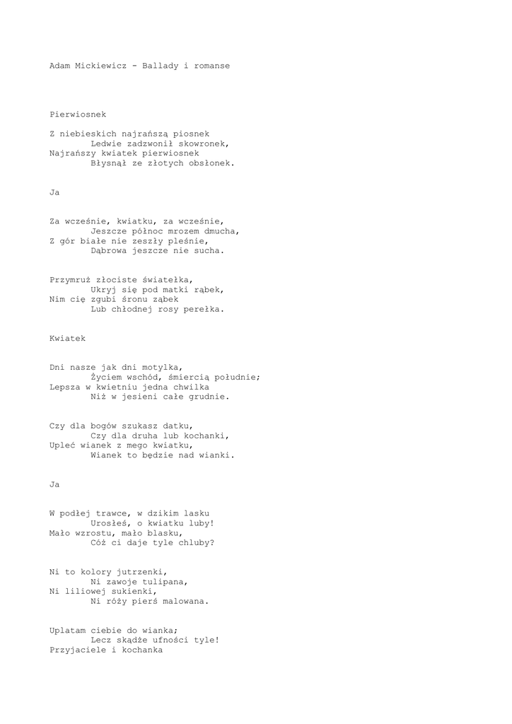 Adam Mickiewicz - Ballady i romanse Pierwiosnek Z niebieskich najrańszą piosnek Ledwie zadzwonił skowronek, Najrańszy kwiatek pierwiosnek Błysnął ze złotych obsłonek. Ja Za wcześnie, kwiatku, za wcześnie, Jeszcze północ mrozem dmucha, Z gór białe nie zeszły pleśnie, Dąbrowa jeszcze nie sucha. Przymruż złociste światełka, Ukryj się pod matki rąbek, Nim cię zgubi śronu ząbek Lub chłodnej rosy perełka. Kwiatek Dni nasze jak dni motylka, Życiem wschód, śmiercią południe; Lepsza w kwietniu jedna chwilka Niż w jesieni całe grudnie. Czy dla bogów szukasz datku, Czy dla druha lub kochanki, Upleć wianek z mego kwiatku, Wianek to będzie nad wianki. Ja W podłej trawce, w dzikim lasku Urosłeś, o kwiatku luby! Mało wzrostu, mało blasku, Cóż ci daje tyle chluby? Ni to kolory jutrzenki, Ni zawoje tulipana, Ni liliowej sukienki, Ni róży pierś malowana. Uplatam ciebie do wianka; Lecz skądże ufności tyle! Przyjaciele i kochanka Czy cię powitają mile? Kwiatek Powitają przyjaciele Mnie, wiosny młodej aniołka; Przyjaźń ma blasku niewiele I cień lubi jak me ziołka. Czym kochanki godzien rączek? Powiedz, niebieska Marylko! Za pierwszy młodości pączek Zyskam pierwszą... ach! łzę tylko. [druga poł. 1820] Romantyczność Methinks, I see... where? - In my mind's eyes. S h a k e s p e a r e Zdaje mi się, że widzę... gdzie? Przed oczyma duszy mojej. Słuchaj, dzieweczko! - Ona nie słucha To dzień biały! to miasteczko! Przy tobie nie ma żywego ducha. Co tam wkoło siebie chwytasz? Kogo wołasz, z kim się witasz? - Ona nie słucha. To jak martwa opoka Nie zwróci w stronę oka, To strzela wkoło oczyma, To się łzami zaleje; Coś niby chwyta, coś niby trzyma; Rozpłacze się i zaśmieje. "Tyżeś to w nocy? - To ty, Jasieńku! Ach! i po śmierci kocha! Tutaj, tutaj, pomaleńku, Czasem usłyszy macocha! "Niech sobie słyszy, już nie ma ciebie! Już po twoim pogrzebie! Ty już umarłeś? Ach! ja się boję! Czego się boję mego Jasieńka? Ach, to on! lica twoje, oczki twoje! Twoja biała sukienka! "I sam ty biały jak chusta, Zimny, jakie zimne dłonie! Tutaj połóż, tu na łonie, Przyciśnij mnie, do ust usta! "Ach, jak tam zimno musi być; w grobie! Umarłeś! tak, dwa lata! Weź mię, ja umrę przy tobie, Nie lubię świata. "Źle mnie w złych ludzi tłumie, Płaczę, a oni szydzą; Mówię, nikt nie rozumie; Widzę, oni nie widzą! "Śród dnia przyjdź kiedy... To może we śnie? Nie, nie... trzymam ciebie w ręku. Gdzie znikasz, gdzie, mój Jasieńku? Jeszcze wcześnie, jeszcze wcześnie! "Mój Boże! kur się odzywa, Zorza błyska w okienku. Gdzie znikłeś? Ach! stój, Jasieńku! Ja nieszczęśliwa". Tak się dziewczyna z kochankiem pieści, Bieży za nim, krzyczy, pada; Na ten upadek, na głos boleści, Skupia się ludzi gromada. "Mówcie pacierze! - krzyczy prostota Tu jego dusza być musi. Jasio być musi przy swej Karusi, On ją kochał za żywota!" I ja to słyszę, i ja tak wierzę, Płaczę i mówię pacierze. "Słuchaj, dzieweczko!" - krzyknie śród zgiełku Starzec i na lud zawoła: "Ufajcie memu oku i szkiełku, Nic tu nie widzę dokoła. "Duchy karczemnej tworem gawiedzi, W głupstwa wywarzone kuźni. Dziewczyna duby smalone bredzi, A gmin rozumowi bluźni". "Dziewczyna czuje - odpowiadam skromnie A gawiedź wierzy głęboko; Czucie i wiara silniej mówi do mnie Niż mędrca szkiełko i oko. "Martwe znasz prawdy, nieznane dla ludu, Widzisz świat w proszku, w każdej gwiazd iskierce; Nie znasz prawd żywych, nie obaczysz cudu! Miej serce i patrzaj w serce!" [styczeń 1821] Świteź Do Michała Wereszczaki Ktokolwiek będziesz w nowogródzkiej stronie, Do Płużyn ciemnego boru Wjechawszy, pomnij zatrzymać twe konie, Byś się przypatrzył jezioru. Świteź tam jasne rozprzestrzenia łona, W wielkiego kształcie obwodu, Gęstą po bokach puszczą oczerniona, A gładka jak szyba lodu. Jeżeli nocną przybliżysz się dobą I zwrócisz ku wodom lice, Gwiazdy nad tobą i gwiazdy pod tobą, I dwa obaczysz księżyce. Niepewny, czyli szklanna spod twej stopy Pod niebo idzie równina, Czyli też niebo swoje szklanne stropy Aż do nóg twoich ugina: Gdy oko brzegów przeciwnych nie sięga, Dna nie odróżnia od szczytu, Zdajesz się wisieć w środku niebokręga, W jakiejś otchłani błękitu. Tak w noc, pogodna jeśli służy pora, Wzrok się przyjemnie ułudzi; Lecz żeby w nocy jechać do jeziora, Trzeba być najśmielszym z ludzi. Bo jakie szatan wyprawia tam harce! Jakie się larwy szamocą! Drżę cały, kiedy bają o tym starce, I strach wspominać przed nocą. Nieraz śród wody gwar jakoby w mieście, Ogień i dym bucha gęsty, I zgiełk walczących, i wrzaski niewieście, I dzwonów gwałt, i zbrój chrzęsty. Nagle dym spada, hałas się uśmierza, Na brzegach tylko szum jodły, W wodach gadanie cichego pacierza I dziewic żałośne modły. Co to ma znaczyć? - różni różnie plotą, Cóż, kiedy nie był nikt na dnie; Biegają wieści pomiędzy prostotą, Lecz któż z nich prawdę odgadnie? Pan na Płużynach, którego pradziady Były Świtezi dziedzice, Z dawna przemyślał i zasięgał rady, Jak te zbadać tajemnice. Kazał przybory w bliskim robić mieście I wielkie sypał wydatki; Związano niewód głęboki stóp dwieście, Budują czółny i statki. Ja ostrzegałem: że w tak wielkim dziele Dobrze, kto z Bogiem poczyna, Dano więc na mszą w niejednym kościele I ksiądz przyjechał z Cyryna. Stanął na brzegu, ubrał się w ornaty, Przeżegnał, pracę pokropił, Pan daje hasło: odbijają baty, Niewód się z szumem zatopił. Topi się, pławki na dół z sobą spycha, Tak przepaść wody głęboka. Prężą się liny, niewód idzie z cicha, Pewnie nie złowią ni oka. Na brzeg oboje wyjęto już skrzydło, Ciągną ostatek więcierzy; Powiemże, jakie złowiono straszydło? Choć; powiem, nikt nie uwierzy. Powiem jednakże: nie straszydło wcale, Żywa kobieta w niewodzie, Twarz miała jasną, usta