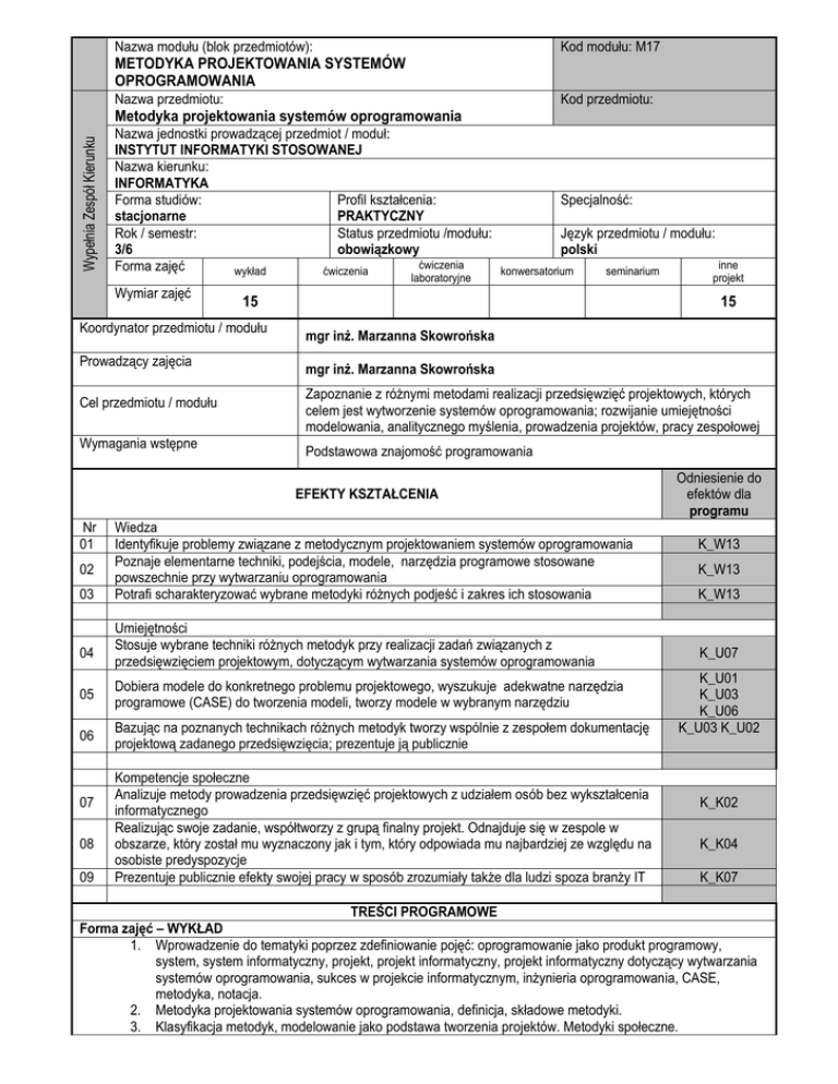 Nazwa modułu (blok przedmiotów): Kod modułu: M17 Nazwa przedmiotu: Kod przedmiotu: METODYKA PROJEKTOWANIA SYSTEMÓW OPROGRAMOWANIA Wypełnia Zespół Kierunku Metodyka projektowania systemów oprogramowania Nazwa jednostki prowadzącej przedmiot / moduł: INSTYTUT INFORMATYKI STOSOWANEJ Nazwa kierunku: INFORMATYKA Forma studiów: Profil kształcenia: Specjalność: stacjonarne PRAKTYCZNY Rok / semestr: Status przedmiotu /modułu: Język przedmiotu / modułu: 3/6 obowiązkowy polski ćwiczenia inne Forma zajęć wykład ćwiczenia konwersatorium seminarium laboratoryjne projekt Wymiar zajęć 15 Koordynator przedmiotu / modułu Prowadzący zajęcia Cel przedmiotu / modułu Wymagania wstępne 15 mgr inż. Marzanna Skowrońska mgr inż. Marzanna Skowrońska Zapoznanie z różnymi metodami realizacji przedsięwzięć projektowych, których celem jest wytworzenie systemów oprogramowania; rozwijanie umiejętności modelowania, analitycznego myślenia, prowadzenia projektów, pracy zespołowej Podstawowa znajomość programowania EFEKTY KSZTAŁCENIA Nr 01 02 03 04 Wiedza Identyfikuje problemy związane z metodycznym projektowaniem systemów oprogramowania Poznaje elementarne techniki, podejścia, modele, narzędzia programowe stosowane powszechnie przy wytwarzaniu oprogramowania Potrafi scharakteryzować wybrane metodyki różnych podjeść i zakres ich stosowania Umiejętności Stosuje wybrane techniki różnych metodyk przy realizacji zadań związanych z przedsięwzięciem projektowym, dotyczącym wytwarzania systemów oprogramowania 05 Dobiera modele do konkretnego problemu projektowego, wyszukuje adekwatne narzędzia programowe (CASE) do tworzenia modeli, tworzy modele w wybranym narzędziu 06 Bazując na poznanych technikach różnych metodyk tworzy wspólnie z zespołem dokumentację projektową zadanego przedsięwzięcia; prezentuje ją publicznie 07 08 09 Kompetencje społeczne Analizuje metody prowadzenia przedsięwzięć projektowych z udziałem osób bez wykształcenia informatycznego Realizując swoje zadanie, współtworzy z grupą finalny projekt. Odnajduje się w zespole w obszarze, który został mu wyznaczony jak i tym, który odpowiada mu najbardziej ze względu na osobiste predyspozycje Prezentuje publicznie efekty swojej pracy w sposób zrozumiały także dla ludzi spoza branży IT Odniesienie do efektów dla programu K_W13 K_W13 K_W13 K_U07 K_U01 K_U03 K_U06 K_U03 K_U02 K_K02 K_K04 K_K07 TREŚCI PROGRAMOWE Forma zajęć – WYKŁAD 1. Wprowadzenie do tematyki poprzez zdefiniowanie pojęć: oprogramowanie jako produkt programowy, system, system informatyczny, projekt, projekt informatyczny, projekt informatyczny dotyczący wytwarzania systemów oprogramowania, sukces w projekcie informatycznym, inżynieria oprogramowania, CASE, metodyka, notacja. 2. Metodyka projektowania systemów oprogramowania, definicja, składowe metodyki. 3. Klasyfikacja metodyk, modelowanie jako podstawa tworzenia projektów. Metodyki społeczne. 4. 5. 6. 7. 8. 9. 10. 11. 12. 13. Metodyki strukturalne. Metodyki obiektowe. Modelowanie sterowane architekturą - MDA(Model Driven Architecture). Podejście zwinne – Agile Manifesto. Biznesowe podejście do projektu informatycznego, przykłady pozytywne i negatywne realizacji projektów informatycznych. Metodyka RUP (Rational Unified Process). Metodyka MSF (Microsoft Solution Framework). Metodyka zwinna: SCRUM, XP – extreme programming. Metodyka zarządzania projektem PRINCE2. Powtórzenie i podsumowanie. Forma zajęć – Projekt Głównym celem ćwiczeń projektowych jest praktyczne zastosowanie metod przedstawianych na wykładzie oraz szkolenie umiejętności modelowania, pracy zespołowej. Na ćwiczeniach wspólnie omawia się różne metody prowadzenia i dokumentowania projektu informatycznego (z pominięciem kodowania). Wiedzę tę wykorzystuje się następnie w pracy w grupach pięciosobowych podczas tworzenia dokumentacji projektowej. Każdy student wykonuje 1 sprawozdanie, które jest fragmentem projektu i stanowi element spójnej całości. Na zajęciach sporządza się notatki, a na ich podstawie w domu wykonuje sprawozdania, które stanowią dokumentację projektową zadanego tematu. Jest ponadto dokonywana analiza wybranego dużego programistycznego projektu informatycznego pod kątem sukcesu, zastosowania Metody kształcenia Wykład z prezentacją multimedialną, ćwiczenia laboratoryjne, dyskusja, praca indywidualna i zespołowa, konsultacja indywidualna z wykładowcą; Nr efektu kształcenia z sylabusa Metody weryfikacji efektów kształcenia Student wykonuje pisemnie zadania związane z aktualnym tematem ćwiczeń, weryfikując je w domu, przedkładając do zaliczenia je na kolejnych zajęciach Student pisze kolokwium semestralne z teorii Na koniec semestru student w zespole tworzy dokumentację projektową Student prezentuje werbalnie i publicznie swoją część dokumentacji projektowej Forma i warunki zaliczenia Literatura podstawowa Literatura uzupełniająca 02,03,04,05 01,02,03 06,04,05 09 praca zespołowa; udział studenta i zaangażowanie w projekcie; umożliwienie wykazania się umiejętnościami menadżerskimi; aktywny udział na ćwiczeniach, sprawozdania; podstawą zaliczenia jest kolokwium z wykładu, rozmowa indywidualna nad dokumentacją projektową i wkładem własnym studenta, łączna ilość punktów zebrana za sprawozdania na ćwiczeniach. 1. 2. 3. 4. 1. 2. Metody wytwarzania oprogramowania – Szejko i inni, Mikom, Warszawa 2002 Inżynieria systemów informacyjnych- Beynon-Davies P., WNT Warszawa 1999 Inżynieria oprogramowania- Jaszkiewicz A., Helion, Gliwice, 1997 „Inżynieria oprogramowania” - Sommerville Ian, WNT, Warszawa 2001 Inżynieria oprogramowania – Górski i inni, Mikom, W-wa Wydajne programowanie , Extreme programming – K.Beck, A.Cynthia Mikom,W-wa 2006 3. Zarządzanie projektami informatycznymi- Z.Szyjewski, Agencja Wydawnicza Placet 2001 NAKŁAD PRACY STUDENTA: Udział w wykładach Samodzi
