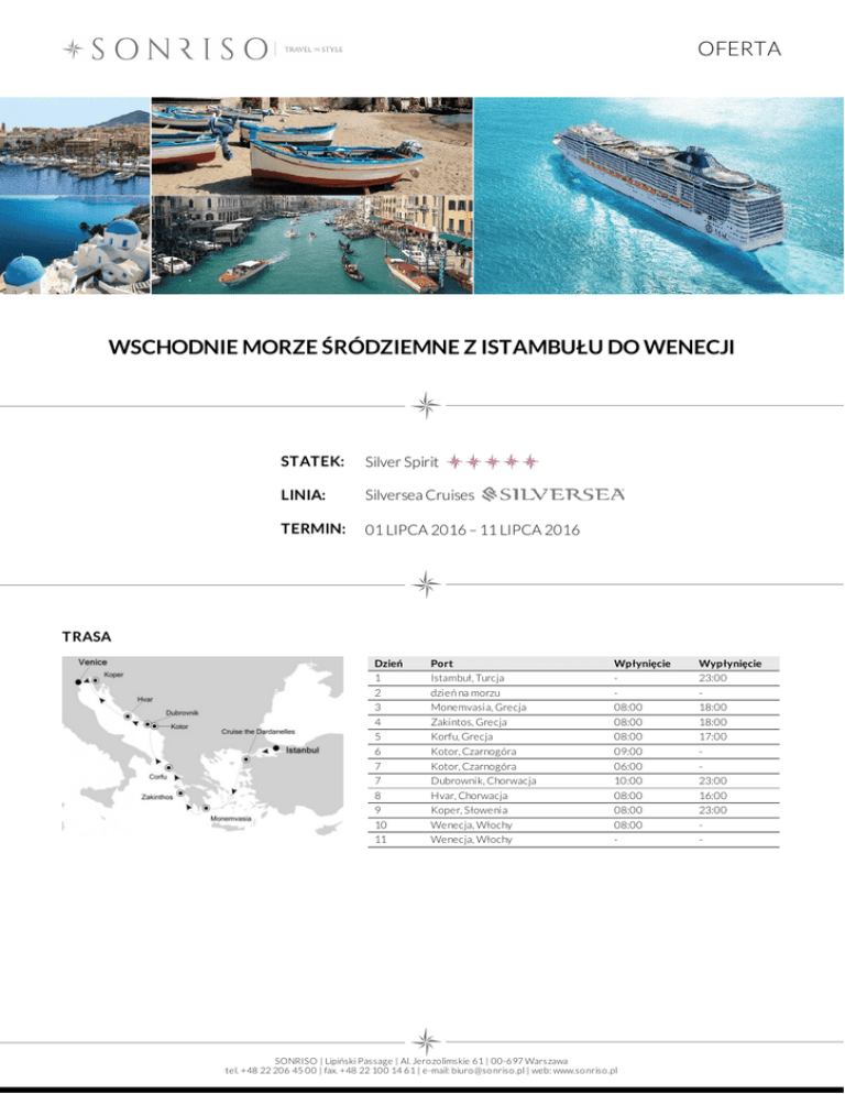 OFERTA WSCHODNIE MORZE ŚRÓDZIEMNE Z ISTAMBUŁU DO WENECJI STATEK: Silver Spirit LINIA: Silversea Cruises TERMIN: 01 LIPCA 2016 – 11 LIPCA 2016 TRASA Dzień 1 2 3 4 5 6 7 7 8 9 10 11 Port Istambuł, Turcja dzień na morzu Monemvasia, Grecja Zakintos, Grecja Korfu, Grecja Kotor, Czarnogóra Kotor, Czarnogóra Dubrownik, Chorwacja Hvar, Chorwacja Koper, Słowenia Wenecja, Włochy Wenecja, Włochy Wpłynięcie 08:00 08:00 08:00 09:00 06:00 10:00 08:00 08:00 08:00 - SONRISO | Lipiński Passage | Al. Jero zo limskie 61 | 00-697 Warszawa tel. +48 22 206 45 00 | fax. +48 22 100 14 61 | e-mail: biuro @so nriso .pl | web: www.so nriso .pl Wypłynięcie 23:00 18:00 18:00 17:00 23:00 16:00 23:00 - OFERTA CENA Typ kabiny Cena z osobę Vista Suite od 4 550 EUR Veranda Suite od 4 950 EUR Silver Suite od 9 250 EUR CENA ZAWIERA DOTATKOWE OPŁATY zakwaterowanie w 2 - os apartamencie wybranej kategorii pełne wyżywienie: 3 posiłki, przekąski między posiłakmi, bufet o północy open bar: wybrane wina i szampany, alkohole premium, różnorodne kawy i herbaty, wodę mineralną butelkowaną, napoje bezalkoholowe oraz soki dostępne w barach i restauracjach korzystanie z mini baru w apartamencie serwis bagażowy podczas wejścia i zejścia ze statku obsługa kamerdynerska 24 godzinny serwis kabinowy korzystanie z urządzeń sportowo - rekreacyjnych dostępnych na pokładzie (baseny, jacuzzi, boiska sportowe, itp.) udział we wszystkich imprezach organizowanych na pokładzie (przedstawienia, pokazy, aukcje, animacje i inne) opłatę serwisową (napiwki) dla obsługi statku transfer pomiędzy portem a miastem (uzależniony od lokalnych przepisów) obowiązkowe opłaty portowe dojazd/przelot do portu rozpoczęcia i zakończenia rejsu transfery (lotnisko - port - lotnisko) ewentualne noclegi przed lub po rejsie wycieczki fakultatywne korzystanie z usług typu: SPA, salon piękności, pralnia itp. wydatki osobiste tj. zakupy w butikach, internet, kasyno itp. obowiązkowe ubezpieczenie turystyczne koszt wymaganych wiz ewentualna opłata paliwowa (linia w momencie wzrotu cen ropy zastrzega sobie prawo do dodania oplaty paliwowej do każdej rezerwacji) Na życzenie świadczymy dodatkowo usługi: rezerwacje hotelowe na całym świecie rezerwacje biletów lotniczych, trasferów oraz parkingu w porcie rezerwacje wycieczek fakultatywnych i innych atrakcji SONRISO | Lipiński Passage | Al. Jero zo limskie 61 | 00-697 Warszawa tel. +48 22 206 45 00 | fax. +48 22 100 14 61 | e-mail: biuro @so nriso .pl | web: www.so nriso .pl