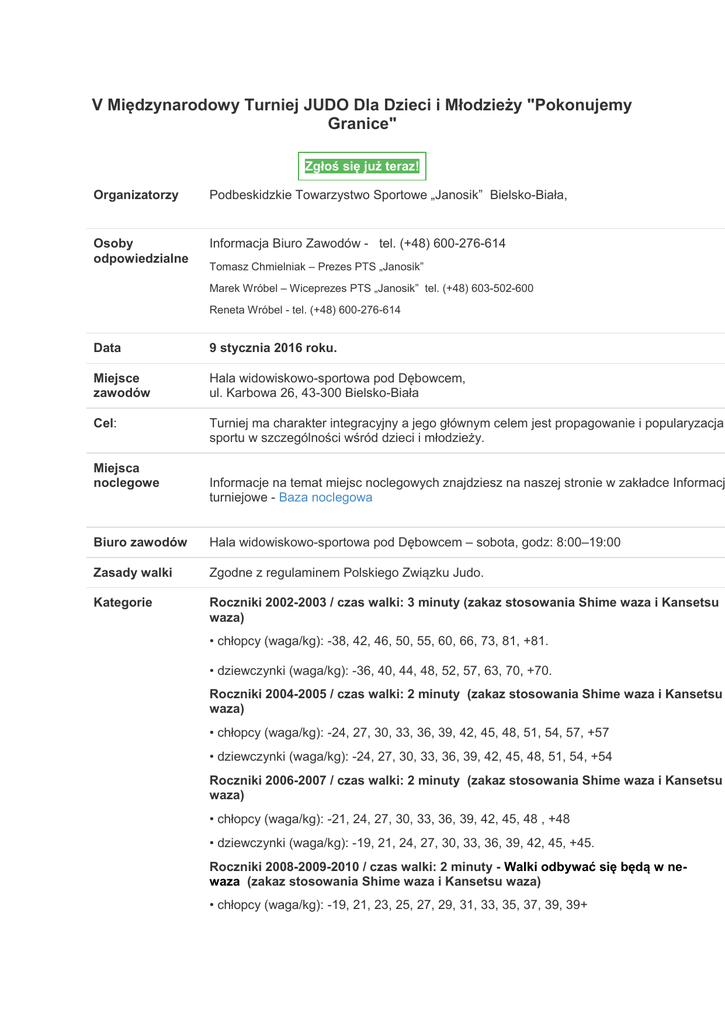 V Międzynarodowy Turniej JUDO Dla Dzieci i Młodzieży "Pokonujemy Granice" Zgłoś się już teraz! Organizatorzy Podbeskidzkie Towarzystwo Sportowe „Janosik” Bielsko-Biała, Osoby odpowiedzialne Informacja Biuro Zawodów - tel. (+48) 600-276-614 Tomasz Chmielniak – Prezes PTS „Janosik” Marek Wróbel – Wiceprezes PTS „Janosik” tel. (+48) 603-502-600 Reneta Wróbel - tel. (+48) 600-276-614 Data 9 stycznia 2016 roku. Miejsce zawodów Hala widowiskowo-sportowa pod Dębowcem, ul. Karbowa 26, 43-300 Bielsko-Biała Cel: Turniej ma charakter integracyjny a jego głównym celem jest propagowanie i popularyzacja sportu w szczególności wśród dzieci i młodzieży. Miejsca noclegowe Informacje na temat miejsc noclegowych znajdziesz na naszej stronie w zakładce Informacj turniejowe - Baza noclegowa Biuro zawodów Hala widowiskowo-sportowa pod Dębowcem – sobota, godz: 8:00–19:00 Zasady walki Zgodne z regulaminem Polskiego Związku Judo. Kategorie Roczniki 2002-2003 / czas walki: 3 minuty (zakaz stosowania Shime waza i Kansetsu waza) • chłopcy (waga/kg): -38, 42, 46, 50, 55, 60, 66, 73, 81, +81. • dziewczynki (waga/kg): -36, 40, 44, 48, 52, 57, 63, 70, +70. Roczniki 2004-2005 / czas walki: 2 minuty (zakaz stosowania Shime waza i Kansetsu waza) • chłopcy (waga/kg): -24, 27, 30, 33, 36, 39, 42, 45, 48, 51, 54, 57, +57 • dziewczynki (waga/kg): -24, 27, 30, 33, 36, 39, 42, 45, 48, 51, 54, +54 Roczniki 2006-2007 / czas walki: 2 minuty (zakaz stosowania Shime waza i Kansetsu waza) • chłopcy (waga/kg): -21, 24, 27, 30, 33, 36, 39, 42, 45, 48 , +48 • dziewczynki (waga/kg): -19, 21, 24, 27, 30, 33, 36, 39, 42, 45, +45. Roczniki 2008-2009-2010 / czas walki: 2 minuty - Walki odbywać się będą w newaza (zakaz stosowania Shime waza i Kansetsu waza) • chłopcy (waga/kg): -19, 21, 23, 25, 27, 29, 31, 33, 35, 37, 39, 39+ • dziewczynki (waga/kg): -18, 20, 22, 24, 26, 28, 30, 32, 34, 36, 36+ Opłata startowa 30 PLN/osoba, płatne w dniu zawodów. Możliwa przedpłata na konto: PTS Janosik Bielsko-Biala ETNO BANK SPÓŁDZIELCZY 14 8140 0009 0014 5932 2000 0010 W tytule przelewu prosimy podać nazwę klubu, nazwisko zgłaszającego z formularza zgłoszeniowego i ilość zawodników. Kwota: 30PLN * ilość zgłoszonych osób. Posiłek Każdy z zawodników otrzyma ciepły posiłek oraz ciastko. Zgłoszenie do zawodów Zgłoszenia należy dokonać poprzez formularz rejestracyjny na stronie internetowejhttp://janosik.judocup.com/registration najpóźniej do godz: 24:00, 07 stycznia 2016 roku. Zgłoszenia uczestników po tym terminie oraz w dniu turnieju to 10 zł więcej do opłaty startowej (w sumie 40 PLN). Zawodnicy niezgłoszeni nie zostaną dopuszczeni do zawodów! Nagrody Indywidualnie: 1 miejsce - puchar/statuetka medal dyplom , 2 miejsce - puchar/statuetka medal dyplom , 3 miejsce - medal dyplom Drużynowo: 1 miejsce - puchar i 10 artykułów sportowych , 2 miejsce - puchar i 10 artykułów sportowych , 3 miejsce - puchar i 10 artykułów sportowych. Nagrody specjalne Każdy ze startujących zawodników otrzyma atrakcyjny prezent. Nagrody specjalne zostały ufundowane przez sponsorów. Program zawodów Ważenie zawodników: 8:00-10:00 Rozgrzewka: 10:00-10.30 Oficjalne rozpoczęcie turnieju: 10.30 Planowany koniec: do rozegrania ostatniej walki (Program zawodów może ulec zmianie.) Waga oficjalna Ważenie elektroniczne. Godziny ważenia zgodnie z programem zawodów. Nie zezwala się na ważenie zawodniczek i zawodników bez odzieży. Podczas ważenia zawodniczka musi mieć na sobie bieliznę osobistą i t-shirt a zawodnik bieliznę osobistą (spodenki). Limity wagowe są powiększone o dodatkowe 100g. Zawodnik/czka nie mieszczący się w limicie wagowym zostanie przepisany do drugiej kategorii Losowanie System elektroniczny. Maty Zawody zostaną przeprowadzone na 7 matach. Badania lekarskie Wszyscy zawodnicy muszą posiadać ważne badania sportowolekarskie.Trener/prowadzący jest zobowiązany do poświadczenia zgody rodziców na udzia w zawodach. W przeciwnym razie dziecko nie będzie dopuszczone do turnieju. Ubezpieczenie NNW Każdy zawodnik jest zobowiązany we własnym zakresie ubezpieczyć się od następstw nieszczęśliwych wypadków. Zawodnicy zagraniczni są zobowiązani do posiadania ubezpieczenia dotyczącego kosztów leczenia w razie urazu podczas zawodów. Judogi Nie są wymagane judogi niebieskie. Wywołany/a zawodnik/czka zakłada czerwoną przepaskę. Sędziowie Osobą odpowiadającą za sprawy sędziowskie jest Dyrektor Sędziów. Dyrektor Sędziów pełni rolę Sędziego Głównego. Dyrektor Sędziów wyznacza obsadę sędziowską z kraju i zza granicy. Na macie sędziuje 1 sędzia arbiter. 2 sędziów bocznych korzysta z systemu Care system. Mata do rozgrzewki Zawodnicy będą mogli korzystać z maty do rozgrzewki. Postanowienia końcowe Zgłoszenie do zawodów jest równoznaczne z akceptacją postanowień niniejszego komunikatu. W sprawach nieobjętych regulaminem decyduje Sędzia Główny Zawodów. Organizator nie ponosi odpowiedzialności za rzeczy zagubione, jak również szkody i wypadki. Organizator zastrzega sobie prawo do wykorzystania wizerunków zawodników w materiałach fotograficznych i filmowych z zawodów oraz w celach promocyjnych Zawodów. Dodatkową atrakcją dla zawodników jak i dla widzów są Mistrzostwa Śląska w Judo dla młodzików i juniorów, których organizacja została przydzielona nam przez Śląski Związek Judo. Impreza odbędzie się następnego dnia (10 styczeń) w hali widowiskowo-sportowej w Bielsku-Białej.