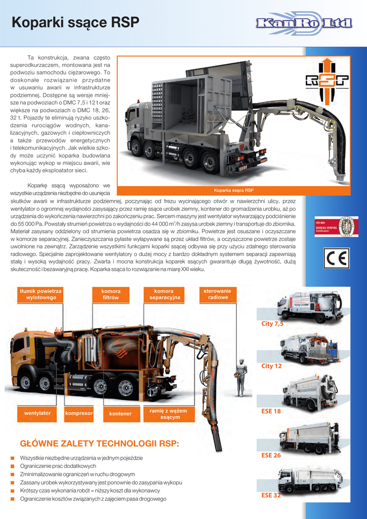 Koparki ssące RSP Ta konstrukcja, zwana często superodkurzaczem, montowana jest na podwoziu samochodu ciężarowego. To doskonałe rozwiązanie przydatne w usuwaniu awarii w infrastrukturze podziemnej. Dostępne są wersje mniejsze na podwoziach o DMC 7,5 i 12 t oraz większe na podwoziach o DMC 18, 26, 32 t. Pojazdy te eliminują ryzyko uszkodzenia rurociągów wodnych, kanalizacyjnych, gazowych i ciepłowniczych a także przewodów energetycznych i telekomunikacyjnych. Jak wielkie szkody może uczynić koparka budowlana wykonując wykop w miejscu awarii, wie chyba każdy eksploatator sieci. Koparkę ssącą wyposażono we Koparka ssąca RSP wszystkie urządzenia niezbędne do usunięcia skutków awarii w infrastrukturze podziemnej, poczynając od frezu wycinającego otwór w nawierzchni ulicy, przez wentylator o ogromnej wydajności zasysający przez ramię ssące urobek ziemny, kontener do gromadzenia urobku, aż po urządzenia do wykończenia nawierzchni po zakończeniu prac. Sercem maszyny jest wentylator wytwarzający podciśnienie do 55 000 Pa. Powstały strumień powietrza o wydajności do 44 000 m3/h zasysa urobek ziemny i transportuje do zbiornika. Materiał zasysany oddzielony od strumienia powietrza osadza się w zbiorniku. Powietrze jest osuszane i oczyszczane w komorze separacyjnej. Zanieczyszczania pylaste wyłapywane są przez układ filtrów, a oczyszczone powietrze zostaje uwolnione na zewnątrz. Zarządzenie wszystkimi funkcjami koparki ssącej odbywa się przy użyciu zdalnego sterowania radiowego. Specjalnie zaprojektowane wentylatory o dużej mocy z bardzo dokładnym systemem separacji zapewniają stałą i wysoką wydajność pracy. Zwarta i mocna konstrukcja koparek ssących gwarantuje długą żywotność, dużą skuteczność i bezawaryjną pracę. Koparka ssąca to rozwiązanie na miarę XXI wieku. City 7,5 City 12 ESE 18 GŁÓWNE ZALETY TECHNOLOGII RSP: Wszystkie niezbędne urządzenia w jednym pojeździe Ograniczenie prac dodatkowych Zminimalizowanie ograniczeń w ruchu drogowym Zassany urobek wykorzystywany jest ponownie do zasypania wykopu Krótszy czas wykonania robót = niższy koszt dla wykonawcy Ograniczenie kosztów związanych z zajęciem pasa drogowego ESE 26 ESE 32 RSP CITY 7,5 RSP City 7.5 to najmniejsza koparka ssąca w ofercie producenta. Przeznaczona jest do wykonywania prac na budowach w obszarze chodników, wąskich uliczek i rynków w śródmieściu. Ze względu na niewielką masę własną (DMC 7500 kg) możliwa jest nawet jazda w strefie ruchu pieszego bez powodowania uszkodzeń w infrastrukturze pieszodrogowej. Koparka ssąca City wyposażona jest w teleskopowy uchwyt węża o maksymalnym zasięgu 3,55 m oraz zakresie obrotu 180 stopni. Wąż ssący o średnicy 150 mm wykonany jest ze specjalnego materiału niezwykle odpornego na ścieranie. Wychylany na bok kontener zbiorczy o pojemności 1,1 m³ pozwala na opróżnianie odessanego materiału Koparka ssąca RSP CITY 7,5 bezpośrednio do worków typu big bag. Na pojazd nośny wybrano, ze względu na jego bardzo korzystną masę użyteczną, Mitsubishi Canter FUSO. Masa własna wynosi w zależności od wyposażenia ok. 6.300 kg, a po załadowaniu w zależności od materiału ok. 7.500 kg. Napęd urządzenia zapewnia silnik pojazdu. Poprzez wbudowaną w wale kardana skrzynię rozdzielczą napędza przyłączone do niej za pomocą kołnierzy pompy hydrauliczne. Zasilają one pojedynczy wentylator dużej mocy, sprężarkę pokładową oraz wszelkie funkcje związane z obsługą poszczególnych podzespołów i opróżnianiem kontenera. Zabudowa ssąca Rodzaj napędu Hydrauliczny Max przepływ 11.300 m³/h Max podciśnienie 14.855 Pa Zbiornik 1,1 m³ Opróżnianie zbiornika boczny wyładunek Marka / typ MITSHUBISHI FUSO System ciśnieniowy 2,2 m³/min, 7 bar Rozstaw osi 3.850 mm System filtrów 22 wkłady filtra Moc silnika 129 kW / 175 KM Sterowanie SPS oraz sterowanie radiowe Wymiary 6.300 x 2.000 x 2.700 mm Głębokość ssania 10 m* Waga (pusty) 6.300 kg Ssanie w poziomie 30 m* DMC 7.500 kg Podwozie RSP CITY 12 Koparka ssąca RSP City 12 to zaawansowane technologicznie urządzenie skonstruowane w oparciu o najnowsze zdobycze techniki i potrzeby rynku. Wyposażona jest w pojedynczy wentylator, teleskopowy wysięgnik węża ssącego o zasięgu 3,10 m oraz dodatkową wiertnicę do wycinania otworów w nawierzchni ulic. Przy użyciu tej kompaktowej koparki ssącej jesteśmy w stanie bardzo szybko i skutecznie wykonać wykop o określonych wymiarach. Wszystkie narzędzia niezbędne do wykonania zamontowane są w tym urządzeniu. Kompresor, dodatkowy zbiornik wody, kontener na urobek o pojemności 1.1 m³, z bocznym wyładunkiem umożliwiają bezpieczne wykonanie robót. Po zakończeniu pracy urobek ziemny trafia ponownie do wykopu. Koparka ssąca RSP CITY 12 Zabudowa ssąca Rodzaj napędu Hydrauliczny Max przepływ 11.300 m³/h Max podciśnienie 14.855 Pa Zbiornik 1,1 m³ Marka / typ Mercedes Benz Atego Opróżnianie zbiornika boczny wyładunek Rozstaw osi 4.160 mm System ciśnieniowy 4,5 m³/min, 7 bar Moc silnika 238 KM System filtrów 24 wkłady filtra Wymiary 8.000 x 2.400 x 3.070 mm Sterowanie SPS oraz sterowanie radiowe Waga (pusty) 11.300 kg Głębokość ssania 10 m* DMC 12.000 kg Ssanie w poziomie 30 m* Podwozie SPRZEDAŻ MASZYN I URZĄDZEŃ DO CZYSZCZENIA KANALIZACJI SERWIS NAPRAWY GWARANCYJNE I POGW RSP CITY 18 Koparka ssąca RSP ESE 18 została zaprojektowana dla podwozia dwuosiowego. Ten kompaktowy model koparki ssącej RSP przeznaczony jest do pracy w centrum miasta, w wąskich ulicach, na parkingach. Szerokość pojazdu wynosi tylko 2,30 m i ułatwia manewrowanie w wąskich ulicach. Maksymalna pojemność kontenera wynosi 4 m3. Napęd urządzenia stanowi pojedynczy wentylator. Montaż zabudowy możliwy jest na wszelkich podwoziach dwuosiowych (4x2) o rozstawie osi od 4 200 mm i maksymalnej dopuszczalnej masie całkowitej 18 t. Moc silnika samochodu napędzającego urządzenie w z