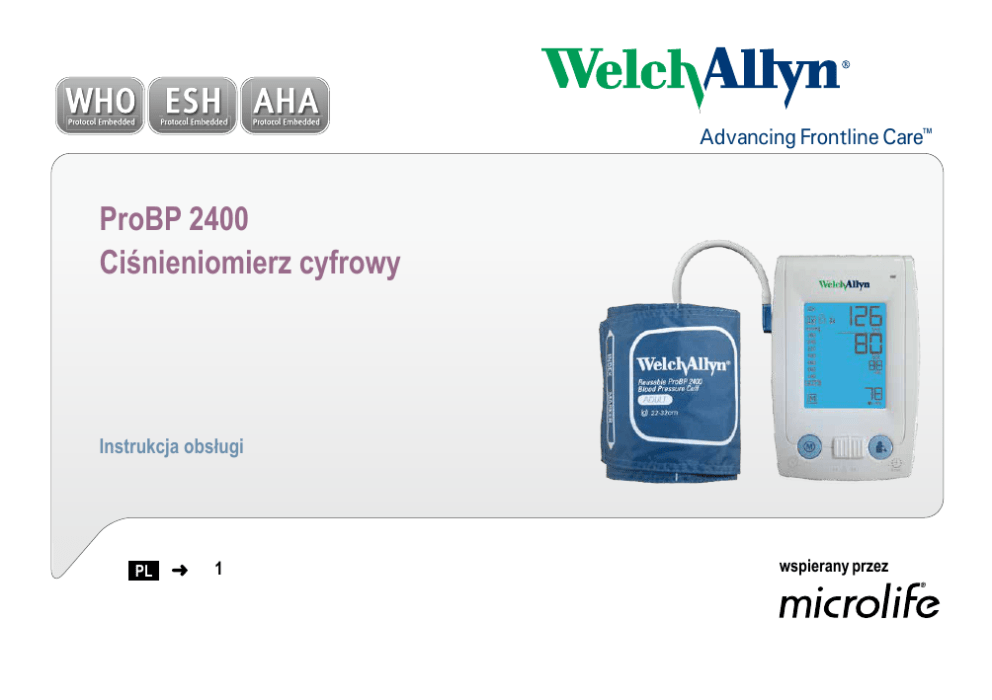 Advancing Frontline Care™ ProBP 2400 Ciśnieniomierz cyfrowy Instrukcja obsługi PL 1 Welch Allyn ProBP 2400 ciśnieniomierz cyfrowy wspierany przez Wprowadzenie Niniejsza instrukcja obsługi stanowi wszechstronny przewodnik, który ma pomóc użytkownikowi zrozumieć możliwości i obsługę ciśnieniomierza cyfrowego ProBP 2400. Przed podjęciem prób konfiguracji, używania, rozwiązywania problemów lub konserwacji urządzenia należy dokładnie przeczytać tę instrukcję. Przeznaczenie ProBP 2400 nieinwazyjny ciśnieniomierz cyfrowy wykorzystujący technikę oscylometryczną i zakładany na ramię mankiet do pomiaru skurczowego i rozkurczowego ciśnienia krwi oraz pulsu i średniego ciśnienia tętniczego (MAP) do stosowania u pacjentów pediatrycznych i dorosłych o średnicy przedramienia w przedziale 14–52 cm. Urządzenie wykrywa występowanie nieregularnej czynności serca podczas pomiaru i emituje sygnał ostrzegawczy przy odczycie w przypadku wykrycia nieregularnej czynności serca. Urządzenie może dokładnie zmierzyć ciśnienie krwi u pacjentek w ciąży, włącznie z pacjentkami o znanym lub podejrzewanym stanie przedrzucawkowym. Urządzenie ProBP 2400 łączy w sobie zalety automatycznego ciśnieniomierza i sfigmomanometru do pomiaru metodą osłuchową. Ma zapewniać wygodne, dokładne i wiarygodne pomiary ciśnienia krwi w gabinecie, zgodnie z wytycznymi Europejskiego Towarzystwa Nadciśnienia (ESH)1, Amerykańskiego Towarzystwa Kardiologicznego (AHA)2 i Światowej Organizacji Zdrowia (WHO)3 z jedynie tą różnicą, że ciśnieniomierz ProBP2400 zawsze dokonuje 3 powtarzanych pomiarów, niezależnie od wyników pierwszych dwóch pomiarów. 2 Ciąża U około 20% kobiet w okresie ciąży występuje nadciśnienie tętnicze (stan przedrzucawkowy lub zatrucie ciążowe), które może wpływać na przebieg ciąży. Stan przedrzucawkowy zazwyczaj można rozpoznać na podstawie wyraźnego wzrostu ciśnienia oraz wysokich stężeń białka w moczu po 20. tygodniu ciąży. Ze względu na to, że wiele oscylometrycznych ciśnieniomierzy nie nadaje się do stosowania w ciąży i w stanie przedrzucawkowym, urzędy ds. zdrowia wymagają, aby urządzenia do monitorowania ciśnienia krwi w tej szczególnie podatnej grupie pacjentów były poddawane określonym testom. Cyfrowy ciśnieniomierz Welch Allyn ProBP 2400 pomyślnie przeszedł weryfikację. Można go więc zalecać do stosowania w okresie ciąży i w stanie przedrzucawkowym. 1 Pickering TG, Hall JE, Appel LJ, et al. Recommendations for blood pressure measurement in humans and experimental animals: part 1: blood pressure measurement in humans: a statement for professionals from the subcommittee of professional and public education of the american heart association council on high blood pressure research. Circulation 2005;111:697-716. 2 Whitworth JA. 2003 World Health Organization (WHO)/International Society of Hypertension (ISH) statement on management of hypertension. J Hypertens 2003;21:1983-92. 3 O’Brien E, Asmar R, Beilin L, et al. Practice guidelines of the European Society of Hypertension for clinic, ambulatory and self blood pressure measurement. J Hypertens 2005;23:697-701. E, Asmar R, Beilin L, Imai Y, et al. European Society of Hypertension recommendations for conventional, ambulatory and home blood pressure measurement. European Society of Hypertension Working Group on Blood Pressure Monitoring. J Hypertens 2005;23:697701.2003,21:1983-1992. Welch Allyn ProBP 2400 ciśnieniomierz cyfrowy 3 PL 4 Spis treści Symbole . ................................................................................. 6 Tryb „1x”................................................................................... 18 Ostrzeżenia i przestrogi Tryb ręczny......................................................................... 19-20 Ogólne ostrzeżenia i przestrogi............................................... 7-8 Tryb „ ”................................................................................... 21 Ostrzeżenia i przestrogi dotyczące nieinwazyjnego pomiaru Funkcje specjalne ciśnienia krwi (NIBP).................................................................. 9 Średnie ciśnienie tętnicze (MAP).............................................. 22 Opis produktu Nazwy części i wyświetlacz................................................. 10-11 Elementy i akcesoria................................................................ 12 Czynności, które należy wykonać przed użyciem ciśnieniomierza ProBP 2400 Podłączanie wtyczki zasilacza do adaptera zasilania............... 13 Wybór jednostek pomiaru........................................................ 14 Wykrywanie nieregularnej czynności serca w trybie „1x”.......... 22 Ustawianie maksymalnego ciśnienia napełniania.................... 23 Wykonywanie mniej niż trzech pomiarów................................. 24 Pomijanie czasu odliczania...................................................... 24 Ustawianie odstępów pomiędzy pomiarami w trybie „ ”.......... 25 Wyświetlanie przechowywanych wartości.......................... 26 Załącznik Akumulator i adapter zasilania . ............................................... 27 Wybór właściwego mankietu.................................................... 15 Rozwiązywanie problemów..................................................... 28 Prawidłowe dopasowanie mankietu.................................... 16-17 Komunikaty o błędach......................................................... 29-30 Pomiar w trybie pojedynczego pomiaru (1x), trybie ręcznym oraz trybie średniej z trzech pomiarów ( ) Welch Allyn ProBP 2400 ciśnieniomierz cyfrowy Bezpieczeństwo, konserwacja, testy dokładności i utylizacja.31-34 Specyfikacja techniczna.......................................................... 35 5 PL Symbole Symbole stosowane w dokumentacji Ostrzeżenie Ostrzeżenia w niniejszej instrukcji określ