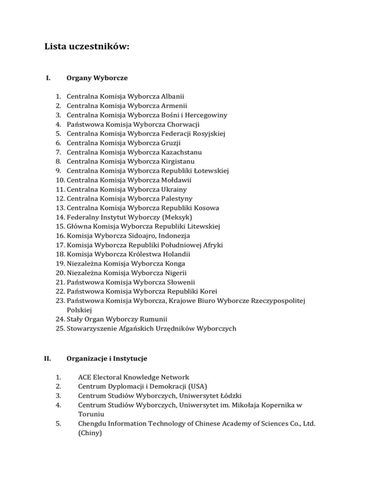 Lista uczestników: I. Organy Wyborcze 1. Centralna Komisja Wyborcza Albanii 2. Centralna Komisja Wyborcza Armenii 3. Centralna Komisja Wyborcza Bośni i Hercegowiny 4. Państwowa Komisja Wyborcza Chorwacji 5. Centralna Komisja Wyborcza Federacji Rosyjskiej 6. Centralna Komisja Wyborcza Gruzji 7. Centralna Komisja Wyborcza Kazachstanu 8. Centralna Komisja Wyborcza Kirgistanu 9. Centralna Komisja Wyborcza Republiki Łotewskiej 10. Centralna Komisja Wyborcza Mołdawii 11. Centralna Komisja Wyborcza Ukrainy 12. Centralna Komisja Wyborcza Palestyny 13. Centralna Komisja Wyborcza Republiki Kosowa 14. Federalny Instytut Wyborczy (Meksyk) 15. Główna Komisja Wyborcza Republiki Litewskiej 16. Komisja Wyborcza Sidoajro, Indonezja 17. Komisja Wyborcza Republiki Południowej Afryki 18. Komisja Wyborcza Królestwa Holandii 19. Niezależna Komisja Wyborcza Konga 20. Niezależna Komisja Wyborcza Nigerii 21. Państwowa Komisja Wyborcza Słowenii 22. Państwowa Komisja Wyborcza Republiki Korei 23. Państwowa Komisja Wyborcza, Krajowe Biuro Wyborcze Rzeczypospolitej Polskiej 24. Stały Organ Wyborczy Rumunii 25. Stowarzyszenie Afgańskich Urzędników Wyborczych II. Organizacje i Instytucje 1. 2. 3. 4. 5. ACE Electoral Knowledge Network Centrum Dyplomacji i Demokracji (USA) Centrum Studiów Wyborczych, Uniwersytet Łódzki Centrum Studiów Wyborczych, Uniwersytet im. Mikołaja Kopernika w Toruniu Chengdu Information Technology of Chinese Academy of Sciences Co., Ltd. (Chiny) 6. 7. 8. 9. 10. 11. 12. 13. 14. 15. 16. 17. 18. 19. 20. 21. 22. 23. 24. 25. 26. 27. 28. 29. 30. Dominion Voting (Kanada) DRS Data Services Limited (Wielka Brytania) Everyone Counts (USA) Haier Electrical Appliances Corp., Ltd. (Chiny) HIC International (Shanghai) Co., Limited (Chiny) IFES (USA) Igbinedion University, Okada, (Nigeria) Indra (Hiszpania) International IDEA (Szwecja) iVote Technologies Ltd (Macedonia) International Centre for Parliamentary Studies (Wielka Brytania) Komisja Wenecka (Rada Europy) Krajowa Izba Gospodarcza Elektroniki i Telekomunikacji (Polska) Lithotech – Bording (Dania/Południowa Afryka) Międzyparlamentarne Zgromadzenie Wspólnoty Niepodległych Państw (WNP) Ministerstwo Administracji i Cyfryzacji OBWE/ODiHR Politechnika Wrocławska Program Narodów Zjednoczonych ds. Rozwoju (UNDP) Scytl (Hiszpania) Smartmatic (Holandia/Wenezuela) Uniwersytet Gdański Uniwersytet Nauk Społecznych i Humanistycznych Uniwersytet Wrocławski Uniwersytet Warszawski