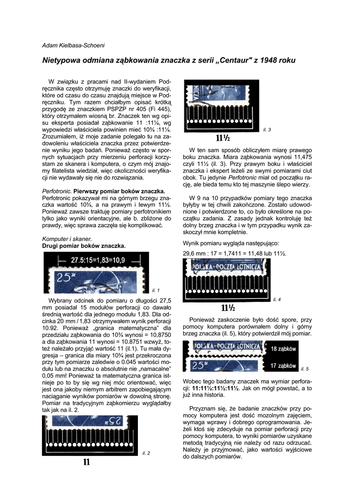 Adam Kielbasa-Schoeni Nietypowa odmiana ząbkowania znaczka z serii „Centaur" z 1948 roku W związku z pracami nad II-wydaniem Podręcznika często otrzymuję znaczki do weryfikacji, które od czasu do czasu znajdują miejsce w Podręczniku. Tym razem chciałbym opisać krótką przygodę ze znaczkiem PSPZP nr 405 (Fi 445), który otrzymałem wiosną br. Znaczek ten wg opisu eksperta posiadał ząbkowanie 11 :11¼, wg wypowiedzi właściciela powinien mieć 10¾ :11¼. Zrozumiałem, iż moje zadanie polegało tu na zadowoleniu właściciela znaczka przez potwierdzenie wyniku jego badań. Ponieważ często w spornych sytuacjach przy mierzeniu perforacji korzystam ze skanera i komputera, o czym mój znajomy filatelista wiedział, więc okoliczności weryfikacji nie wydawały się nie do rozwiązania. Perfotronic. Pierwszy pomiar boków znaczka. Perfotronic pokazywał mi na górnym brzegu znaczka wartość 10¾, a na prawym i lewym 11½. Ponieważ zawsze traktuję pomiary perfotronikiem tylko jako wyniki orientacyjne, ale b. zbliżone do prawdy, więc sprawa zaczęła się komplikować. Komputer i skaner. Drugi pomiar boków znaczka. il. 3 W ten sam sposób obliczyłem miarę prawego boku znaczka. Miara ząbkowania wynosi 11,475 czyli 11½ (il. 3). Przy prawym boku i właściciel znaczka i ekspert leżeli ze swymi pomiarami ciut obok. Tu jedynie Perfotronic miał od początku rację, ale bieda temu kto tej maszynie ślepo wierzy. W 9 na 10 przypadków pomiary tego znaczka byłyby w tej chwili zakończone. Zostało udowodnione i potwierdzone to, co było określone na początku zadania. Z zasady jednak kontroluję też dolny brzeg znaczka i w tym przypadku wynik zaskoczył mnie kompletnie. Wynik pomiaru wygląda następująco: 29,6 mm : 17 = 1,7411 = 11,48 lub 11½. il. 1 Wybrany odcinek do pomiaru o długości 27,5 mm posiadał 15 modułów perforacji co dawało średnią wartość dla jednego modułu 1,83. Dla odcinka 20 mm / 1,83 otrzymywałem wynik perforacji 10.92. Ponieważ „granica matematyczna” dla przedziału ząbkowania do 10¾ wynosi = 10,8750 a dla ząbkowania 11 wynosi = 10.8751 wzwyż, toteż należało przyjąć wartość 11 (il.1). Tu mała dygresja – granica dla miary 10¾ jest przekroczona przy tym pomiarze zaledwie o 0.045 wartości modułu lub na znaczku o absolutnie nie „namacalne” 0,05 mm! Ponieważ ta matematyczna granica istnieje po to by się wg niej móc orientować, więc jest ona jakoby niemym arbitrem zapobiegającym naciąganie wyników pomiarów w dowolną stronę. Pomiar na tradycyjnym ząbkomierzu wyglądałby tak jak na il. 2. il. 2 il. 4 Ponieważ zaskoczenie było dość spore, przy pomocy komputera porównałem dolny i górny brzeg znaczka (il. 5), który potwierdził mój pomiar. il. 5 Wobec tego badany znaczek ma wymiar perforacji: 11:11½:11½:11½. Jak on mógł powstać, a to już inna historia. Przyznam się, że badanie znaczków przy pomocy komputera jest dość mozolnym zajęciem, wymaga wprawy i dobrego oprogramowania. Jeżeli ktoś się zdecyduje na pomiar perforacji przy pomocy komputera, to wyniki pomiarów uzyskane metodą tradycyjną nie należy od razu odrzucać. Należy je przyjmować, jako wartości wyjściowe do dalszych pomiarów.