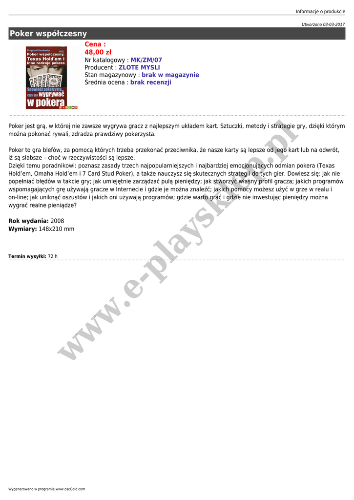 Informacje o produkcie Utworzono 03-03-2017 Poker współczesny Cena : 48,00 zł Nr katalogowy : MK/ZM/07 Producent : ZLOTE MYSLI Stan magazynowy : brak w magazynie Średnia ocena : brak recenzji p. pl Poker jest grą, w której nie zawsze wygrywa gracz z najlepszym układem kart. Sztuczki, metody i strategie gry, dzięki którym można pokonać rywali, zdradza prawdziwy pokerzysta. ay sk le Poker to gra blefów, za pomocą których trzeba przekonać przeciwnika, że nasze karty są lepsze od jego kart lub na odwrót, iż są słabsze – choć w rzeczywistości są lepsze. Dzięki temu poradnikowi: poznasz zasady trzech najpopularniejszych i najbardziej emocjonujących odmian pokera (Texas Hold’em, Omaha Hold’em i 7 Card Stud Poker), a także nauczysz się skutecznych strategii do tych gier. Dowiesz się: jak nie popełniać błędów w takcie gry; jak umiejętnie zarządzać pulą pieniędzy; jak stworzyć własny profil gracza; jakich programów wspomagających grę używają gracze w Internecie i gdzie je można znaleźć; jakich pomocy możesz użyć w grze w realu i on-line; jak uniknąć oszustów i jakich oni używają programów; gdzie warto grać i gdzie nie inwestując pieniędzy można wygrać realne pieniądze? Rok wydania: 2008 Wymiary: 148x210 mm w w w .e - pl Termin wysyłki: 72 h Wygenerowano w programie www.oscGold.com