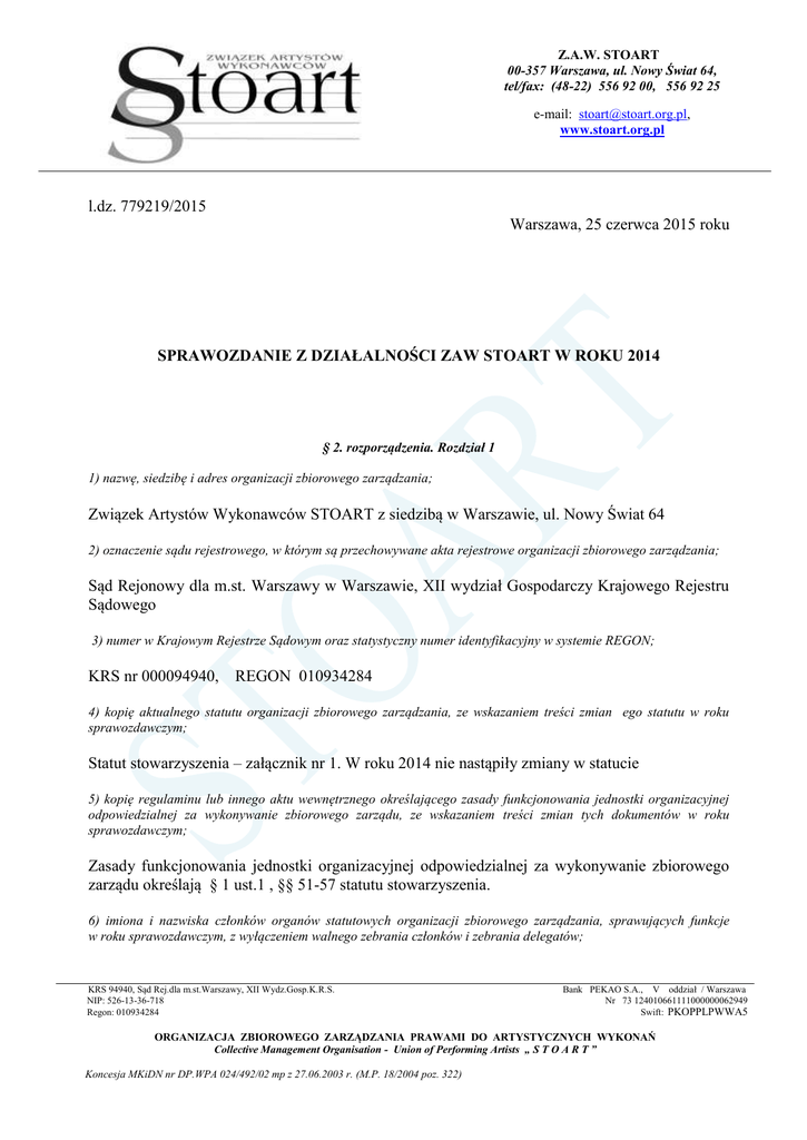 Z.A.W. STOART 00-357 Warszawa, ul. Nowy Świat 64, tel/fax: (48-22) 556 92 00, 556 92 25 e-mail: [email protected], www.stoart.org.pl l.dz. 779219/2015 Warszawa, 25 czerwca 2015 roku SPRAWOZDANIE Z DZIAŁALNOŚCI ZAW STOART W ROKU 2014 § 2. rozporządzenia. Rozdział 1 1) nazwę, siedzibę i adres organizacji zbiorowego zarządzania; Związek Artystów Wykonawców STOART z siedzibą w Warszawie, ul. Nowy Świat 64 2) oznaczenie sądu rejestrowego, w którym są przechowywane akta rejestrowe organizacji zbiorowego zarządzania; Sąd Rejonowy dla m.st. Warszawy w Warszawie, XII wydział Gospodarczy Krajowego Rejestru Sądowego 3) numer w Krajowym Rejestrze Sądowym oraz statystyczny numer identyfikacyjny w systemie REGON; KRS nr 000094940, REGON 010934284 4) kopię aktualnego statutu organizacji zbiorowego zarządzania, ze wskazaniem treści zmian ego statutu w roku sprawozdawczym; Statut stowarzyszenia – załącznik nr 1. W roku 2014 nie nastąpiły zmiany w statucie 5) kopię regulaminu lub innego aktu wewnętrznego określającego zasady funkcjonowania jednostki organizacyjnej odpowiedzialnej za wykonywanie zbiorowego zarządu, ze wskazaniem treści zmian tych dokumentów w roku sprawozdawczym; Zasady funkcjonowania jednostki organizacyjnej odpowiedzialnej za wykonywanie zbiorowego zarządu określają § 1 ust.1 , §§ 51-57 statutu stowarzyszenia. 6) imiona i nazwiska członków organów statutowych organizacji zbiorowego zarządzania, sprawujących funkcje w roku sprawozdawczym, z wyłączeniem walnego zebrania członków i zebrania delegatów; KRS 94940, Sąd Rej.dla m.st.Warszawy, XII Wydz.Gosp.K.R.S. NIP: 526-13-36-718 Regon: 010934284 Bank PEKAO S.A., V oddział / Warszawa Nr 73 124010661111000000062949 Swift: PKOPPLPWWA5 ORGANIZACJA ZBIOROWEGO ZARZĄDZANIA PRAWAMI DO ARTYSTYCZNYCH WYKONAŃ Collective Management Organisation - Union of Performing Artists „ S T O A R T ” Koncesja MKiDN nr DP.WPA 024/492/02 mp z 27.06.2003 r. (M.P. 18/2004 poz. 322) Strona 2 z 10 Skład Zarządu Z.A.W. STOART w okresie 1.01 – 15.03.2014 : 1.- Anna Markowska Przewodnicząca Zarządu 2.- Tomasz Warowny Skarbnik Zarządu 3.- Wincenty Krawczyk Sekretarz Zarządu 4.- Zbigniew Konopczyński I Wiceprzewodniczący Zarządu 5.- Jan Drozdowski II Wiceprzewodniczący Zarządu 6.- Marek Michalak I Zastępca Skarbnika Zarządu 7.- Wiesław Szymański II Zastępca Skarbnika Zarządu 8.- Joanna Pawlak I Zastępca Sekretarza Zarządu 9.- Krzysztof Szczepański II Zastępca Sekretarza Zarządu. Skład Komisji Rewizyjnej 1.01 – 15.01.2015 : 1.- Andrzej Kurpiewski Przewodniczący 2.- Zygfryd Sekuła Z-ca Przewodniczącego 3.- Wojciech Chrzanowski Sekretarz 4.- Stefan Lipczyński Z-ca Sekretarza 5.- Krzysztof Trzcionkowski Członek 6.- Jan Aniołek Członek. Skład Zarządu Z.A.W. STOART w okresie 16.01 – 31.12.2014 to: 1.- Anna Markowska Przewodnicząca Zarządu 2.- Tomasz Warowny Skarbnik Zarządu 3.- Wincenty Krawczyk Sekretarz Zarządu 4.- Zbigniew Konopczyński I Wiceprzewodniczący Zarządu 5.- Jan Drozdowski II Wiceprzewodniczący Zarządu 6.- Marek Michalak I Zastępca Skarbnika Zarządu 7.- Ewa Dubis-Kaczmarek II Zastępca Skarbnika Zarządu 8.- Joanna Pawlak I Zastępca Sekretarza Zarządu 9.- Krzysztof Szczepański II Zastępca Sekretarza Zarządu, Skład Komisji Rewizyjnej: 1.- Zygfryd Sekuła 2.- Krzysztof Trzcionkowski 3.- Wojciech Chrzanowski 4.- Stefan Lipczyński 5.- Ewa Chojnowska 6.- Jan Aniołek Przewodniczący Z-ca Przewodniczącego Sekretarz Z-ca Sekretarza Członek Członek. 7) daty upływu kadencji statutowych organów organizacji zbiorowego zarządzania; Kadencja aktualnych organów władz ZAW STOART kończy się 22.02.2015 r. 8) opis lub schemat struktury organizacyjnej organizacji zbiorowego zarządzania z uwzględnieniem terenowych jednostek organizacyjnych, wraz z informacją o zmianach tej struktury w roku sprawozdawczym; Schemat struktury organizacyjnej organizacji zbiorowego zarządzania (biura wykonawczego) - załącznik nr 2. W porównaniu z rokiem 2013 struktura organizacyjna biura wykonawczego została poszerzona o nowe działy i sekcje. W związku z rozszerzeniem działań w oparciu o personel zatrudniany na podstawie umów o pracę powstała Sekcja Kadry. W celu zintensyfikowania rozliczeń zagranicznych stworzono Sekcję Prawno-Administracyjną ds. współpracy z zagranicą. Dotychczasowy Dział Informatyczno-Rozliczeniowy podzielony został na Sekcje ds. rozliczeń nadawców radiowych, Sekcję ds. rozliczeń operatorów telewizyjnych, Sekcję repartycji repertuaru polskiego i Sekcję repartycji repertuaru zagranicznego. Ponadto utworzono Dział Strona 3 z 10 Monitoringu Płatności i Dział Windykacji. Rozbudowana została także sieć biur terenowych działających na zasadach regionalnych działów biura wykonawczego zwanych Centrami Operacyjnymi STOART. Jednocześnie zrezygnowano z kilku przedstawicielstw prowadzonych przez firmy zewnętrzne. 9) adresy, zakres przedmiotowy i terytorialny działania terenowych jednostek organizacyjnych organizacji zbiorowego zarządzania; Adresy biur i przedstawicielstw terenowych STOART - załącznik nr 3, natomiast zakres terytorialny poszczególnych przedstawiciel przedstawiony został w schemacie organizacyjnym (załącznik nr 2). Zakres przedmiotowy działania wszystkich działów i przedstawicielstw terenowych to: zawieranie umów z użytkownikami artystycznych wykonań, monitorowanie wykonywania umów, prowadzenie kontroli w celu ustalenia faktu wykorzystywania artystycznych wykonań. 10) wskazanie liczby członków organizacji zbiorowego zarządzania w poszczególnych kategoriach członkostwa przewidzianych przez statut oraz zmian tej liczby w roku sprawozdawczym, wraz z informacją, którym kategoriom członków przysługuje czynne i bierne prawo wyborcze do organów statutowych organizacji zbiorowego zarządzania; Liczba członków zwyczajnych na dzień 31.12.2014 wynosiła 6898, na koniec roku 2013 wynosiła 6376. Liczb