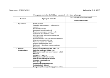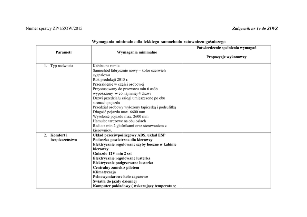 Załącznik nr 1e do SIWZ Numer sprawy ZP/1/ZOW/2015 Wymagania minimalne dla lekkiego samochodu ratowniczo-gaśniczego Potwierdzenie spełnienia wymagań Parametr Wymagania minimalne Propozycje wykonawcy 1. Typ nadwozia 2. Komfort i bezpieczeństwo Kabina na ramie. Samochód fabrycznie nowy – kolor czerwień sygnałowa Rok produkcji 2015 r. Przeszklenie w części osobowej Przystosowany do przewozu min 6 osób wyposażony w co najmniej 4 drzwi Drzwi przedziału załogi umieszczone po obu stronach pojazdu Przedział osobowy wyłożony tapicerką i podsufitką Długość pojazdu max. 6600 mm Wysokość pojazdu max. 2600 mm Hamulce tarczowe na obu osiach Radio z min 2 głośnikami oraz sterowaniem z kierownicy. Układ przeciwpoślizgowy ABS, układ ESP Poduszka powietrzna dla kierowcy Elektrycznie regulowane szyby boczne w kabinie kierowcy Gniazdo 12V min 2 szt Elektrycznie regulowane lusterka Elektrycznie podgrzewane lusterka Centralny zamek z pilotem Klimatyzacja Pełnowymiarowe koło zapasowe Światła do jazdy dziennej Komputer pokładowy ( wskazujący temperaturę zewnętrzną, średnie zużycie paliwa, zasięg) Regulacja fotela kierowcy oraz kolumny kierowniczej w dwóch kierunkach (należy wskazać czy jest – dany parametr nie jest wymogiem koniecznym do spełnienia i podlega ocenie) 3. Wyposażenie Belka świetlna z napisem „STRAŻ” belka dachowa typu LED ( niebieska)posiadająca: - minimum 2 punkty świetlne w kolorze niebieskim, z możliwością zmiany trybu błysku (rotator, strobe, LED) - podświetlany szyld – biały panel z napisem STRAŻ, uruchamiany wraz ze światłami pozycyjnymi pojazdu, - podświetlane moduły LED w kolorze niebieskim – uruchamiane osobnym włącznikiem, - dodatkowe moduły świetlne LED w kolorze niebieskim – do przodu – minimum 2 x 3LED, - wysokość belki dachowej 95mm – 105mm (bez zestawu montażowego), (spełniająca wymagania obowiązujące na terenie RP tj. Regulamin 65 EKG/ONZ dla światła niebieskiego oraz Regulamin 10 EKG/ONZ lub zamiennie Dyrektywę 95/54 EMC dla wszystkich lamp), umożliwiająca jazdę z prędkością maksymalną, 2) wzmacniacz sygnałów (posiadający świadectwo homologacji na zgodność z Regulaminem 10 EKG/ONZ) oferujący komplet funkcji i sterowanie wszystkimi elementami zamontowanej sygnalizacji świetlnej i dźwiękowej oraz umożliwiający podawanie komunikatów słownych na zewnątrz pojazdu poprzez mikrofon zintegrowany z manipulatorem, 3) głośnik kompaktowy o mocy min. 100 W, 4) lampy typu LED (2 szt. niebieskie – spełniające wymagania obowiązujące na terenie RP. tj. Regulamin 65 EKG/ONZ dla światła niebieskiego oraz Regulamin 10 EKG/ONZ ) zamontowane w przedniej części pojazdu, 5) lampa dachowa LED – w tylnej części pojazdu – źródło światła wykonane w tej samej technologii co belka dachowa, 6) wszystkie elementy sygnalizacyjne pochodzące od tego samego producenta, - Zderzaki i nadkola w kolorze białym - Oznaczenie pojazdu wskazanymi numerami operacyjnymi oraz logiem jednostki - Oświetlenie przedziału pasażerskiego włączane z kabiny kierowcy i niezależnie z przedziału pasażerskiego - Oświetlenie przedziału ładunkowego włączane z kabiny kierowcy oraz po otwarciu żaluzji kontenera - Przenośna lampa halogenowa (szperacz) zasilana z gniazda zapalniczki 12V. - Radiotelefon samochodowy o parametrach: częstotliwość VHF 136-174 MHz, moc 1 – 25 W, odstęp międzykanałowy 12,5 kHz dostosowany do użytkowania w sieci MSWiA, min. 128 kanałów, Wyświetlacz alfanumeryczny min. 14 znaków. Obrotowy potencjometr siły głosu 4. Dopuszczalna masa całkowita 5. Ładowność pojazdu po wykonaniu zabudowy pożarniczej w przedziale załogi i przedziale sprzętowym do 3500 kg Min. 800 kg (wraz z kierowcą i pasażerami) 6. Średnica zawracania Należy podać dokładny parametr obrysowej średnicy zawracania potwierdzony wynikami badań. 7. Silnik Z zapłonem samoczynnym z turbodoładowaniem spełniający normy aktualnie obowiązujące w Polsce umożliwiające rejestrację ( min. Euro5) Dopuszcza się brak wyposażenia w urządzeniu do pomiaru zużycia paliwa 8. Moc silnika Nie mniejsza niż 150 KM 9. Moment obrotowy Nie mniejszy niż 350 Nm 10. Skrzynia biegów Mechaniczna, minimum 6-cio biegowa + bieg wsteczny, zsynchronizowana 11. Napęd Oś tylna – tylne koła bliźniacze 12. Układ kierowniczy Ze wspomaganiem 13. Zabudowa kontenerowa Dach wykonany w formie podestu roboczego pokrytego blachą aluminiową ze wzorem przeciwpoślizgowym. Jego konstrukcja powinna wytrzymać obciążenie masą dwóch strażaków i przewożonego sprzętu, drabin, węży ssawnych itp. Na dachu ma być zapewnione miejsce na drabinę nasadkową trzyelementową wraz z mocowaniem. Szerokość rolet bocznych – po 2 rolety na stronę minimum 1000mm każda. Roleta w ścianie tylnej o szerokości minimum 800mm. Rolety aluminiowe pyło-wodo-szczelne w kolorze naturalnego aluminium. Wysokość zabudowy równa wysokości pojazdu. Długość zabudowy min 2300 mm Półki aluminiowe mocowane do stelaża z aluminium, zapewniające miejsce na specjalistyczne wyposażenie pożarnicze z możliwością regulacji. Pozostałe elementy zabudowy wewnątrz przedziału sprzętowego, np. uchwyty, powinny być wykonane z metali odpornych na korozję (np. ze stali nierdzewnej) Szuflada wysuwana na sprzęt typu pompa szlamowa lub sprzęt hydrauliczny Główny wyłącznik prądu urządzeń pozafabrycznych Gniazdo ładowania akumulatorów umiejscowione obok siedzenia kierowcy z kontrolką ładowania 14. Wyposażenie dodatkowe wraz z mocowaniami AGREGAT WYSOKOCIŚNIENIOWY WODNOPIANOWY – POSIADAJĄCY ŚWIADECTWO CNBOPKTÓRE NALEŻY DOŁĄCZYĆ DO OFERTY - wydajność pompy min 50 l/min, przy ciśnieniu min 40 bar - silnik czterosuwowy - rozrusznik ręczny - linia szybkiego natarcia min. 60 mb ze zwijadłem ręcznym - prądownica pistoletowa, z regulacją strumienia od mgłowego do zwartego - zbiornik wody o pojemności 