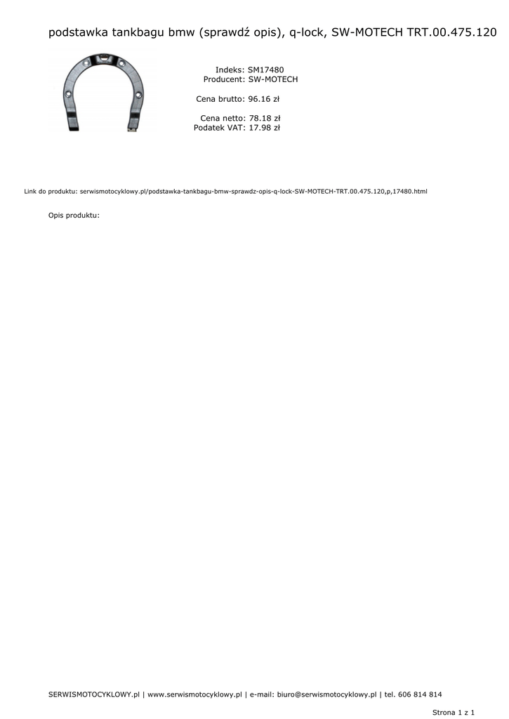 podstawka tankbagu bmw (sprawdź opis), q-lock, SW-MOTECH TRT.00.475.120 Indeks: SM17480 Producent: SW-MOTECH Cena brutto: 96.16 zł Cena netto: 78.18 zł Podatek VAT: 17.98 zł Link do produktu: serwismotocyklowy.pl/podstawka-tankbagu-bmw-sprawdz-opis-q-lock-SW-MOTECH-TRT.00.475.120,p,17480.html Opis produktu: SERWISMOTOCYKLOWY.pl | www.serwismotocyklowy.pl | e-mail: [email protected] | tel. 606 814 814 Strona 1 z 1