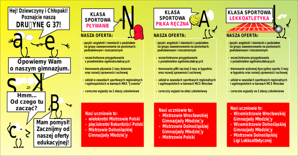 Hej! Dziewczyny i Chłopaki! Poznajcie naszą DRUŻYNĘ G 37! a e Opowiemy Wam o naszym gimnazjum. K s Hmm... Od czego tu zacząć? c B Mam pomysł! Zacznijmy od naszej oferty edukacyjnej! KLASA SPORTOWA PŁYWANIE NASZA OFERTA: N KLASA SPORTOWA PIŁKA RĘCZNA A NASZA OFERTA: KLASA SPORTOWA LEKKOATLETYKA NASZA OFERTA: L - języki: angielski i niemiecki z podziałem na grupy zaawansowania na poziomach: podstawowym i rozszerzonym - języki: angielski i niemiecki z podziałem na grupy zaawansowania na poziomach: podstawowym i rozszerzonym - języki: angielski i niemiecki z podziałem na grupy zaawansowania na poziomach: podstawowym i rozszerzonym - wszechstronne przygotowanie z przedmiotów ogólnokształcących - wszechstronne przygotowanie z przedmiotów ogólnokształcących - wszechstronne przygotowanie z przedmiotów ogólnokształcących - trenowanie pływania 2 razy dziennie oraz rozwój sprawności ruchowej - trenowanie piłki ręcznej 3 razy w tygodniu oraz rozwój sprawności ruchowej - trenowanie wybranej dyscypliny sportu 3 razy w tygodniu oraz rozwój sprawności ruchowej - udział w zawodach sportowych regionalnych i ogólnopolskich w barwach MKS “Juvenia” - udział w zawodach sportowych regionalnych i ogólnopolskich w barwach MCS Wrocław - udział w zawodach sportowych regionalnych i ogólnopolskich w barwach MCS Wrocław - coroczne wyjazdy na 2 obozy szkoleniowe - coroczny wyjazd na obóz szkoleniowy - coroczne wyjazdy na 2 obozy szkoleniowe Nasi uczniowie to: - wielokrotni Mistrzowie Polski - pięciokrotni Rekordziści Polski - Mistrzowie Dolnośląskiej Gimnazjady Młodzieży Nasi uczniowie to: - Mistrzowie Wrocławskiej Gimnazjady Młodzieży - Mistrzowie Dolnośląskiej Gimnazjady Młodzieży - Mistrzowie Polski Nasi uczniowie to: - Wicemistrzowie Wrocławskiej Gimnazjady Młodzieży - Wicemistrzowie Dolnośląskiej Gimnazjady Młodzieży - Mistrzowie Dolnośląskiej Ligi Lekkoaltletycznej KLASA SPORTOWA JUDO X NASZA OFERTA: KLASA MATEMATYCZNO-INFORMATYCZNA NASZA OFERTA: R b - języki: angielski i niemiecki z podziałem na grupy zaawansowania na poziomach: podstawowym i rozszerzonym - języki: angielski i niemiecki z podziałem na grupy zaawansowania na poziomach: podstawowym i rozszerzonym - wszechstronne przygotowanie z przedmiotów ogólnokształcących - informatyka i matematyka na poziomie rozszerzonym - trenowanie judo 4 razy w tygodniu oraz rozwój sprawności ruchowej - dodatkowe zajęcia z matematyki i informatyki - udział w zawodach sportowych regionalnych i ogólnopolskich w barwach MKS “Juvenia” - wszechstronne przygotowanie z przedmiotów ogólnokształcących - coroczny wyjazdy na obóz szkoleniowy - udział w konkursach i olimpiadach matematycznych oraz informatycznych Judo pochodzi z Japonii. Jego twórcą był Jigoro KANO (1860-1938). Zebrał on i ulepszył chwyty jiu-jitsu, nadając im nową formę. Kano usunął z jiu-jitsu elementy mogące zagrozić zdrowiu lub życiu wprowadzając nowe, stworzone przez siebie. Nazwę JUDO można tłumaczyć jako "drogę do zwinności" lub "drogę ustępowania" (JU - zwinnie, ustępować; DO - droga, zasada). Nasi uczniowie to: - Mistrzowie Wrocławia w matematycznym biegu na orientację - Finaliści Dolnośląskiego Finału “Meczów matematycznych” - Wyróżnieni w Międzynarodowym Konkursie Matematycznym “KANGUR” Hmm... Jeszcze przed chwilą pamiętałem... B Załogo G37! Kierunki kształcenia mamy już omówione. Co teraz? C * * No przecież zapraszamy na sprawdziany sprawnościowe TERMINY SPRAWDZIANÓW: - judo - 3 IV 2014 o godz. 16:00 w Gimnazjum nr 37 - lekkoatletyka - 7 IV 2014 o godz. 16:00 w Szkole Podstawowej nr 46 - piłka ręczna - 7 IV 2014 o godz.15:30 w Szkole Podstawowej nr 46, - pływanie - 9 IV 2014 o godz. 16:00 w Szkole Podstawowej nr 46 ZAPRASZAMY i trzymamy kciuki za wyniki! Gimnazjum nr 37 w Zespole Szkól nr 18 53-645 Wrocław, ul.Młodych Techników 58 tel. (71) 355-32-06, fax (71) 355-00-58 g37@zs 18.wroc.pl www.gmn37.wroc.pl www.facebook.com/gmn37.wroclaw