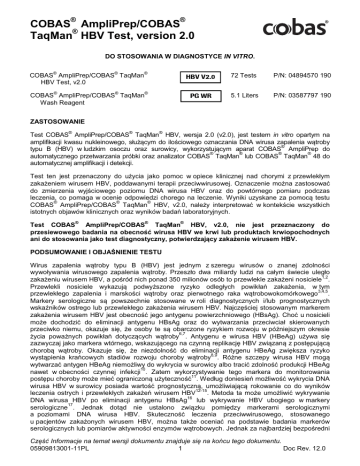 COBAS® AmpliPrep/COBAS® TaqMan® HBV Test, version 2.0 DO STOSOWANIA W DIAGNOSTYCE IN VITRO. COBAS® AmpliPrep/COBAS® TaqMan® HBV Test, v2.0 ® ® ® COBAS AmpliPrep/COBAS TaqMan Wash Reagent HBV V2.0 72 Tests P/N: 04894570 190 PG WR 5.1 Liters P/N: 03587797 190 ZASTOSOWANIE Test COBAS® AmpliPrep/COBAS® TaqMan® HBV, wersja 2.0 (v2.0), jest testem in vitro opartym na amplifikacji kwasu nukleinowego, służącym do ilościowego oznaczania DNA wirusa zapalenia wątroby ® typu B (HBV) w ludzkim osoczu oraz surowicy, wykorzystującym aparat COBAS AmpliPrep do automatycznego przetwarzania próbki oraz analizator COBAS® TaqMan® lub COBAS® TaqMan® 48 do automatycznej amplifikacji i detekcji. Test ten jest przenaczony do użycia jako pomoc w opiece klinicznej nad chorymi z przewlekłym zakażeniem wirusem HBV, poddawanymi terapii przeciwwirusowej. Oznaczenie można zastosować do zmierzenia wyjściowego poziomu DNA wirusa HBV oraz do powtórnego pomiaru podczas leczenia, co pomaga w ocenie odpowiedzi chorego na leczenie. Wyniki uzyskane za pomocą testu COBAS® AmpliPrep/COBAS® TaqMan® HBV, v2.0, należy interpretować w kontekście wszystkich istotnych objawów klinicznych oraz wyników badań laboratoryjnych. Test COBAS® AmpliPrep/COBAS® TaqMan® HBV, v2.0, nie jest przeznaczony do przesiewowego badania na obecność wirusa HBV we krwi lub produktach krwiopochodnych ani do stosowania jako test diagnostyczny, potwierdzający zakażenie wirusem HBV. PODSUMOWANIE I OBJAŚNIENIE TESTU Wirus zapalenia wątroby typu B (HBV) jest jednym z szeregu wirusów o znanej zdolności wywoływania wirusowego zapalenia wątroby. Przeszło dwa miliardy ludzi na całym świecie uległo zakażeniu wirusem HBV, a pośród nich ponad 350 milionów osób to przewlekle zakażeni nosiciele1,2. Przewlekli nosiciele wykazują podwyższone ryzyko odległych powikłań zakażenia, w tym przewlekłego zapalenia i marskości wątroby oraz pierwotnego raka wątrobowokomórkowego3,4,5. Markery serologiczne są powszechnie stosowane w roli diagnostycznych i/lub prognostycznych wskaźników ostrego lub przewlekłego zakażenia wirusem HBV. Najczęściej stosowanym markerem zakażenia wirusem HBV jest obecność jego antygenu powierzchniowego (HBsAg). Choć u nosicieli może dochodzić do eliminacji antygenu HBsAg oraz do wytwarzania przeciwciał skierowanych przeciwko niemu, okazuje się, że osoby te są obarczone ryzykiem rozwoju w późniejszym okresie życia poważnych powikłań dotyczących wątroby6,7. Antygenu e wirusa HBV (HBeAg) używa się zazwyczaj jako markera wtórnego, wskazującego na czynną replikację HBV związaną z postępującą chorobą wątroby. Okazuje się, że niezdolność do eliminacji antygenu HBeAg zwiększa ryzyko wystąpienia krańcowych stadiów rozwoju choroby wątroby8,9. Różne szczepy wirusa HBV mogą wytwarzać antygen HBeAg niemożliwy do wykrycia w surowicy albo tracić zdolność produkcji HBeAg nawet w obecności czynnej infekcji10. Zatem wykorzystywanie tego markera do monitorowania postępu choroby może mieć ograniczoną użyteczność11. Według doniesień możliwość wykrycia DNA wirusa HBV w surowicy posiada wartość prognostyczną, umożliwiającą rokowanie co do wyników leczenia ostrych i przewlekłych zakażeń wirusem HBV12-15. Metoda ta może umożliwić wykrywanie DNA wirusa HBV po eliminacji antygenu HBsAg16 lub wykrywanie HBV ubogiego w markery serologiczne17. Jednak dotąd nie ustalono związku pomiędzy markerami serologicznymi a poziomami DNA wirusa HBV. Skuteczność leczenia przeciwwirusowego, stosowanego u pacjentów zakażonych wirusem HBV, można także oceniać na podstawie badania markerów serologicznych lub pomiarów aktywności enzymów wątrobowych. Jednak za najbardziej bezpośredni Część Informacje na temat wersji dokumentu znajduje się na końcu tego dokumentu. 05909813001-11PL 1 Doc Rev. 12.0 i rzetelny sposób pomiaru replikacji wirusa uważa się ilościową ocenę stężenia DNA HBV w surowicy 14,18-20 . Wykazano, że szybki i trwały spadek poziomów DNA wirusa HBV u pacjentów lub osoczu otrzymujących alfa-interferon, lamiwudynę, gancyklowir lub dipiwoksyl adefowiru jest czynnikiem 11,21-25 . Monitorowanie poziomów DNA wirusa HBV predykcyjnym pomyślnego wyniku leczenia pozwala przewidzieć rozwój jego oporności na lamiwudynę26. Zatem ilościowy test służący do pomiaru stężenia DNA wirusa HBV jest cennym narzędziem, które można wykorzystywać w połączeniu z badaniami innych markerów serologicznych podczas leczenia zakażenia HBV. Ilościowe oznaczenie DNA wirusa HBV w osoczu i surowicy można przeprowadzić przy użyciu technik amplifikacji kwasów nukleinowych, takich jak reakcja łańcuchowej polimerazy 27-29 . w teście COBAS® AmpliPrep/COBAS® TaqMan® HBV, (ang. Polymerase Chain Reaction, PCR) v2.0, wykorzystano technologię PCR do osiągnięcia maksymalnej czułości i dynamicznego zakresu ilościowych oznaczeń DNA wirusa HBV w osoczu z dodatkiem EDTA jako antykoagulanta i w surowicy. ZASADY PROCEDURY Test COBAS® AmpliPrep/COBAS® TaqMan® HBV, v2.0, jest testem opartym na amplifikacji kwasu nukleinowego, służącym do ilościowego oznaczania DNA wirusa zapalenia wątroby typu B (HBV) w ludzkim osoczu i surowicy. Test COBAS® AmpliPrep/COBAS® TaqMan® HBV, v2.0, jest oparty na dwóch głównych procesach: (1) przygotowaniu próbki w celu wyizolowania DNA wirusa HBV oraz 27 docelowego DNA i detekcji rozszczepionej, podwójnie (2) jednoczesnej amplifikacji PCR znakowanej sondy oligonukleotydowej, swoistej dla łańcucha docelowego. Test COBAS® AmpliPrep/COBAS® TaqMan® HBV, v2.0, umożliwia automatyczne przygotowanie próbki, a następnie automatyczną amplifikację PCR oraz detekcję docelowego DNA wirusa HBV i DNA standardu ilościowego HBV (ang. Quantitation Standard, QS). Odczynnik Master Mix zawiera pary primerów i sondy swoiste zarówno dla DNA wirusa HBV, jak i DNA standardu HBV QS. Odczyn
