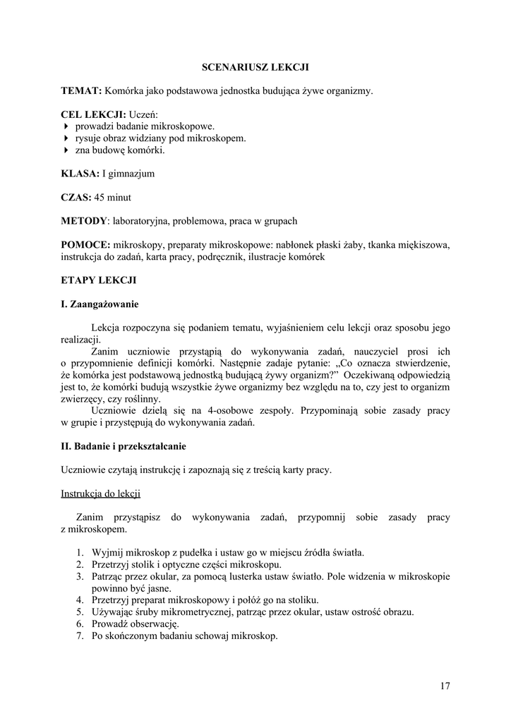 SCENARIUSZ LEKCJI TEMAT: Komórka jako podstawowa jednostka budująca żywe organizmy. CEL LEKCJI: Uczeń:  prowadzi badanie mikroskopowe.  rysuje obraz widziany pod mikroskopem.  zna budowę komórki. KLASA: I gimnazjum CZAS: 45 minut METODY: laboratoryjna, problemowa, praca w grupach POMOCE: mikroskopy, preparaty mikroskopowe: nabłonek płaski żaby, tkanka miękiszowa, instrukcja do zadań, karta pracy, podręcznik, ilustracje komórek ETAPY LEKCJI I. Zaangażowanie Lekcja rozpoczyna się podaniem tematu, wyjaśnieniem celu lekcji oraz sposobu jego realizacji. Zanim uczniowie przystąpią do wykonywania zadań, nauczyciel prosi ich o przypomnienie definicji komórki. Następnie zadaje pytanie: „Co oznacza stwierdzenie, że komórka jest podstawową jednostką budującą żywy organizm?” Oczekiwaną odpowiedzią jest to, że komórki budują wszystkie żywe organizmy bez względu na to, czy jest to organizm zwierzęcy, czy roślinny. Uczniowie dzielą się na 4-osobowe zespoły. Przypominają sobie zasady pracy w grupie i przystępują do wykonywania zadań. II. Badanie i przekształcanie Uczniowie czytają instrukcję i zapoznają się z treścią karty pracy. Instrukcja do lekcji Zanim przystąpisz z mikroskopem. do wykonywania zadań, przypomnij sobie zasady pracy 1. Wyjmij mikroskop z pudełka i ustaw go w miejscu źródła światła. 2. Przetrzyj stolik i optyczne części mikroskopu. 3. Patrząc przez okular, za pomocą lusterka ustaw światło. Pole widzenia w mikroskopie powinno być jasne. 4. Przetrzyj preparat mikroskopowy i połóż go na stoliku. 5. Używając śruby mikrometrycznej, patrząc przez okular, ustaw ostrość obrazu. 6. Prowadź obserwację. 7. Po skończonym badaniu schowaj mikroskop. 17 Jeżeli przypomniałeś sobie zasady mikroskopowania, możesz przystąpić do wykonywania zadań zgodnie z kolejnością ustaloną w karcie pracy. Gdybyś miał problemy skorzystaj z pomocy nauczyciela. W tej części lekcji uczniowie prowadzą obserwacje mikroskopowe i wykonują schematyczne rysunki obserwowanych komórek. Nauczyciel umawia się z uczniami, że wykonują rysunki większe niż obraz oglądany pod mikroskopem. Cały czas nadzoruje i kieruje pracą grup oraz poszczególnych osób, dbając o dyscyplinę i ład na stanowiskach. III. Prezentacja i refleksja 1. Sprawozdawcy przedstawiają wyniki pracy swojej grupy. Nauczyciel czyni ewentualne uzupełnienia, poleca lekturę odpowiednich źródeł w celu utrwalenia wiadomości. Powołuje się przy tym na ilustracje komórek, które powiesił na tablicy lub rozdał uczniom. 2. Następnie uczniowie dokonują porównania efektów badań oraz oceniają pracę w zespole według załączonego schematu. Kryteria oceny Tak Nie Czuliśmy się współodpowiedzialni za wykonanie zadań. Akceptowaliśmy zdanie innych Wspólnie podejmowaliśmy decyzje. Dbaliśmy o przyjazną atmosferę w grupie. Czy jesteście zadowoleni z efektów własnej pracy? Notatką z lekcji jest wypełniona karta pracy. Opracowanie: Joanna Marek 18 KARTA PRACY Jeżeli przypomniałeś sobie zasady mikroskopowania możesz przystąpić do wykonywania zadań zgodnie z kolejnością ustaloną w karcie pracy. 1. Obejrzyj pod mikroskopem komórki nabłonkowe żaby. Wykonaj rysunek i opisz go, korzystając z podręcznika. 2. Na rysunku zaznaczyłeś tylko 3 składniki komórkowe. Korzystając z podręcznika wpisz inne, niewidoczne na preparacie mikroskopowym. ________________________________________________________________________ ________________________________________________________________________ ________________________________________________________________________ 3. Teraz obejrzyj komórki roślinne budujące tkankę miękiszową. Wykonaj rysunek i opisz go. ________________________________________________________________________ ________________________________________________________________________ ________________________________________________________________________ ________________________________________________________________________ 4. Budowa komórki roślinnej różni się od komórki zwierzęcej. Różnice te wynikają z obecności w tej pierwszej ciałek zieleni i ściany komórkowej. Zastanów się, czy są inne różnice między komórkami? Aby na to pytanie odpowiedzieć proponuję Ci następujące zadania. a. Masz przed sobą trzy prostopadłościany różnej wielkości. Wyobraź sobie, że są to komórki. Prowadzisz obserwację. Jaki wniosek wyciągniesz? ___________________________________________________________________________ ___________________________________________________________________________ b. Masz przed sobą kulę, sześcian i prostopadłościan. Tak jak w powyższym zadaniu bryły te skojarz z komórkami. Prowadzisz obserwację. Zapisz wniosek. ___________________________________________________________________________ ___________________________________________________________________________ 19 5. Zastanów się teraz, z czego te różnice wynikają. Praca domowa Dla utrwalenia podstawowych informacji o komórce, wykonaj następujące zadanie. Masz do dyspozycji torebkę foliową, wodę, nasiona zielonego groszku, piłeczkę oraz grzebień. Jakie składniki komórki zbudujesz z tych elementów? Swoje propozycje wpisz do tabeli. Składnik budujący Składnik komórkowy Torebka foliowa Woda Nasiona zielonego groszku Piłeczka Grzebień Źródła: 1. Materiały Edukacyjne Programu Kreator 2. Ćwiczenia z biologii- B. Bartecka, M. Niemierko, S. Frejlak 3. Samodzielna praca ucznia na lekcjach biologii- B.Góra 4. Doświadczenia biologiczne z zastosowaniem projektoskopu- J. Frątczak 5. Uczymy kreatywnie. Biologia. Karty pracy-A. Liebert, A. Kozłowska-Rajewicz 6.Uczymy kreatywnie. Biologia. Podręcznik dla n-la I klasy gimnazjum- A. Liebert, A. Kozłowska-Rajewicz 7. Biologia. Poradnik dla nauczyciela w klasach I-III gimnazjum- E. Wierbiłowicz 8. Materiały edukacyjne-Wydawnictwo CODN 9. Scenariusze. Biologia 5-