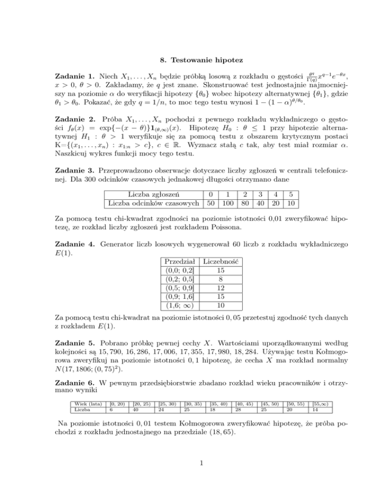 Zadanie 2. Próba X1 , . . . , Xn pochodzi z pewnego rozkładu wykładniczego o gęstości fθ (x) = exp{−(x − θ)}1(θ,∞) (x). Hipotezę H0 : θ ≤ 1 przy hipotezie alternatywnej H1 : θ > 1 weryfikuje się za pomocą testu z obszarem krytycznym postaci