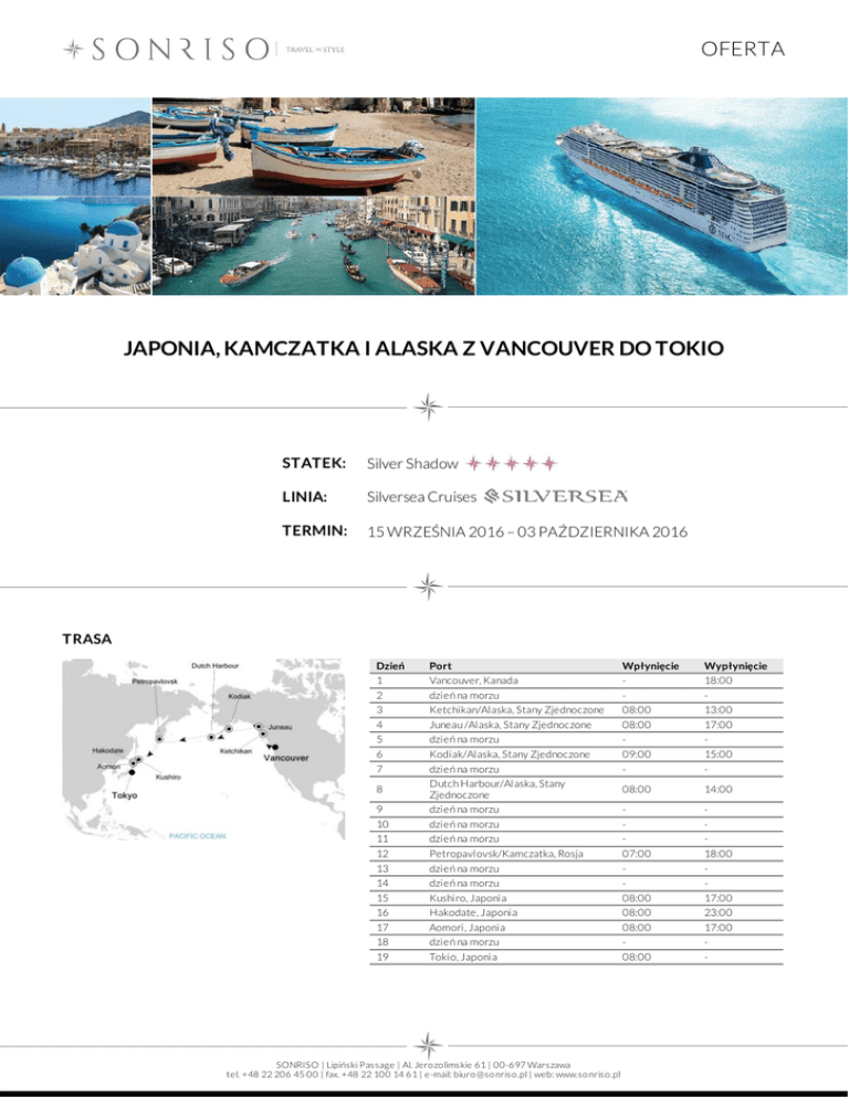 OFERTA JAPONIA, KAMCZATKA I ALASKA Z VANCOUVER DO TOKIO STATEK: Silver Shadow LINIA: Silversea Cruises TERMIN: 15 WRZEŚNIA 2016 – 03 PAŹDZIERNIKA 2016 TRASA Dzień 1 2 3 4 5 6 7 8 9 10 11 12 13 14 15 16 17 18 19 Port Vancouver, Kanada dzień na morzu Ketchikan/Alaska, Stany Zjednoczone Juneau /Alaska, Stany Zjednoczone dzień na morzu Kodiak/Alaska, Stany Zjednoczone dzień na morzu Dutch Harbour/Alaska, Stany Zjednoczone dzień na morzu dzień na morzu dzień na morzu Petropavlovsk/Kamczatka, Rosja dzień na morzu dzień na morzu Kushiro, Japonia Hakodate, Japonia Aomori, Japonia dzień na morzu Tokio, Japonia SONRISO | Lipiński Passage | Al. Jero zo limskie 61 | 00-697 Warszawa tel. +48 22 206 45 00 | fax. +48 22 100 14 61 | e-mail: biuro @so nriso .pl | web: www.so nriso .pl Wpłynięcie 08:00 08:00 09:00 - Wypłynięcie 18:00 13:00 17:00 15:00 - 08:00 14:00 07:00 08:00 08:00 08:00 08:00 18:00 17:00 23:00 17:00 - OFERTA CENA Typ kabiny Cena z osobę Vista Suite od 6 250 EUR Terrace Suite od 5 550 EUR Veranda suite od 5 050 EUR CENA ZAWIERA DOTATKOWE OPŁATY zakwaterowanie w 2 - os apartamencie wybranej kategorii pełne wyżywienie: 3 posiłki, przekąski między posiłakmi, bufet o północy open bar: wybrane wina i szampany, alkohole premium, różnorodne kawy i herbaty, wodę mineralną butelkowaną, napoje bezalkoholowe oraz soki dostępne w barach i restauracjach korzystanie z mini baru w apartamencie serwis bagażowy podczas wejścia i zejścia ze statku obsługa kamerdynerska 24 godzinny serwis kabinowy korzystanie z urządzeń sportowo - rekreacyjnych dostępnych na pokładzie (baseny, jacuzzi, boiska sportowe, itp.) udział we wszystkich imprezach organizowanych na pokładzie (przedstawienia, pokazy, aukcje, animacje i inne) opłatę serwisową (napiwki) dla obsługi statku transfer pomiędzy portem a miastem (uzależniony od lokalnych przepisów) obowiązkowe opłaty portowe dojazd/przelot do portu rozpoczęcia i zakończenia rejsu transfery (lotnisko - port - lotnisko) ewentualne noclegi przed lub po rejsie wycieczki fakultatywne korzystanie z usług typu: SPA, salon piękności, pralnia itp. wydatki osobiste tj. zakupy w butikach, internet, kasyno itp. obowiązkowe ubezpieczenie turystyczne koszt wymaganych wiz ewentualna opłata paliwowa (linia w momencie wzrotu cen ropy zastrzega sobie prawo do dodania oplaty paliwowej do każdej rezerwacji) Na życzenie świadczymy dodatkowo usługi: rezerwacje hotelowe na całym świecie rezerwacje biletów lotniczych, trasferów oraz parkingu w porcie rezerwacje wycieczek fakultatywnych i innych atrakcji SONRISO | Lipiński Passage | Al. Jero zo limskie 61 | 00-697 Warszawa tel. +48 22 206 45 00 | fax. +48 22 100 14 61 | e-mail: biuro @so nriso .pl | web: www.so nriso .pl