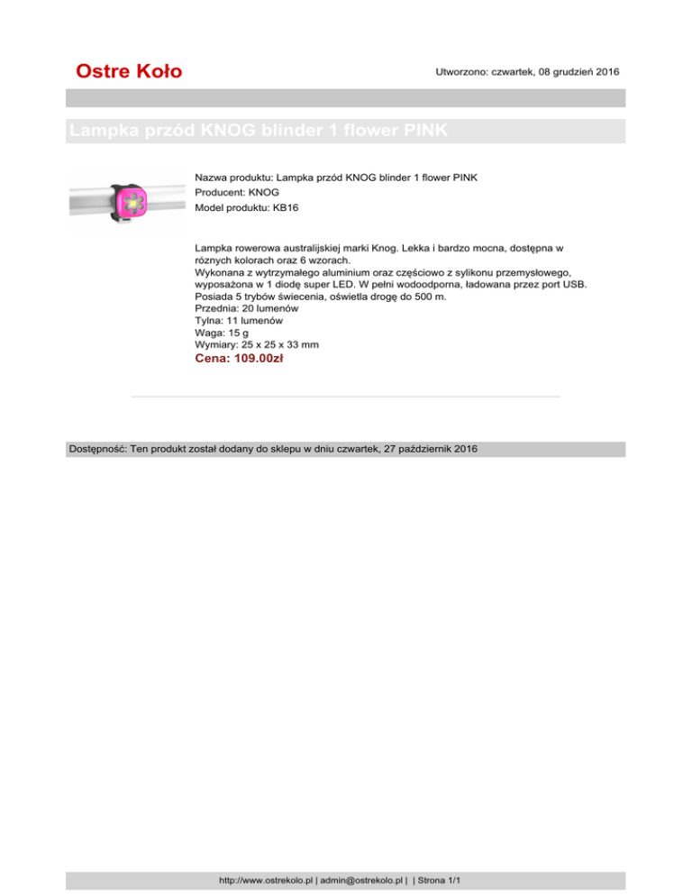 Ostre Koło Utworzono: czwartek, 08 grudzień 2016 Lampka przód KNOG blinder 1 flower PINK Nazwa produktu: Lampka przód KNOG blinder 1 flower PINK Producent: KNOG Model produktu: KB16 Lampka rowerowa australijskiej marki Knog. Lekka i bardzo mocna, dostępna w róznych kolorach oraz 6 wzorach. Wykonana z wytrzymałego aluminium oraz częściowo z sylikonu przemysłowego, wyposażona w 1 diodę super LED. W pełni wodoodporna, ładowana przez port USB. Posiada 5 trybów świecenia, oświetla drogę do 500 m. Przednia: 20 lumenów Tylna: 11 lumenów Waga: 15 g Wymiary: 25 x 25 x 33 mm Cena: 109.00zł Dostępność: Ten produkt został dodany do sklepu w dniu czwartek, 27 październik 2016 http://www.ostrekolo.pl | [email protected] | | Strona 1/1