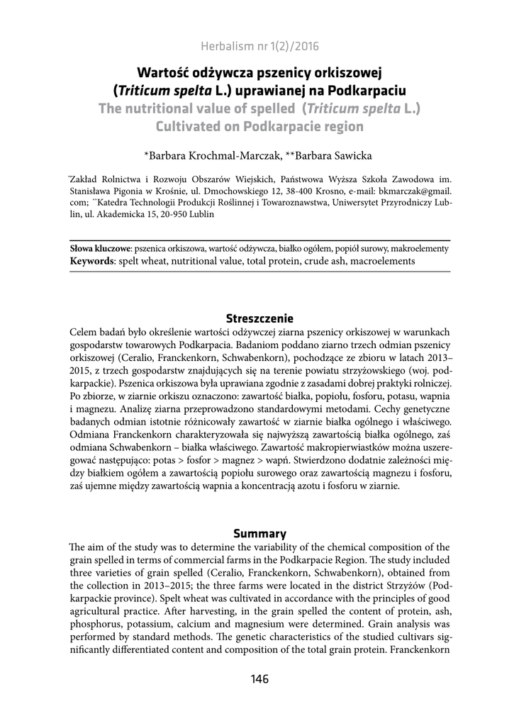 Herbalism nr 1(2)/2016 Wartość odżywcza pszenicy orkiszowej (Triticum spelta L.) uprawianej na Podkarpaciu The nutritional value of spelled (Triticum spelta L.) Cultivated on Podkarpacie region *Barbara Krochmal-Marczak, **Barbara Sawicka Zakład Rolnictwa i Rozwoju Obszarów Wiejskich, Państwowa Wyższa Szkoła Zawodowa im. Stanisława Pigonia w Krośnie, ul. Dmochowskiego 12, 38-400 Krosno, e-mail: bkmarczak@gmail. com; **Katedra Technologii Produkcji Roślinnej i Towaroznawstwa, Uniwersytet Przyrodniczy Lublin, ul. Akademicka 15, 20-950 Lublin * Słowa kluczowe: pszenica orkiszowa, wartość odżywcza, białko ogółem, popiół surowy, makroelementy Keywords: spelt wheat, nutritional value, total protein, crude ash, macroelements Streszczenie Celem badań było określenie wartości odżywczej ziarna pszenicy orkiszowej w warunkach gospodarstw towarowych Podkarpacia. Badaniom poddano ziarno trzech odmian pszenicy orkiszowej (Ceralio, Franckenkorn, Schwabenkorn), pochodzące ze zbioru w latach 2013– 2015, z trzech gospodarstw znajdujących się na terenie powiatu strzyżowskiego (woj. podkarpackie). Pszenica orkiszowa była uprawiana zgodnie z zasadami dobrej praktyki rolniczej. Po zbiorze, w ziarnie orkiszu oznaczono: zawartość białka, popiołu, fosforu, potasu, wapnia i magnezu. Analizę ziarna przeprowadzono standardowymi metodami. Cechy genetyczne badanych odmian istotnie różnicowały zawartość w ziarnie białka ogólnego i właściwego. Odmiana Franckenkorn charakteryzowała się najwyższą zawartością białka ogólnego, zaś odmiana Schwabenkorn – białka właściwego. Zawartość makropierwiastków można uszeregować następująco: potas > fosfor > magnez > wapń. Stwierdzono dodatnie zależności między białkiem ogółem a zawartością popiołu surowego oraz zawartością magnezu i fosforu, zaś ujemne między zawartością wapnia a koncentracją azotu i fosforu w ziarnie. Summary The aim of the study was to determine the variability of the chemical composition of the grain spelled in terms of commercial farms in the Podkarpacie Region. The study included three varieties of grain spelled (Ceralio, Franckenkorn, Schwabenkorn), obtained from the collection in 2013–2015; the three farms were located in the district Strzyżów (Podkarpackie province). Spelt wheat was cultivated in accordance with the principles of good agricultural practice. After harvesting, in the grain spelled the content of protein, ash, phosphorus, potassium, calcium and magnesium were determined. Grain analysis was performed by standard methods. The genetic characteristics of the studied cultivars significantly differentiated content and composition of the total grain protein. Franckenkorn 146 Wartość odżywcza pszenicy orkiszowej... variety is characterized by the highest content of total protein. The content of macroelements can be ranked as follows: potassium> phosphate> magnesium> calcium. Positive relationships between total protein and content of the raw ash as well as the content of magnesium and phosphorus were found and negative relationships between calcium content and the concentration of nitrogen and phosphorus in the grain. 147