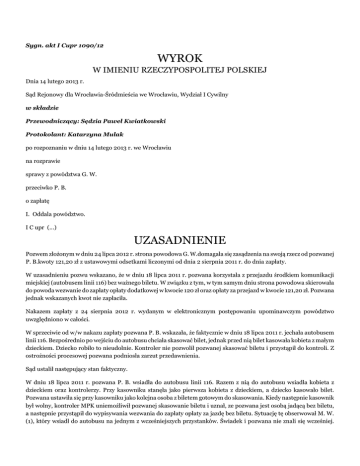 Sygn. akt I Cupr 1090/12 WYROK W IMIENIU RZECZYPOSPOLITEJ POLSKIEJ Dnia 14 lutego 2013 r. Sąd Rejonowy dla Wrocławia-Śródmieścia we Wrocławiu, Wydział I Cywilny w składzie Przewodniczący: Sędzia Paweł Kwiatkowski Protokolant: Katarzyna Mulak po rozpoznaniu w dniu 14 lutego 2013 r. we Wrocławiu na rozprawie sprawy z powództwa G. W. przeciwko P. B. o zapłatę I. Oddala powództwo. I C upr (...) UZASADNIENIE Pozwem złożonym w dniu 24 lipca 2012 r. strona powodowa G. W.domagała się zasądzenia na swoją rzecz od pozwanej P. B.kwoty 121,20 zł z ustawowymi odsetkami liczonymi od dnia 2 sierpnia 2011 r. do dnia zapłaty. W uzasadnieniu pozwu wskazano, że w dniu 18 lipca 2011 r. pozwana korzystała z przejazdu środkiem komunikacji miejskiej (autobusem linii 116) bez ważnego biletu. W związku z tym, w tym samym dniu strona powodowa skierowała do powoda wezwanie do zapłaty opłaty dodatkowej w kwocie 120 zł oraz opłaty za przejazd w kwocie 121,20 zł. Pozwana jednak wskazanych kwot nie zapłaciła. Nakazem zapłaty z 24 sierpnia 2012 r. wydanym w elektronicznym postępowaniu upominawczym powództwo uwzględniono w całości. W sprzeciwie od w/w nakazu zapłaty pozwana P. B. wskazała, że faktycznie w dniu 18 lipca 2011 r. jechała autobusem linii 116. Bezpośrednio po wejściu do autobusu chciała skasować bilet, jednak przed nią bilet kasowała kobieta z małym dzieckiem. Dziecko robiło to nieudolnie. Kontroler nie pozwolił pozwanej skasować biletu i przystąpił do kontroli. Z ostrożności procesowej pozwana podniosła zarzut przedawnienia. Sąd ustalił następujący stan faktyczny. W dniu 18 lipca 2011 r. pozwana P. B. wsiadła do autobusu linii 116. Razem z nią do autobusu wsiadła kobieta z dzieckiem oraz kontrolerzy. Przy kasowniku stanęła jako pierwsza kobieta z dzieckiem, a dziecko kasowało bilet. Pozwana ustawiła się przy kasowniku jako kolejna osoba z biletem gotowym do skasowania. Kiedy następnie kasownik był wolny, kontroler MPK uniemożliwił pozwanej skasowanie biletu i uznał, ze pozwana jest osobą jadącą bez biletu, a następnie przystąpił do wypisywania wezwania do zapłaty opłaty za jazdę bez biletu. Sytuację tę obserwował M. W. (1), który wsiadł do autobusu na jednym z wcześniejszych przystanków. Świadek i pozwana nie znali się wcześniej. Po wypisaniu wezwania do zapłaty na pętli autobusu na pl. (...) świadek podszedł do pozwanej i zaproponował, żeby sprawę oddać do sądu. (dowód: zeznania M. W. – k. 58, przesłuchanie pozwanej – k. 44) Usługi lokalnego transportu zbiorowego tramwajem, którym jechał pozwany, świadczy strona powodowa – G.W.. (bezsporne) Wysokość ulgowej opłaty za przejazd w/w tramwajem wynosiła 1,20 zł. (fakt znany Sądowi z urzędu) Wysokość opłaty dodatkowej za jazdę bez ważnego biletu wynosiła 120 zł. (fakt znany Sądowi z urzędu) W dniu 18 lipca 2011 r., po ujawnieniu faktu jazdy bez biletu, strona powodowa skierowała do pozwanej wezwanie do zapłaty. (dowód: wezwanie z 18.07.2011 r. – k. 25) Pozwana skierowała do strony powodowej odwołanie z 30 lipca 2011 r., w którym opisała przebieg zdarzenia, wskazując, że oczekiwała na skasowanie biletu po kobiecie z dzieckiem, a kontroler uniemożliwił jej skasowanie tego biletu, na które otrzymała odpowiedź odmowna w dniu 22 sierpnia 2011 r. (dowód: pismo z 30.07.2011 r. – k. 40-41, pismo z 18.08.2011 r. –k. 53) Mając powyższe na uwadze, Sąd zważył, co następuje. Powództwo nie zasługiwało na uwzględnienie. W rozpoznawanej sprawie nie ulegało wątpliwości, że pozwana korzystała z usługi lokalnego transportu zbiorowego świadczonej przez G. W.. Zawarcie umowy nastąpiło stosownie do art. 16 ustawy – prawo przewozowe przez zajęcie miejsca w środku transportu. Sąd uznał jednak za wiarygodne zeznania świadka M. W. i pozwanej, w których osoby te w podobny sposób opisały przebieg zdarzenia z udziałem pozwanej. Z obu wersji, a także odwołania powódki skierowanego do strony powodowej bezpośrednio po zdarzeniu wynikało, że pozwana zamierzała bezpośrednio po wejściu do autobusu skasować bilet i oczekiwała przy kasowniku na jego zwolnienie przez innego pasażera. Wobec tego kontroler biletów błędnie uznał ją za osobę podróżującą bez biletu. Jest oczywistym, że pasażer nie może skasować biletu w tym samym momencie, w którym wsiada do autobusu, a także, że dwóch pasażerów nie może skasować biletu w tym samym kasowniku równocześnie. Świadek M. W. był dla pozwanej osoba obcą, nie widział jej nigdy wcześniej, wobec czego nie było podstaw do uznania, że składał on fałszywe, uzgodnione wcześniej z pozwaną zeznania. Dodatkowo wskazać należy, ze pozwana już w lipcu 2011 r. informowała stronę powodową, że zdarzenie obserwowała osoba trzecia. Wykluczyć więc należy zgłoszenie świadka dopiero w związku z procesem. Strona powodowa nie zaproponowała też żadnego dowodu w celu podważenia wiarygodności zeznań w/w świadka, w szczególności nie proponując dowodu z zeznań kontrolera kontrolującego pozwaną. Nie odniosła się także w żaden sposób do zeznań w/w świadka. Wobec powyższego stwierdzić należało, że pozwaną błędnie uznano za osobę jadącą bez biletu, a skasowanie tegoż zostało uniemożliwione wyłącznie przez osobę działającą w imieniu powoda Wobec powyższego powództwo oddalono, jak w sentencji wyroku.