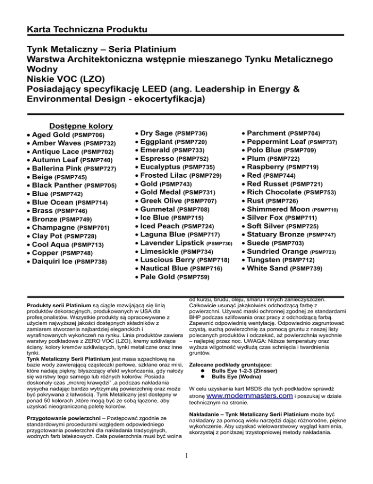 Karta Techniczna Produktu Tynk Metaliczny – Seria Platinium Warstwa Architektoniczna wstępnie mieszanego Tynku Metalicznego Wodny Niskie VOC (LZO) Posiadający specyfikację LEED (ang. Leadership in Energy & Environmental Design - ekocertyfikacja) Dostępne kolory Aged Gold (PSMP706) Amber Waves (PSMP732) Antique Lace (PSMP702) Autumn Leaf (PSMP740) Ballerina Pink (PSMP727) Beige (PSMP745) Black Panther (PSMP705) Blue (PSMP742) Blue Ocean (PSMP714) Brass (PSMP746) Bronze (PSMP749) Champagne (PSMP701) Clay Pot (PSMP728) Cool Aqua (PSMP713) Copper (PSMP748) Daiquiri Ice (PSMP738) Dry Sage (PSMP736) Eggplant (PSMP720) Emerald (PSMP733) Espresso (PSMP752) Eucalyptus (PSMP735) Frosted Lilac (PSMP729) Gold (PSMP743) Gold Medal (PSMP731) Greek Olive (PSMP707) Gunmetal (PSMP708) Ice Blue (PSMP715) Iced Peach (PSMP724) Laguna Blue (PSMP717) Lavender Lipstick (PSMP730) Limesickle (PSMP734) Luscious Berry (PSMP718) Nautical Blue (PSMP716) Pale Gold (PSMP759) Parchment (PSMP704) Peppermint Leaf (PSMP737) Polo Blue (PSMP709) Plum (PSMP722) Raspberry (PSMP719) Red (PSMP744) Red Russet (PSMP721) Rich Chocolate (PSMP753) Rust (PSMP726) Shimmered Moon (PSMP710) Silver Fox (PSMP711) Soft Silver (PSMP725) Statuary Bronze (PSMP747) Suede (PSMP703) Sundried Orange (PSMP723) Tungsten (PSMP712) White Sand (PSMP739) od kurzu, brudu, oleju, smaru i innych zanieczyszczeń. Całkowicie usunąć jakąkolwiek odchodzącą farbę z powierzchni. Używać maski ochronnej zgodnej ze standardami BHP podczas szlifowania oraz pracy z odchodzącą farbą. Zapewnić odpowiednią wentylację. Odpowiednio zagruntować czystą, suchą powierzchnię za pomocą gruntu z naszej listy polecanych produktów i odczekać, aż powierzchnia wyschnie – najlepiej przez noc. UWAGA: Niższe temperatury oraz wyższa wilgotność wydłużą czas schnięcia i twardnienia gruntów. Produkty serii Platinium są ciągle rozwijającą się linią produktów dekoracyjnych, produkowanych w USA dla profesjonalistów. Wszystkie produkty są opracowywane z użyciem najwyższej jakości dostępnych składników z zamiarem stworzenia najbardziej eleganckich i wyrafinowanych wykończeń na rynku. Linia produktów zawiera warstwy podkładowe z ZERO VOC (LZO), kremy szkliwiące ściany, kolory kremów szkliwiących, tynki metaliczne oraz inne tynki. Tynk Metaliczny Serii Platinium jest masa szpachlową na bazie wody zawierającą cząsteczki perłowe, szklane oraz miki, które nadają piękny, błyszczący efekt wykończenia, gdy nałoży się warstwy tego samego lub różnych kolorów. Posiada doskonały czas „mokrej krawędzi” ,a podczas nakładania wysycha nadając bardzo wytrzymałą powierzchnię oraz może być pokrywana z łatwością. Tynk Metaliczny jest dostępny w ponad 50 kolorach ,które mogą być ze sobą łączone, aby uzyskać nieograniczoną paletę kolorów. Zalecane podkłady gruntujące: Bulls Eye 1-2-3 (Zinsser) Bulls Eye (Wodna) W celu uzyskania kart MSDS dla tych podkładów sprawdź stronę www.modernmasters.com i poszukaj w dziale technicznym na stronie. Nakładanie – Tynk Metaliczny Serii Platinium może być nakładany za pomocą wielu narzędzi dając różnorodne, piękne wykończenie. Aby uzyskać wielowarstwowy wygląd kamienia, skorzystaj z poniższej trzystopniowej metody nakładania. Przygotowanie powierzchni – Postępować zgodnie ze standardowymi procedurami względem odpowiedniego przygotowania powierzchni dla nakładania tradycyjnych, wodnych farb lateksowych. Cała powierzchnia musi być wolna 1 wentylowanym miejscu. Unikać kontaktu z oczami. Po użyciu umyć dokładnie ręce wodą z mydłem. Nie połykać. Podczas natryskiwania lub szlifowania zakładać maskę ochronną zgodną ze standardami BHP – używać zgodnie z zaleceniami producenta sprzętu. UWAGA! Podczas zdzierania, szlifowania lub usuwania starej farby, do atmosfery może się przedostać pył ołowiany. OŁÓW JEST TOKSYCZNY. WYSTAWIENIE SIĘ NA DZIAŁANIE PYŁU OŁOWIANEGO MOŻE PROWADZIĆ DO POWSTANIA POWAŻNYCH CHORÓB, TAKICH JAK USZKODZENIE MÓŻGU, ZWŁASZCZA U DZIECI LUB KOBIET W CIĄŻY. Zakładać maski chroniące drogi oddechowe zgodne ze standardami BHP aby uniknąć narażenia na ołów. Wyczyścić pomieszczenie za pomocą odkurzacza z filtrem HEPA oraz mokrym mopem. Krok 1 – Warstwa bazowa Za pomocą kielni ze stali nierdzewnej nałożyć cienką, równą warstwę Tynku Metalicznego o bazowym kolorze na całą powierzchnię, szerokimi, zamaszystymi ruchami, pewnie dociskając. Odczekać, aż produkt wyschnie – około 1 godzinę. Krok 2 – Warstwa strukturalna Nałożyć niewielką ilość koloru bazowego na tackę malarską. Zamoczyć mały wałek gąbkowy i wycisnąć nadmiar wody. Pracować na fragmentach powierzchni. Lekko zanurzyć wałek w kolorze bazowym i malować powierzchnię w różnych kierunkach zakrywając około 75% powierzchni danego, malowanego fragmentu. Podczas gdy produkt jest nadal mokry użyć kielni aby „strącić” wierzchołki przecierając delikatnie powierzchnię, trzymając kielnię pod bardzo małym kątem (25-30 stopni). Powierzchnia będzie miała w tym momencie strukturę wklęsłych i wypukłych miejsc. Odczekać aż produkt wyschnie całkowicie – około 2-3 godziny. Kontakt ze skórą: Dokładnie umyć ciepłą wodą z mydłem zanim warstwa zaschnie. Osoby z wrażliwą skórą powinny zakładać rękawice ochronne. Kontakt z oczami: Płukać wodą przez co najmniej 15 minut. Udać się do lekarza. Krok 3 – Warstwa wierzchnia Nałożyć warstwę wierzchnią Tynku Metalicznego w innym kolorze lub jaśniejszym odcieniu. Im większy kontrast kolorów lub odcieni tym bardziej radykalny efekt. Pracować na fragmentach powierzchni. Nabrać produkt na kielnię i pewnie dociskając nałożyć warstwę wierzchnią na powierzchnię ciągnąc do siebie, wykonując ruch w kształcie łuku – około 20cm. Wyrównać brzegi każdego fragmentu za pomocą wałka gąbkowego zanurzonego w Tynku Met