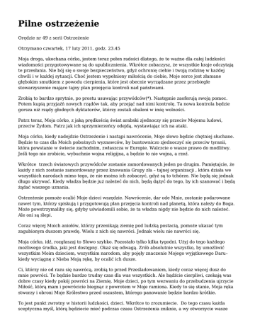 Pilne ostrzeżenie Orędzie nr 49 z serii Ostrzeżenie Otrzymano czwartek, 17 luty 2011, godz. 23.45 Moja droga, ukochana córko, jestem teraz pełen radości dlatego, że te ważne dla całej ludzkości wiadomości przygotowywane są do upublicznienia. Wkrótce zobaczysz, że wszystkie kraje odczytają te przesłania. Nie bój się o swoje bezpieczeństwo, gdyż ochronię ciebie i twoją rodzinę w każdej chwili i w każdej sytuacji. Choć jestem wypełniony miłością do ciebie, Moje serce jest złamane głębokim smutkiem z powodu cierpienia, które jest obecnie wyrządzane przez przebiegłe stowarzyszenie mające tajny plan przejęcia kontroli nad państwami. Zrobią to bardzo sprytnie, po prostu usuwając przywódców(*). Następnie zaoferują swoją pomoc. Potem kupią przyjaźń nowych rządów tak, aby przejąć nad nimi kontrolę. Ta nowa kontrola będzie gorsza niż rządy głodnych dyktatorów, którzy zostali obaleni w imię wolności. Patrz teraz, Moja córko, z jaką prędkością świat arabski zjednoczy się przeciw Mojemu ludowi, przeciw Żydom. Patrz jak ich sprzymierzeńcy odejdą, wystawiając ich na ataki. Moja córko, kiedy nadejdzie Ostrzeżenie i nastąpi nawrócenie, Moje słowo będzie chętniej słuchane. Będzie to czas dla Moich pobożnych wyznawców, by buntowniczo zjednoczyć się przeciw tyranii, która powstanie w świecie zachodnim, zwłaszcza w Europie. Walczcie o wasze prawo do modlitwy. Jeśli tego nie zrobicie, wybuchnie wojna religijna, a będzie to nie wojna, a rzeź. Wkrótce trzech światowych przywódców zostanie zamordowanych jeden po drugim. Pamiętajcie, że każdy z nich zostanie zamordowany przez knowania Grupy zła – tajnej organizacji , która działa we wszystkich narodach mimo tego, że nie można ich zobaczyć, gdyż są to tchórze. Nie będą się jednak długo ukrywać. Kiedy władza będzie już należeć do nich, będą dążyć do tego, by ich szanować i będą żądać waszego uznania. Ostrzeżenie pomoże ocalić Moje dzieci wszędzie. Nawrócenie, dar ode Mnie, zostanie podarowane nawet tym, którzy spiskują i przygotowują plan przejęcia kontroli nad planetą, która należy do Boga. Może powstrzymaliby się, gdyby uświadomili sobie, że ta władza nigdy nie będzie do nich należeć. Ale oni są ślepi. Coraz więcej Moich aniołów, którzy przenikają ziemię pod ludzką postacią, pomoże ukazać tym zagubionym duszom prawdę. Wielu z nich się nawróci. Jednak wielu nie nawróci się. Moja córko, idź, rozgłaszaj to Słowo szybko. Pozostało tylko kilka tygodni. Użyj do tego każdego możliwego środka, jaki jest dostępny. Okaż się odwagą. Zrób absolutnie wszystko, by umożliwić wszystkim Moim dzieciom, wszystkim narodom, aby pojęły znaczenie Mojego wyjątkowego Daru– kiedy wyciągnę z Nieba Moją rękę, by ocalić ich dusze. Ci, którzy nie od razu się nawrócą, zrobią to przed Prześladowaniem, kiedy coraz więcej dusz do mnie powróci. To będzie bardzo trudny czas dla was wszystkich. Ale bądźcie cierpliwi, czekają was dobre czasy kiedy pokój powróci na Ziemię. Moje dzieci, po tym wezwaniu do przebudzenia ujrzycie Miłość, którą mam i powrócicie biegnąc z powrotem w Moje ramiona. Kiedy to się stanie, Moja ręka stworzy i obroni Moje Królestwo przed oszustem, którego panowanie będzie bardzo krótkie. To jest punkt zwrotny w historii ludzkości, dzieci. Wkrótce to zrozumiecie. Do tego czasu każda sceptyczna myśl, którą będziecie mieć podczas czasu Ostrzeżenia zniknie, a wy otworzycie wasze serca na Prawdę. A teraz idź Moja córko w Pokoju i Miłości dla całej ludzkości. Jezus Chrystus Król Żydów Uwaga (*) Wizjonerka chciałaby dać światu jasno do zrozumienia, że powodem dla którego nie może zamieścić imion przywódców, dwóch ze świata arabskiego i jednego z Europy kontynentalnej, jest szacunek dla ich rodzin i uniknięcie ich nadmiernej udręki. Jednakże, dała je do wiadomości pewnej liczbie duchownych i mediów przekazu, z zastrzeżeniem gotowości do publikacji krótko po tym, gdy tylko zabójstwa będą miały miejsce (wszystkie w niedługim odstępie czasu od siebie).