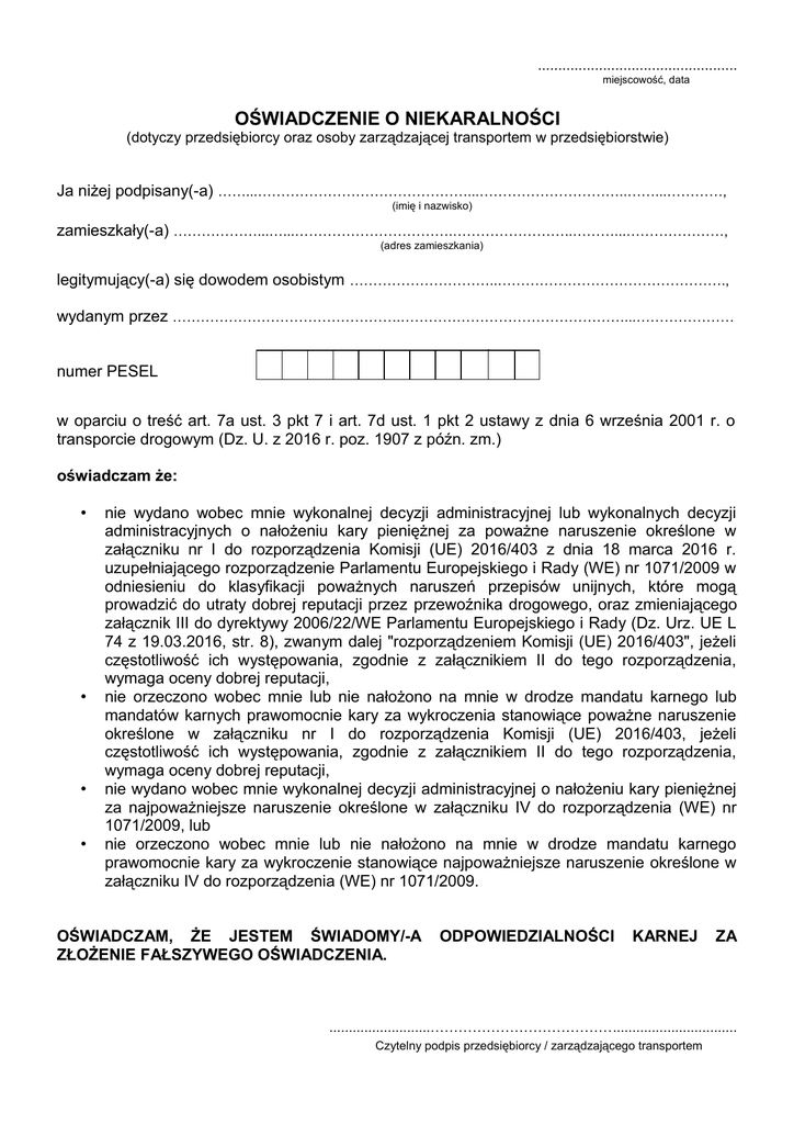 ................................................. miejscowość, data OŚWIADCZENIE O NIEKARALNOŚCI (dotyczy przedsiębiorcy oraz osoby zarządzającej transportem w przedsiębiorstwie) Ja niżej podpisany(-a) ……...………………………………………...…………………………..……...…………, (imię i nazwisko) zamieszkały(-a) ………………...…...…………………………….……………………..………...…………………, (adres zamieszkania) legitymujący(-a) się dowodem osobistym …………………………..…………………………………………., wydanym przez ………………………………………….…………………………………………...………………… numer PESEL w oparciu o treść art. 7a ust. 3 pkt 7 i art. 7d ust. 1 pkt 2 ustawy z dnia 6 września 2001 r. o transporcie drogowym (Dz. U. z 2016 r. poz. 1907 z późn. zm.) oświadczam że: • • • • nie wydano wobec mnie wykonalnej decyzji administracyjnej lub wykonalnych decyzji administracyjnych o nałożeniu kary pieniężnej za poważne naruszenie określone w załączniku nr I do rozporządzenia Komisji (UE) 2016/403 z dnia 18 marca 2016 r. uzupełniającego rozporządzenie Parlamentu Europejskiego i Rady (WE) nr 1071/2009 w odniesieniu do klasyfikacji poważnych naruszeń przepisów unijnych, które mogą prowadzić do utraty dobrej reputacji przez przewoźnika drogowego, oraz zmieniającego załącznik III do dyrektywy 2006/22/WE Parlamentu Europejskiego i Rady (Dz. Urz. UE L 74 z 19.03.2016, str. 8), zwanym dalej "rozporządzeniem Komisji (UE) 2016/403", jeżeli częstotliwość ich występowania, zgodnie z załącznikiem II do tego rozporządzenia, wymaga oceny dobrej reputacji, nie orzeczono wobec mnie lub nie nałożono na mnie w drodze mandatu karnego lub mandatów karnych prawomocnie kary za wykroczenia stanowiące poważne naruszenie określone w załączniku nr I do rozporządzenia Komisji (UE) 2016/403, jeżeli częstotliwość ich występowania, zgodnie z załącznikiem II do tego rozporządzenia, wymaga oceny dobrej reputacji, nie wydano wobec mnie wykonalnej decyzji administracyjnej o nałożeniu kary pieniężnej za najpoważniejsze naruszenie określone w załączniku IV do rozporządzenia (WE) nr 1071/2009, lub nie orzeczono wobec mnie lub nie nałożono na mnie w drodze mandatu karnego prawomocnie kary za wykroczenie stanowiące najpoważniejsze naruszenie określone w załączniku IV do rozporządzenia (WE) nr 1071/2009. OŚWIADCZAM, ŻE JESTEM ŚWIADOMY/-A ZŁOŻENIE FAŁSZYWEGO OŚWIADCZENIA. ODPOWIEDZIALNOŚCI KARNEJ ZA ..........................…………………………………................................ Czytelny podpis przedsiębiorcy / zarządzającego transportem