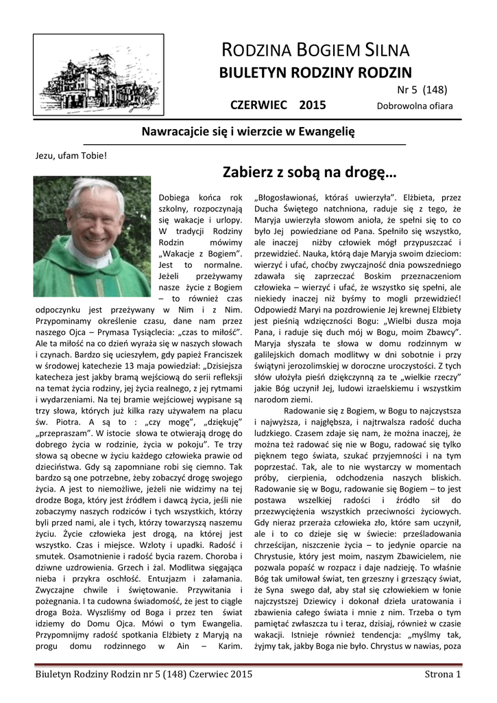 RODZINA BOGIEM SILNA BIULETYN RODZINY RODZIN Nr 5 (148) CZERWIEC 2015 Dobrowolna ofiara Nawracajcie się i wierzcie w Ewangelię Jezu, ufam Tobie! Zabierz z sobą na drogę… Dobiega końca rok szkolny, rozpoczynają się wakacje i urlopy. W tradycji Rodziny Rodzin mówimy „Wakacje z Bogiem”. Jest to normalne. Jeżeli przeżywamy nasze życie z Bogiem – to również czas odpoczynku jest przeżywany w Nim i z Nim. Przypominamy określenie czasu, dane nam przez naszego Ojca – Prymasa Tysiąclecia: „czas to miłość”. Ale ta miłość na co dzień wyraża się w naszych słowach i czynach. Bardzo się ucieszyłem, gdy papież Franciszek w środowej katechezie 13 maja powiedział: „Dzisiejsza katecheza jest jakby bramą wejściową do serii refleksji na temat życia rodziny, jej życia realnego, z jej rytmami i wydarzeniami. Na tej bramie wejściowej wypisane są trzy słowa, których już kilka razy używałem na placu św. Piotra. A są to : „czy mogę”, „dziękuję” „przepraszam”. W istocie słowa te otwierają drogę do dobrego życia w rodzinie, życia w pokoju”. Te trzy słowa są obecne w życiu każdego człowieka prawie od dzieciństwa. Gdy są zapomniane robi się ciemno. Tak bardzo są one potrzebne, żeby zobaczyć drogę swojego życia. A jest to niemożliwe, jeżeli nie widzimy na tej drodze Boga, który jest źródłem i dawcą życia, jeśli nie zobaczymy naszych rodziców i tych wszystkich, którzy byli przed nami, ale i tych, którzy towarzyszą naszemu życiu. Życie człowieka jest drogą, na której jest wszystko. Czas i miejsce. Wzloty i upadki. Radość i smutek. Osamotnienie i radość bycia razem. Choroba i dziwne uzdrowienia. Grzech i żal. Modlitwa sięgająca nieba i przykra oschłość. Entuzjazm i załamania. Zwyczajne chwile i świętowanie. Przywitania i pożegnania. I ta cudowna świadomość, że jest to ciągle droga Boża. Wyszliśmy od Boga i przez ten świat idziemy do Domu Ojca. Mówi o tym Ewangelia. Przypomnijmy radość spotkania Elżbiety z Maryją na progu domu rodzinnego w Ain – Karim. Biuletyn Rodziny Rodzin nr 5 (148) Czerwiec 2015 „Błogosławionaś, któraś uwierzyła”. Elżbieta, przez Ducha Świętego natchniona, raduje się z tego, że Maryja uwierzyła słowom anioła, że spełni się to co było Jej powiedziane od Pana. Spełniło się wszystko, ale inaczej niżby człowiek mógł przypuszczać i przewidzieć. Nauka, którą daje Maryja swoim dzieciom: wierzyć i ufać, choćby zwyczajność dnia powszedniego zdawała się zaprzeczać Boskim przeznaczeniom człowieka – wierzyć i ufać, że wszystko się spełni, ale niekiedy inaczej niż byśmy to mogli przewidzieć! Odpowiedź Maryi na pozdrowienie Jej krewnej Elżbiety jest pieśnią wdzięczności Bogu: „Wielbi dusza moja Pana, i raduje się duch mój w Bogu, moim Zbawcy”. Maryja słyszała te słowa w domu rodzinnym w galilejskich domach modlitwy w dni sobotnie i przy świątyni jerozolimskiej w doroczne uroczystości. Z tych słów ułożyła pieśń dziękczynną za te „wielkie rzeczy” jakie Bóg uczynił Jej, ludowi izraelskiemu i wszystkim narodom ziemi. Radowanie się z Bogiem, w Bogu to najczystsza i najwyższa, i najgłębsza, i najtrwalsza radość ducha ludzkiego. Czasem zdaje się nam, że można inaczej, że można też radować się nie w Bogu, radować się tylko pięknem tego świata, szukać przyjemności i na tym poprzestać. Tak, ale to nie wystarczy w momentach próby, cierpienia, odchodzenia naszych bliskich. Radowanie się w Bogu, radowanie się Bogiem – to jest postawa wszelkiej radości i źródło sił do przezwyciężenia wszystkich przeciwności życiowych. Gdy nieraz przeraża człowieka zło, które sam uczynił, ale i to co dzieje się w świecie: prześladowania chrześcijan, niszczenie życia – to jedynie oparcie na Chrystusie, który jest moim, naszym Zbawicielem, nie pozwala popaść w rozpacz i daje nadzieję. To właśnie Bóg tak umiłował świat, ten grzeszny i grzeszący świat, że Syna swego dał, aby stał się człowiekiem w łonie najczystszej Dziewicy i dokonał dzieła uratowania i zbawienia całego świata i mnie z nim. Trzeba o tym pamiętać zwłaszcza tu i teraz, dzisiaj, również w czasie wakacji. Istnieje również tendencja: „myślmy tak, żyjmy tak, jakby Boga nie było. Chrystus w nawias, poza Strona 1 nawias”. Nie możemy zapominać o tych „wielkich rzeczach, które Bóg nam uczynił”. Wśród tych wielkich rzeczy to przede wszystkim życie, życie Boże, które będzie trwało zawsze przez całą wieczność. Wszystkie inne „wielkie rzeczy”, które nam Pan uczynił, wynikają z tego źródła miłości, o której trzeba pamiętać: gdy patrzymy na ciemny las, złote kłosy zboża, łąki kolorowe kwiatami, gdy widzimy jak rolnik się trudzi, gdy spoglądamy w niebo pełne gwiazd, w oczy dziecka, gdy pytamy najbliższą osobę: „w czym mogę ci pomóc – teraz ty odpocznij, a ja pozmywam naczynia po obiedzie”. Nie ma małych rzeczy, wszystkie są „wielkie” gdy wkładamy w nie miłość, w to co czynimy. Bogu chwała! Wtedy życie nasze będzie radością i błogosławieństwem dla tych z którymi żyjemy i do których idziemy. „Odtąd błogosławioną zwać mnie będą wszystkie narody” i wszystkie ludzkie pokolenia. Ileż piękna, ileż dzieł sztuki, kościołów i przydrożnych kapliczek, znaków Bożej Męki – możemy zobaczyć w miejscach gdzie będziemy spędzać czas. Ileż pieśni i hymnów ułożonych na cześć Boga, Jego Matki i świętych możemy wyśpiewać w czasie wakacji. Na czas odpoczynku potrzebna jest też wyobraźnia i plan, żeby nie zmarnować czasu, i nie wrócić zmęczonym. Niech w tym czasie odpocznie komputer, telewizja, radio, żeby usłyszeć śpiew ptaków i ciszę zachodzącego słońca. Niech płynie wieczorna modlitwa, wspólne podziękowanie Bogu i sobie za przeżyty dzień. Jest wpisane w tradycję naszych rodzin, R