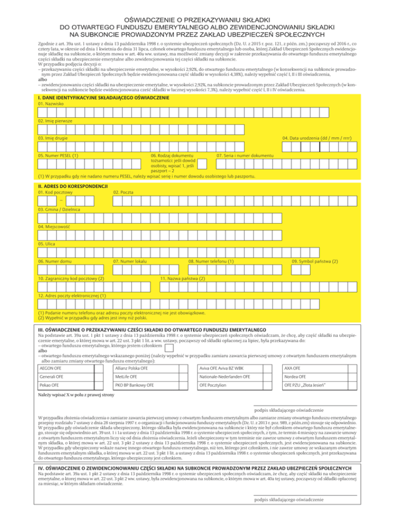 OŚWIADCZENIE O PRZEKAZYWANIU SKŁADKI DO OTWARTEGO FUNDUSZU EMERYTALNEGO ALBO ZEWIDENCJONOWANIU SKŁADKI NA SUBKONCIE PROWADZONYM PRZEZ ZAKŁAD UBEZPIECZEŃ SPOŁECZNYCH Zgodnie z art. 39a ust. 1 ustawy z dnia 13 października 1998 r. o systemie ubezpieczeń społecznych (Dz. U. z 2015 r. poz. 121, z późn. zm.) począwszy od 2016 r., co cztery lata, w okresie od dnia 1 kwietnia do dnia 31 lipca, członek otwartego funduszu emerytalnego lub osoba, której Zakład Ubezpieczeń Społecznych ewidencjonuje składkę na subkoncie, o którym mowa w art. 40a ww. ustawy, ma możliwość zmiany decyzji w zakresie przekazywania do otwartego funduszu emerytalnego części składki na ubezpieczenie emerytalne albo zewidencjonowania tej części składki na subkoncie. W przypadku podjęcia decyzji o: – przekazywaniu części składki na ubezpieczenie emerytalne, w wysokości 2,92%, do otwartego funduszu emerytalnego (w konsekwencji na subkoncie prowadzonym przez Zakład Ubezpieczń Społecznych będzie ewidencjonowana część składki w wysokości 4,38%), należy wypełnić część I, II i III oświadczenia, albo – zewidencjonowaniu części składki na ubezpieczenie emerytalne, w wysokości 2,92%, na subkoncie prowadzonym przez Zakład Ubezpieczeń Społecznych (w konsekwencji na subkoncie będzie ewidencjonowana cześć składki w łacznej wysokości 7,3%), należy wypełnić część I, II i IV oświadczenia. I. DANE IDENTYFIKACYJNE SKŁADAJĄCEGO OŚWIADCZENIE 01. Nazwisko 02. Imię pierwsze 03. Imię drugie 04. Data urodzenia (dd / mm / rrrr) 05. Numer PESEL (1) 06. Rodzaj dokumentu 07. Seria i numer dokumentu tożsamości: jeśli dowód osobisty, wpisać 1, jeśli paszport – 2 (1) W przypadku gdy nie nadano numeru PESEL, należy wpisać serię i numer dowodu osobistego lub paszportu. II. ADRES DO KORESPONDENCJI 01. Kod pocztowy 02. Poczta – 03. Gmina / Dzielnica 04. Miejscowość 05. Ulica 06. Numer domu 07. Numer lokalu 10. Zagraniczny kod pocztowy (2) 08. Numer telefonu (1) 09. Symbol państwa (2) 11. Nazwa państwa (2) 12. Adres poczty elektronicznej (1) (1) Podanie numeru telefonu oraz adresu poczty elektronicznej nie jest obowiązkowe. (2) Wypełnić w przypadku gdy adres jest inny niż polski. III. OŚWIADCZENIE O PRZEKAZYWANIU CZEŚCI SKŁADKI DO OTWARTEGO FUNDUSZU EMERYTALNEGO Na podstawie art. 39a ust. 1 pkt 1 ustawy z dnia 13 października 1998 r. o systemie ubezpieczeń społecznych oświadczam, że chcę, aby część składki na ubezpieczenie emerytalne, o której mowa w art. 22 ust. 3 pkt 1 lit. a ww. ustawy, począwszy od składki opłaconej za lipiec, była przekazywana do: – otwartego funduszu emerytalnego, którego jestem członkiem albo – otwartego funduszu emerytalnego wskazanego poniżej (należy wypełnić w przypadku zamiaru zawarcia pierwszej umowy z otwartym funduszem emerytalnym albo zamiaru zmiany otwartego funduszu emerytalnego): AEGON OFE Allianz Polska OFE Aviva OFE Aviva BZ WBK AXA OFE Generali OFE MetLife OFE Nationale-Nederlanden OFE Nordea OFE Pekao OFE PKO BP Bankowy OFE OFE Pocztylion OFE PZU „Złota Jesień” Należy wpisać X w polu z prawej strony podpis składającego oświadczenie W przypadku złożenia oświadczenia o zamiarze zawarcia pierwszej umowy z otwartym funduszem emerytalnym albo zamiarze zmiany otwartego funduszu emerytalnego przepisy rozdziału 7 ustawy z dnia 28 sierpnia 1997 r. o organizacji i funkcjonowaniu funduszy emerytalnych (Dz. U. z 2013 r. poz. 989, z późn.zm) stosuje się odpowiednio. W przypadku gdy oświadczenie składa ubezpieczony, którego składka była ewidencjonowana na subkoncie i który nie był członkiem otwartego funduszu emerytalnego, stosuje się odpowiednio art. 39 ust. 1 i 1a ustawy z dnia 13 października 1998 r. o systemie ubezpieczeń społecznych, z tym, że termin 4 miesięcy na zawarcie umowy z otwartym funduszem emerytalnym liczy się od dnia złożenia oświadczenia. Jeżeli ubezpieczony w tym terminie nie zawrze umowy z otwartym funduszem emerytalnym składka, o której mowa w art. 22 ust. 3 pkt 2 ustawy z dnia 13 października 1998 r. o systemie ubezpieczeń społecznych, jest ewidencjonowana na subkoncie. W przypadku gdy ubezpieczony wskaże nazwę innego otwartego funduszu emerytalnego, niż ten, którego jest członkiem, i nie zawrze umowy ze wskazanym otwartym funduszem emerytalnym składka, o której mowa w art. 22 ust. 3 pkt 1 lit. a ustawy z dnia 13 października 1998 r. o systemie ubezpieczeń społecznych, jest przekazywana do otwartego funduszu emerytalnego, którego ubezpieczony jest członkiem. IV. OŚWIADCZENIE O ZEWIDENCJONOWANIU CZĘŚCI SKŁADKI NA SUBKONCIE PROWADZONYM PRZEZ ZAKŁAD UBEZPIECZEŃ SPOŁECZNYCH Na podstawie art. 39a ust. 1 pkt 2 ustawy z dnia 13 października 1998 r. o systemie ubezpieczeń społecznych oświadczam, że chcę, aby część składki na ubezpieczenie emerytalne, o ktorej mowa w art. 22 ust. 3 pkt 2 ww. ustawy, była zewidencjonowana na subkoncie, o którym mowa w art. 40a tej ustawy, począwszy od składki opłaconej za miesiąc, w którym składam oświadczenie. podpis składającego oświadczenie