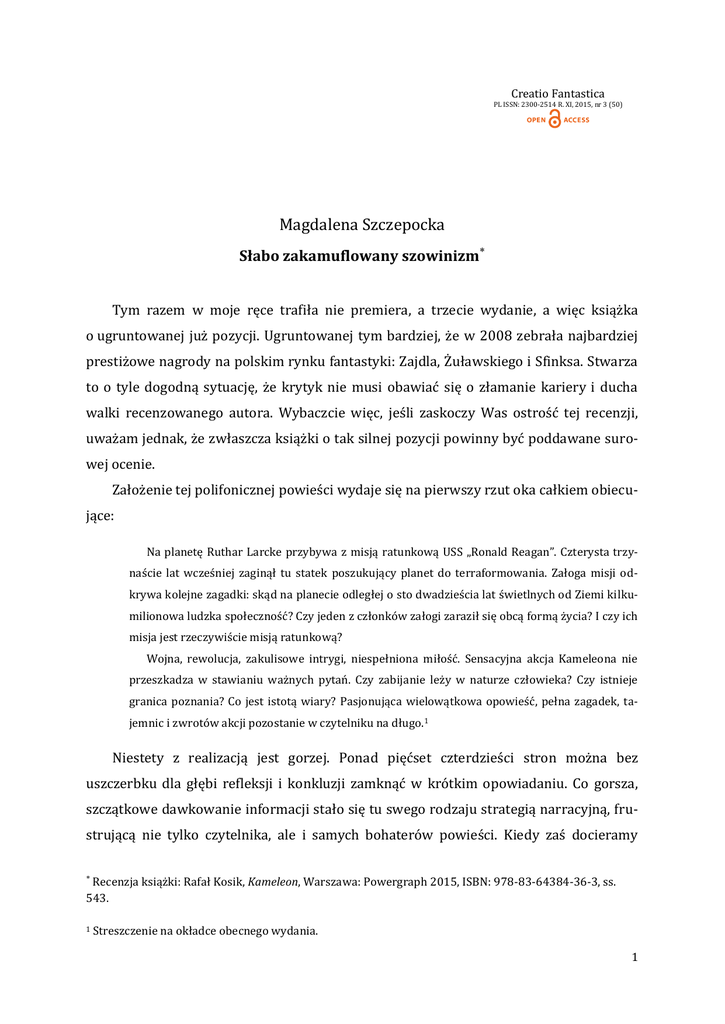 Creatio Fantastica PL ISSN: 2300-2514 R. XI, 2015, nr 3 (50) Magdalena Szczepocka Słabo zakamuflowany szowinizm Tym razem w moje ręce trafiła nie premiera, a trzecie wydanie, a więc książka o ugruntowanej już pozycji. Ugruntowanej tym bardziej, że w 2008 zebrała najbardziej prestiżowe nagrody na polskim rynku fantastyki: Zajdla, Żuławskiego i Sfinksa. Stwarza to o tyle dogodną sytuację, że krytyk nie musi obawiać się o złamanie kariery i ducha walki recenzowanego autora. Wybaczcie więc, jeśli zaskoczy Was ostrość tej recenzji, uważam jednak, że zwłaszcza książki o tak silnej pozycji powinny być poddawane surowej ocenie. Założenie tej polifonicznej powieści wydaje się na pierwszy rzut oka całkiem obiecujące: Na planetę Ruthar Larcke przybywa z misją ratunkową USS „Ronald Reagan”. Czterysta trzynaście lat wcześniej zaginął tu statek poszukujący planet do terraformowania. Załoga misji odkrywa kolejne zagadki: skąd na planecie odległej o sto dwadzieścia lat świetlnych od Ziemi kilkumilionowa ludzka społeczność? Czy jeden z członków załogi zaraził się obcą formą życia? I czy ich misja jest rzeczywiście misją ratunkową? Wojna, rewolucja, zakulisowe intrygi, niespełniona miłość. Sensacyjna akcja Kameleona nie przeszkadza w stawianiu ważnych pytań. Czy zabijanie leży w naturze człowieka? Czy istnieje granica poznania? Co jest istotą wiary? Pasjonująca wielowątkowa opowieść, pełna zagadek, tajemnic i zwrotów akcji pozostanie w czytelniku na długo.1 Niestety z realizacją jest gorzej. Ponad pięćset czterdzieści stron można bez uszczerbku dla głębi refleksji i konkluzji zamknąć w krótkim opowiadaniu. Co gorsza, szczątkowe dawkowanie informacji stało się tu swego rodzaju strategią narracyjną, frustrującą nie tylko czytelnika, ale i samych bohaterów powieści. Kiedy zaś docieramy Recenzja książki: Rafał Kosik, Kameleon, Warszawa: Powergraph 2015, ISBN: 978-83-64384-36-3, ss. 543. 1 Streszczenie na okładce obecnego wydania. 1 wreszcie do jakichś odpowiedzi, okazują się one wewnętrznie sprzeczne i niespójne z logicznego punktu widzenia. A szkoda, bo miał Kameleon potencjał na ciekawy głos w dyskursie ksenologicznym. Na powieść składają się trzy wątki: losy astronautów wysłanych na mocno spóźnioną misję ratunkową, dzieje mieszkańców Ruthar Larcke, przechodzących błyskawiczną rewolucję przemysłową, wojnę i rewolucję w jednym, oraz zamykająca całą książkę retrospekcja na wydarzenia towarzyszące pierwszej wyprawie na planetę. Pierwszy wątek potraktowany jest dość szkicowo, służąc bardziej za ramę dla narracji właściwiej, bo też i miotający się na oślep astronauci nie mają ostatecznie żadnego wpływu na przebieg wydarzeń. Najwięcej miejsca i uwagi autor poświęca wydarzeniom toczącym się na samej planecie. Niestety, mimo nieprawdopodobnego wręcz tempa zmian społecznych, politycznych i naukowych, mrowie zaprezentowanych postaci zlewa się ze sobą i nie budzi sympatii. Poszczególni naukowcy, wojskowi, politycy i kapłani jeden w drugiego są przeświadczonymi o swej wielkości, odpychającymi egoistami, małostkowymi tchórzami lub fanatykami. Zastanawiacie się zapewne, dlaczego używam tak swobodnie formy męskoosobowej. Nie jest to przypadek, bo kobiecych postaci w całej tej historii jak na lekarstwo, te zaś, które się pojawiają, scharakteryzowane są jeszcze bardziej powierzchownie niż mężczyźni, tak iż mogłyby w większości zostać zastąpione przez przysłowiową seksowną lampę2. W istocie im dalej w powieść, tym bardziej miałam ochotę zastosować filmoznawczy skądinąd test Bechdel. Pomysł wywodzi się z refleksji Wirginii Wolf, na temat dominacji męskiej perspektywy w reprezentacji kobiet w literaturze. Test Bechdel dziś dość powszechnie stosowany do filmów, zwłaszcza hollywoodzkiej proweniencji, ale także gier komputerowych czy komiksów3, może wiele w tym przypadku powiedzieć o ideologii niezbyt głęboko skrywającej się pod powierzchnią tekstu. Trzy proste kryteria tego testu to: 1) czy występują przynajmniej dwie kobiece postacie (nazwane z imienia) 2) czy kiedykolwiek rozmawiają one ze sobą i 3) czy rozmawiają o czymkolwiek innym niż mężczyźni. Z przykrością muszę stwierdzić, że w ponad pięciusetstronnicowej, wielowątkowej powieści Kosika, te trzy proste wymogi nie zostają spełnione. Kobiety bez wyjątku Por. Forrest Helvie, The Bechdel Test and a Sexy Lamp: Detecting Gender Bias and Stereotypes in Mainstream Comics, Sequart Organization, online: http://sequart.org/magazine/34150/the-bechdel-test-anda-sexy-lamp-detecting-gender-bias-and-stereotypes-in-mainstream-comics/ (dostęp: 15.07.2015). 3 Por. http://women-in-film.silk.co/ http://bechdeltest.com/ https://bechdelgamer.wordpress.com/ http://bechdeltestingcomics.tumblr.com/ (dostęp: 15.07.2015). 2 2 służą tu za seksualną motywację/dystrakcję/nagrodę dla męskich aktantów. Kiedy zaś próbują podejmować jakiekolwiek działanie, ich emocjonalna i irracjonalna natura nieuchronnie powoduje katastrofalne w skutkach zagrożenie dla całej ludzkości. Ktoś mógłby próbować powoływać się na zacofaną feudalną strukturę społeczną na Ruthar Larcke, ale kiepskie to wyjaśnienie, skoro to samo odnosi się do uczestniczek obu misji z Ziemi, poza tym nie widzę żadnego powodu dla którego nagła eksplozja geniuszu dotyka tylko męską populację planety. Nawet pojawiające się w ostatnim rozdziale przedstawienie pierwszego kontaktu, przyznaję dość interesujące i pobudzające wyobraźnię, okazuje się niestety mało oryginalne. Skojarzenia z klasyką polskiej fantastyki naukowej nasuwają się nieodparcie. Idea obcej formy życia obejmującej całą planetę i powołującej do istnienia efemeryczne, a docelowo i humanoidalne, formy by wyjść naprzeciw człowiekowi mnie usilnie kojarzy się z Solaris Lema. Nawet upio