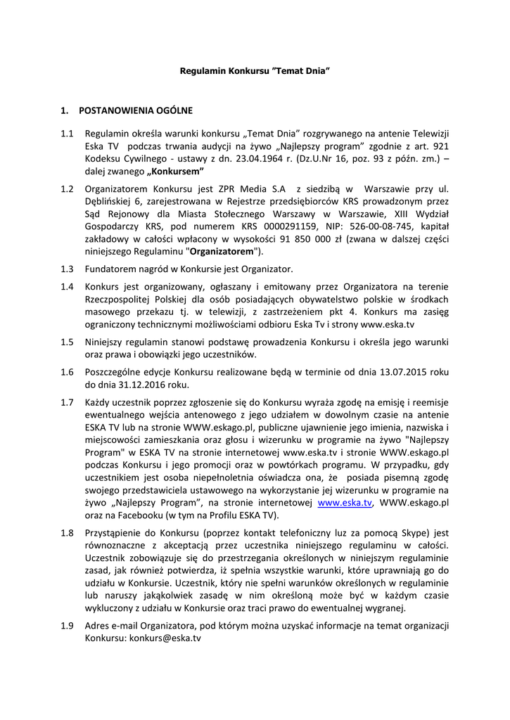 Regulamin Konkursu ”Temat Dnia” 1. POSTANOWIENIA OGÓLNE 1.1 Regulamin określa warunki konkursu „Temat Dnia” rozgrywanego na antenie Telewizji Eska TV podczas trwania audycji na żywo „Najlepszy program” zgodnie z art. 921 Kodeksu Cywilnego - ustawy z dn. 23.04.1964 r. (Dz.U.Nr 16, poz. 93 z późn. zm.) – dalej zwanego „Konkursem” 1.2 Organizatorem Konkursu jest ZPR Media S.A z siedzibą w Warszawie przy ul. Dęblińskiej 6, zarejestrowana w Rejestrze przedsiębiorców KRS prowadzonym przez Sąd Rejonowy dla Miasta Stołecznego Warszawy w Warszawie, XIII Wydział Gospodarczy KRS, pod numerem KRS 0000291159, NIP: 526-00-08-745, kapitał zakładowy w całości wpłacony w wysokości 91 850 000 zł (zwana w dalszej części niniejszego Regulaminu "Organizatorem"). 1.3 Fundatorem nagród w Konkursie jest Organizator. 1.4 Konkurs jest organizowany, ogłaszany i emitowany przez Organizatora na terenie Rzeczpospolitej Polskiej dla osób posiadających obywatelstwo polskie w środkach masowego przekazu tj. w telewizji, z zastrzeżeniem pkt 4. Konkurs ma zasięg ograniczony technicznymi możliwościami odbioru Eska Tv i strony www.eska.tv 1.5 Niniejszy regulamin stanowi podstawę prowadzenia Konkursu i określa jego warunki oraz prawa i obowiązki jego uczestników. 1.6 Poszczególne edycje Konkursu realizowane będą w terminie od dnia 13.07.2015 roku do dnia 31.12.2016 roku. 1.7 Każdy uczestnik poprzez zgłoszenie się do Konkursu wyraża zgodę na emisję i reemisje ewentualnego wejścia antenowego z jego udziałem w dowolnym czasie na antenie ESKA TV lub na stronie WWW.eskago.pl, publiczne ujawnienie jego imienia, nazwiska i miejscowości zamieszkania oraz głosu i wizerunku w programie na żywo "Najlepszy Program" w ESKA TV na stronie internetowej www.eska.tv i stronie WWW.eskago.pl podczas Konkursu i jego promocji oraz w powtórkach programu. W przypadku, gdy uczestnikiem jest osoba niepełnoletnia oświadcza ona, że posiada pisemną zgodę swojego przedstawiciela ustawowego na wykorzystanie jej wizerunku w programie na żywo „Najlepszy Program”, na stronie internetowej www.eska.tv, WWW.eskago.pl oraz na Facebooku (w tym na Profilu ESKA TV). 1.8 Przystąpienie do Konkursu (poprzez kontakt telefoniczny luz za pomocą Skype) jest równoznaczne z akceptacją przez uczestnika niniejszego regulaminu w całości. Uczestnik zobowiązuje się do przestrzegania określonych w niniejszym regulaminie zasad, jak również potwierdza, iż spełnia wszystkie warunki, które uprawniają go do udziału w Konkursie. Uczestnik, który nie spełni warunków określonych w regulaminie lub naruszy jakąkolwiek zasadę w nim określoną może być w każdym czasie wykluczony z udziału w Konkursie oraz traci prawo do ewentualnej wygranej. 1.9 Adres e-mail Organizatora, pod którym można uzyskać informacje na temat organizacji Konkursu: [email protected] 2. Nagrody 2.1. Nagrodami głównymi w Konkursie jest: płyta CD o wartości do 40 zł lub głośnik mp3 o wartości do 49,59 zł lub słuchawki o wartości do 76,35 zł lub okulary o wartości do 30 zł lub zegarek o wartości do 30 zł lub koszulka o wartości do 43,05 zł lub czapeczka o wartości do 30 zł lub torba o wartości do 31 zł lub płyta DVD o wartości do 60 zł lub książka o wartości do 50 zł lub bilety na eventy o wartości do 80 zł lub pulsometr o wartości do 475 zł lub smartwatch o wartości do 429 zł lub bransoletki odblaskowe o wartości do 5 zł lub ozdoby choinkowe o wartości do 10 zł – przyznanie jednej z nagród zależy od decyzji prowadzącego konkurs na co Uczestnik Konkursu wyraża zgodę. 2.2. Organizator zastrzega, że w trakcie trwania Konkursu może zostać przez niego ufundowana nagroda pocieszenia w postaci wybranej przez niego płyty lub innego gadżetu o wartości nieprzekraczającej 50 zł (słownie: pięćdziesiąt złotych) – przyznanie każdej takiej nagrody oraz ich liczba i uczestnicy, którym będzie ona przyznana zależy od decyzji komisji konkursowej. Na zasady rozdania ewentualnych nagród pocieszenia każdy z uczestników przystępując do Konkursu, wyraża zgodę. 2.3. Organizator oświadcza, iż wszystkie nagrody obowiązującymi przepisami prawa podatkowego. zostaną wydane zgodnie z 2.4. Organizator nie ponosi odpowiedzialności za niemożność odbioru lub nieodebranie którejkolwiek nagrody, z jakiejkolwiek przyczyny leżącej po stronie nagrodzonego uczestnika. 2.5 Organizator nie ponosi odpowiedzialności za zmianę miejsca zamieszkania i/lub podanego przez uczestnika Konkursu adresu lub zmianę innych danych – uniemożliwiającą kontakt z tym uczestnikiem lub odebranie przez niego zestawu nagród/nagrody. 2.6 O szczegółach odbioru i realizacji nagród zwycięzca każdej edycji Konkursu zostanie poinformowany przez Organizatora drogą mailową lub za pośrednictwem rozmowy telefonicznej. 2.7 Nagrody nie odebrane przez zwycięzcę Konkursu w terminie 30 dni od rozstrzygnięcia Konkursu przechodzą na własność Organizatora. 2.8 Przy odbiorze przez zwycięzcę edycji Konkursu nagrody zobowiązany jest on okazać dokument potwierdzający jego tożsamość lub w przypadku odbioru tej nagrody przez pełnomocnika zwycięzcy zobowiązany jest on okazać pisemne upoważnienie od zwycięzcy, który wygrał daną nagrodę, zawierające następujące informacje: imię nazwisko, adres, numer i seria dowodu osobistego, telefon kontaktowy tego zwycięzcy oraz adnotację o upoważnieniu określonej osoby do odbioru w jego imieniu danej nagrody, jak również podpis tego zwycięzcy wraz z danymi osoby odbierającej czyli imieniem, nazwiskiem, serią i numerem dowodu osobistego oraz telefonem odbiorcy. W przypadku niespełnienia przez osobę podającą się za pełnomocnika zwycięzcy powyższych warunków nagroda nie będzie jej wydana. 3. Zasady uczestnictwa w konkursie 3.1 Ogólne zasady Konkursu podawane są na antenie Eska TV oraz na stronie internetowej www.eska.tv. 3.2 