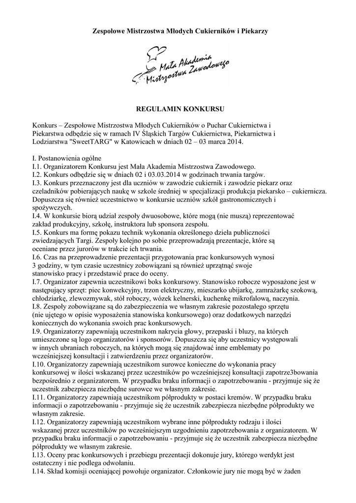 Zespołowe Mistrzostwa Młodych Cukierników i Piekarzy REGULAMIN KONKURSU Konkurs – Zespołowe Mistrzostwa Młodych Cukierników o Puchar Cukiernictwa i Piekarstwa odbędzie się w ramach IV Śląskich Targów Cukiernictwa, Piekarnictwa i Lodziarstwa "SweetTARG" w Katowicach w dniach 02 – 03 marca 2014. I. Postanowienia ogólne I.1. Organizatorem Konkursu jest Mała Akademia Mistrzostwa Zawodowego. I.2. Konkurs odbędzie się w dniach 02 i 03.03.2014 w godzinach trwania targów. I.3. Konkurs przeznaczony jest dla uczniów w zawodzie cukiernik i zawodzie piekarz oraz czeladników pobierających naukę w szkole średniej w specjalizacji produkcja piekarsko – cukiernicza. Dopuszcza się również uczestnictwo w konkursie uczniów szkół gastronomicznych i spożywczych. I.4. W konkursie biorą udział zespoły dwuosobowe, które mogą (nie muszą) reprezentować zakład produkcyjny, szkołę, instruktora lub sponsora zespołu. I.5. Konkurs ma formę pokazu technik wykonania określonego dzieła publiczności zwiedzających Targi. Zespoły kolejno po sobie przeprowadzają prezentacje, które są oceniane przez jurorów w trakcie ich trwania. I.6. Czas na przeprowadzenie prezentacji przygotowania prac konkursowych wynosi 3 godziny, w tym czasie uczestnicy zobowiązani są również uprzątnąć swoje stanowisko pracy i przedstawić prace do oceny. I.7. Organizator zapewnia uczestnikowi boks konkursowy. Stanowisko robocze wyposażone jest w następujący sprzęt: piec konwekcyjny, trzon elektryczny, mieszarko ubijarkę, zamrażarkę szokową, chłodziarkę, zlewozmywak, stół roboczy, wózek kelnerski, kuchenkę mikrofalową, naczynia. I.8. Zespoły zobowiązane są do zabezpieczenia we własnym zakresie pozostałego sprzętu (nie ujętego w opisie wyposażenia stanowiska konkursowego) oraz dodatkowych narzędzi koniecznych do wykonania swoich prac konkursowych. I.9. Organizatorzy zapewniają uczestnikom nakrycia głowy, przepaski i bluzy, na których umieszczone są logo organizatorów i sponsorów. Dopuszcza się aby uczestnicy występowali w innych ubraniach roboczych, na których mogą się znajdować inne emblematy po wcześniejszej konsultacji i zatwierdzeniu przez organizatorów. I.10. Organizatorzy zapewniają uczestnikom surowce konieczne do wykonania pracy konkursowej w ilości wskazanej przez uczestników po wcześniejszej konsultacji zapotrze3bowania bezpośrednio z organizatorem. W przypadku braku informacji o zapotrzebowaniu - przyjmuje się że uczestnik zabezpiecza niezbędne surowce we własnym zakresie. I.11. Organizatorzy zapewniają uczestnikom półprodukty w postaci kremów. W przypadku braku informacji o zapotrzebowaniu - przyjmuje się że uczestnik zabezpiecza niezbędne półprodukty we własnym zakresie. I.12. Organizatorzy zapewniają uczestnikom wybrane inne półprodukty rodzaju i ilości wskazanej przez uczestników po wcześniejszym uzgodnieniu zapotrzebowania z organizatorem. W przypadku braku informacji o zapotrzebowaniu - przyjmuje się że uczestnik zabezpiecza niezbędne półprodukty we własnym zakresie. I.13. Oceny prac konkursowych i przebiegu prezentacji dokonuje jury, którego werdykt jest ostateczny i nie podlega odwołaniu. I.14. Skład komisji oceniającej powołuje organizator. Członkowie jury nie mogą być w żaden sposób związani z uczestnikami konkursu. I.15. Organizatorzy zastrzegają sobie prawo do publikacji zarówno w formie pisemnej jak i elektronicznej materiałów konkursowych, receptur, nazw firm oraz nazwisk osób startujących. Organizatorzy zastrzegają sobie prawo do publikacji fotograficznej oraz filmowej prac oraz innych materiałów konkursowych poszczególnych zespołów. II. Opis zadań konkursowych II.1. Każdy zespół prezentuje wykonanie jednego eksponatu. II.2. Tematyką prac konkursowych są dzieła cukiernicze i piekarskie o dowolnej tematyce. II.3. Praca konkursowa może być wykonana dowolną techniką, w dowolnym stylu i może mieć dowolny kształt oraz dowolną wielkość. II.4. Ocenie nie podlega skład dzieła, ani jego smak. II.5. Zastrzega się że praca konkursowa musi być w całości wykonana z jadalnych surowców i półproduktów z zastrzeżeniem takich elementów niejadalnych jak podstawy, stelaże i inne elementy służące odpowiedniemu wyeksponowaniu dzieła. II.6. Praca konkursowa może być wykonana z gotowych półproduktów jednak musi być złożona, wykończona i udekorowana podczas konkursu. II.7. Zastrzega się prawo do dyskwalifikacji zespołu, który podczas swej prezentacji używa gotowych elementów dekoracyjnych nie wykonanych podczas konkursu lub elementów. II.8. Uczestnik musi krótko zaprezentować swój eksponat – tort i omówić zastosowane techniki dekoracji wraz z opisem zastosowanych surowców. II.9. Każdy uczestnik musi przesłać do organizatora nazwę tortu i krótki opis projektu jego wykonania. III. Ocena prezentacji konkursowych III.1. Ocenie podlegają: forma pracy konkursowej, styl, metody produkcji i sposób dekoracji oraz forma prezentacji całego procesu powstawania pracy konkursowej. III.2. Jurorzy poddają ocenie pracę uczestników według własnych kryteriów. III.3. Ostateczna ocena następuje po konsultacji członków Jury. III.4. Wyniki konkursu zostaną ogłoszone w miejscu organizacji konkursu dnia 03. marca 2014 podczas uroczystości zakończenia konkursu i wręczenia nagród. IV. Nagrody Nagrodami za pierwsze, drugie i trzecie miejsce dla każdego uczestnika najlepszego zespołu są puchary. Dodatkową nagrodą dla zwycięskiego zespołu są wyjazdy na zagraniczną imprezę turystyczną. V. Zgłoszenia do konkursu V.1. Zgłoszenia do konkursu dokonywane są bezpośrednio u organizatora, telefonicznie lub za pośrednictwem poczty elektronicznej. V.2. O dopuszczeniu zespołu do konkursu decyduje kolejność zgłoszeń. V.3. O dopuszczeniu lub odrzuceniu, kandydaci do konkursu zostaną powiadomieni przez organizatora e-mailem lub telefonicznie. Koo