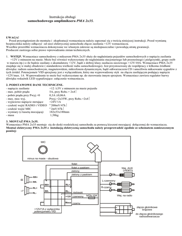 Instrukcja obsługi samochodowego amplimiksera PMA 2x35.