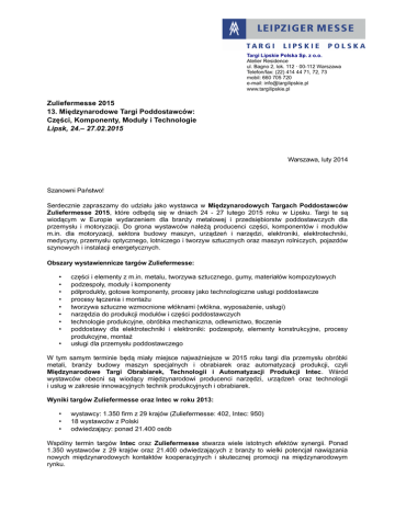 Targi Lipskie Polska Sp. z o.o. Atelier Residence ul. Bagno 2, lok. 112 · 00-112 Warszawa Telefon/fax: (22) 414 44 71, 72, 73 mobil: 660 705 720 e-mail: [email protected] www.targilipskie.pl Zuliefermesse 2015 13. Międzynarodowe Targi Poddostawców: Części, Komponenty, Moduły i Technologie Lipsk, 24.– 27.02.2015 Warszawa, luty 2014 Szanowni Państwo! Serdecznie zapraszamy do udziału jako wystawca w Międzynarodowych Targach Poddostawców Zuliefermesse 2015, które odbędą się w dniach 24 - 27 lutego 2015 roku w Lipsku. Targi te są wiodącym w Europie wydarzeniem dla branży metalowej i przedsiębiorstw poddostawczych dla przemysłu i motoryzacji. Do grona wystawców należą producenci części, komponentów i modułów m.in. dla motoryzacji, sektora budowy maszyn, urządzeń i narzędzi, elektroniki, elektrotechniki, medycyny, przemysłu optycznego, lotniczego i tworzyw sztucznych oraz maszyn rolniczych, pojazdów szynowych i instalacji energetycznych. Obszary wystawiennicze targów Zuliefermesse: • • • • • • • • • części i elementy z m.in. metalu, tworzywa sztucznego, gumy, materiałów kompozytowych podzespoły, moduły i komponenty półprodukty, gotowe komponenty, procesy jako technologiczne usługi poddostawcze procesy łączenia i montażu tworzywa sztuczne wzmocnione włóknami (włókna, wyposażenie, usługi) narzędzia do produkcji modułów i części poddostawczych technologie produkcyjne, obróbka mechaniczna, odlewnictwo, tłoczenie poddostawy dla elektrotechniki i elektroniki: podzespoły, elementy konstrukcyjne, procesy produkcyjne, montaż usługi dla przemysłu poddostawczego W tym samym terminie będą miały miejsce najważniejsze w 2015 roku targi dla przemysłu obróbki metali, branży budowy maszyn specjalnych i obrabiarek oraz automatyzacji produkcji, czyli Międzynarodowe Targi Obrabiarek, Technologii i Automatyzacji Produkcji Intec. Wśród wystawców obecni są wiodący międzynarodowi producenci narzędzi, urządzeń oraz technologii i usług w zakresie innowacyjnych technik produkcyjnych i obrabiarek. Wyniki targów Zuliefermesse oraz Intec w roku 2013: • • • wystawcy: 1.350 firm z 29 krajów (Zuliefermesse: 402, Intec: 950) 18 wystawców z Polski odwiedzający: ponad 21.400 osób Wspólny termin targów Intec oraz Zuliefermesse stwarza wiele istotnych efektów synergii. Ponad 1.350 wystawców z 29 krajów oraz 21.400 odwiedzających z branży to wielki potencjał nawiązania nowych międzynarodowych kontaktów kooperacyjnych i skutecznej promocji na międzynarodowym rynku. Integralną część targów Zuliefermesse stanowi organizowana w ramach europejskiej sieci Enterprise Europe Network Międzynarodowa Giełda Kooperacji „CONTACT: Business Meetings”. Wybór partnerów do spotkań odbywa się na kilka miesięcy przed targami, natomiast rozmowy kooperacyjne mają miejsce w trakcie trwania imprezy. Dla wystawców udział w giełdzie jest bezpłatny. Jeśli są Państwo zainteresowani nawiązaniem nowych kontaktów i znalezieniem międzynarodowych partnerów handlowych na europejskim rynku przemysłowym, to zapraszamy do prezentacji jako wystawca podczas tej wiodącej imprezy targowej. Udział indywidualny. Koszt niezabudowanej powierzchni wystawienniczej: Zgłoszenie - stoisko szeregowe (jedna strona otwarta) - stoisko narożne (dwie strony otwarte) - stoisko czołowe (trzy strony otwarte) - stoisko wyspowe (cztery strony otwarte) do 01.11.2014 132,- €/m2 139,- €/m2 146,- €/m2 151,- €/m2 od 02.11.2014 142,- €/m2 149,- €/m2 156,- €/m2 161,- €/m2 Koszty dodatkowe to obowiązkowy wpis do katalogu wystawców 170,- €, zryczałtowana opłata reklamowa 95,- € oraz opłata AUMA w wysokości 0,60 €/m2. Ceny netto, plus 19% niemiecki podatek VAT. Udział w Polskim Wystąpieniu Narodowym: Udział we wspólnym stoisku stwarza Państwu okazję promocji firmy na własnej powierzchni ekspozycyjnej wraz z pełnym pakietem: zabudowa indywidualna, wydruk wielkoformatowy o pow. ok. 5 m², podłączenie prądu, zaplecze kuchenne i magazynowe, recepcja wraz z usługami tłumaczy. Aby wziąć udział w wystąpieniu należy wykupić jeden z poniższych modułów: ◦ 6 m2 w cenie 12.700 zł netto 2 ◦ 9m w cenie 18.500 zł netto ◦ 12 m2 w cenie 24.300 zł netto 2 ◦ 15 m w cenie 31.250 zł netto Koszty dodatkowe to obowiązkowy wpis do katalogu wystawców 170,- € i zryczałtowana opłata reklamowa 95,- €. W celu uzyskania atrakcyjnej lokalizacji, sugerujemy przesłanie dokumentów zgłoszeniowych do dnia 30.06.2014. Jeśli są Państwo zainteresowani wzięciem udziału w targach Zuliefermesse 2015, zapraszamy na stronę www.poddostawcy.pl. W zakładce dla wystawców znajduje się oficjalny formularz zgłoszeniowy oraz umowa udziału w Polskim Wystąpieniu Narodowym. Termin zgłoszeń: 30.06.2014. W załączonym folderze znajdą Państwo pełne informacje o targach. W przypadku dodatkowych pytań, proszę o kontakt z naszym biurem. Z poważaniem Magdalena Dziemidek Prezes Zarządu Targi Lipskie Polska Sp. z o.o.