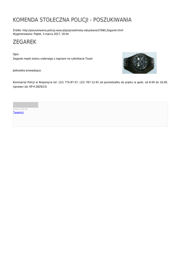 KOMENDA STOŁECZNA POLICJI - POSZUKIWANIA Źródło: http://poszukiwania.policja.waw.pl/pz/przedmioty-odzyskane/27685,Zegarek.html Wygenerowano: Piątek, 3 marca 2017, 19:44 ZEGAREK Opis: Zegarek męski koloru srebrnego z napisem na cyferblacie Tissot Jednostka prowadząca: Komisariat Policji w Nieporęcie tel. (22) 774-87-57, (22) 767-12-91 od poniedziałku do piątku w godz. od 8.00 do 16.00. (sprawa l.dz. KP-II-2829/13) Ocena: 0/5 (0) Tweetnij
