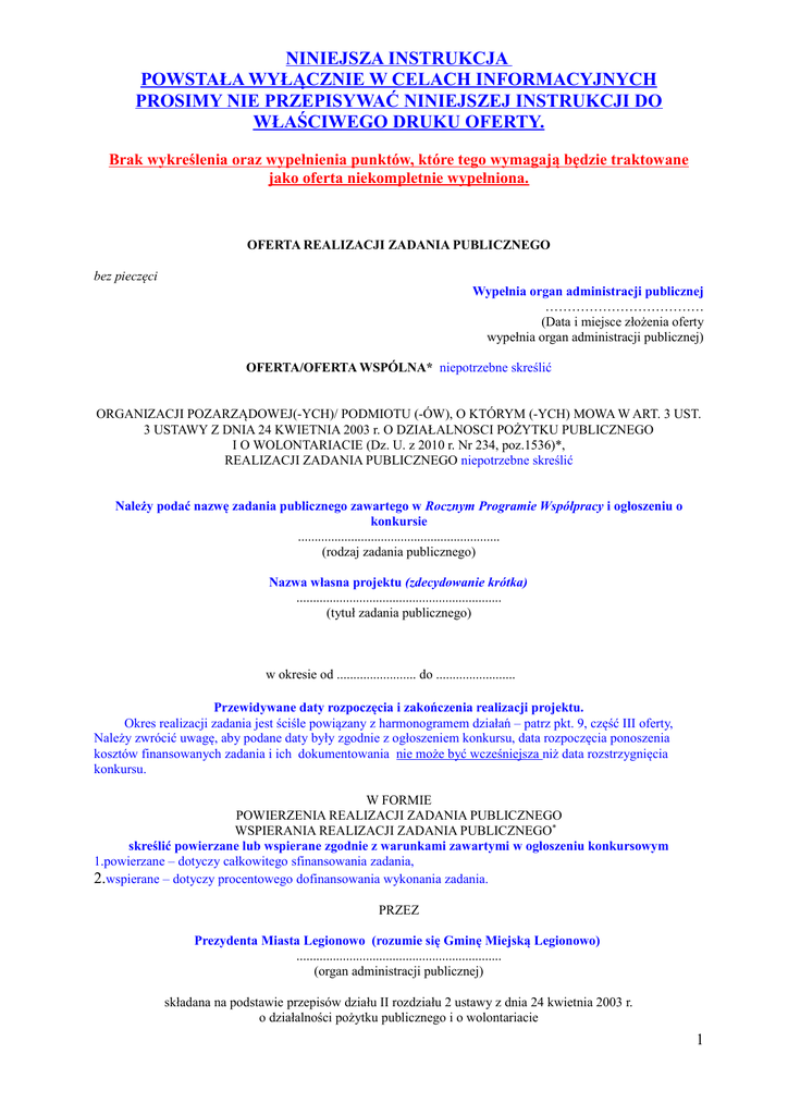 NINIEJSZA INSTRUKCJA POWSTAŁA WYŁĄCZNIE W CELACH INFORMACYJNYCH PROSIMY NIE PRZEPISYWAĆ NINIEJSZEJ INSTRUKCJI DO WŁAŚCIWEGO DRUKU OFERTY. Brak wykreślenia oraz wypełnienia punktów, które tego wymagają będzie traktowane jako oferta niekompletnie wypełniona. OFERTA REALIZACJI ZADANIA PUBLICZNEGO bez pieczęci Wypełnia organ administracji publicznej ……………………………… (Data i miejsce złożenia oferty wypełnia organ administracji publicznej) OFERTA/OFERTA WSPÓLNA* niepotrzebne skreślić ORGANIZACJI POZARZĄDOWEJ(-YCH)/ PODMIOTU (-ÓW), O KTÓRYM (-YCH) MOWA W ART. 3 UST. 3 USTAWY Z DNIA 24 KWIETNIA 2003 r. O DZIAŁALNOSCI POŻYTKU PUBLICZNEGO I O WOLONTARIACIE (Dz. U. z 2010 r. Nr 234, poz.1536)*, REALIZACJI ZADANIA PUBLICZNEGO niepotrzebne skreślić Należy podać nazwę zadania publicznego zawartego w Rocznym Programie Współpracy i ogłoszeniu o konkursie ............................................................. (rodzaj zadania publicznego) Nazwa własna projektu (zdecydowanie krótka) .............................................................. (tytuł zadania publicznego) w okresie od ........................ do ........................ Przewidywane daty rozpoczęcia i zakończenia realizacji projektu. Okres realizacji zadania jest ściśle powiązany z harmonogramem działań – patrz pkt. 9, część III oferty, Należy zwrócić uwagę, aby podane daty były zgodnie z ogłoszeniem konkursu, data rozpoczęcia ponoszenia kosztów finansowanych zadania i ich dokumentowania nie może być wcześniejsza niż data rozstrzygnięcia konkursu. W FORMIE POWIERZENIA REALIZACJI ZADANIA PUBLICZNEGO WSPIERANIA REALIZACJI ZADANIA PUBLICZNEGO* skreślić powierzane lub wspierane zgodnie z warunkami zawartymi w ogłoszeniu konkursowym 1.powierzane – dotyczy całkowitego sfinansowania zadania, 2.wspierane – dotyczy procentowego dofinansowania wykonania zadania. PRZEZ Prezydenta Miasta Legionowo (rozumie się Gminę Miejską Legionowo) .............................................................. (organ administracji publicznej) składana na podstawie przepisów działu II rozdziału 2 ustawy z dnia 24 kwietnia 2003 r. o działalności pożytku publicznego i o wolontariacie 1 I. Dane oferenta/oferentów* niepotrzebne skreślić 1) nazwa: ................................................wpisać nazwę podmiotu w brzmieniu rejestru z KRS lub innej ewidencji 2) forma prawna: zaznaczyć X właściwą formę organizacji lub wpisać inną ( ) stowarzyszenie ( ) fundacja ( ) kościelna osoba prawna ( ) kościelna jednostka organizacyjna ( ) spółdzielnia socjalna ( ) inna………………………………… 3) numer w Krajowym Rejestrze Sądowym, w innym rejestrze lub ewidencji: oprócz numeru należy wpisać właściwą nazwę rejestru lub ewidencji ........................................................................................................ 4) data wpisu, rejestracji lub utworzenia: ........................................................ 5) nr NIP: .......................................... nr REGON: ........................................... 6) adres: miejscowość: ..................................... ul.: .................................................... ulica z numerem posesji lub lokalu dzielnica lub inna jednostka pomocnicza: ……………………………………….. gmina: ........................................... powiat: .................................................. województwo: ................................................. kod pocztowy: ……………… poczta: ………............................. 7) tel.: .................................. faks: ..................................................... e-mail: ................................ http:// ............................................... 8) numer rachunku bankowego: ……………………………............................... ZE SZCZEGÓLNĄ UWAGĄ nazwa banku: ………………………….......................................................... 9) nazwiska i imiona osób upoważnionych do reprezentowania oferenta/oferentów *: niepotrzebne skreślić Należy podać imiona i nazwiska oraz pełnione funkcje osób, które są upoważnione do reprezentowania oferenta i zaciągania w jego imieniu zobowiązań finansowych oraz składania oświadczeń woli zgodnie ze statutem, zawartą tam określoną procedurą i aktualnym odpisem z rejestru. Zarówno oferta, umowa jak i sprawozdanie muszą zostać podpisane przez osoby upoważnione w takim samym, jak wyżej trybie. UWAGA: W sytuacji odmiennej od powyższego, należy dołączyć Uchwałę Zarządu w przypadku istnienia w statucie m. in. zapisów następującej treści: „w imieniu Zarządu umowy, zobowiązania i pełnomocnictwa podpisują: -osoby upoważnione/uprawnione przez Zarząd, -upoważniony/uprawniony członek Zarządu, -osoba upoważniona/uprawniona do prowadzenia spraw finansowych, -członkowie Zarządu, po uzyskaniu akceptacji Zarządu, -inne przypadki, w których konieczne jest przedłożenie stosownego upoważnienia. a) ………………………................................................................................ b) ………………………………………………………………………………... c) ……………………………………………………………………………..…. 2 10) nazwa, adres i telefon kontaktowy jednostki organizacyjnej bezpośrednio wykonującej zadanie, o którym mowa w ofercie: Dotyczy sytuacji udziału w bezpośredniej merytorycznej realizacji lub wykonaniu organów terenowych, placówek i innych wyodrębnionych jednostek organizacyjnych oferenta. Należy wypełnić jeśli zadanie ma być realizowane w obrębie takiej jednostki organizacyjnej. Oznacza to również, że jeżeli zadanie będzie realizowane także przez inne organizacje pozarządowe lub zewnętrzne podmioty – należy je tu wskazać. W przypadku oddziału t