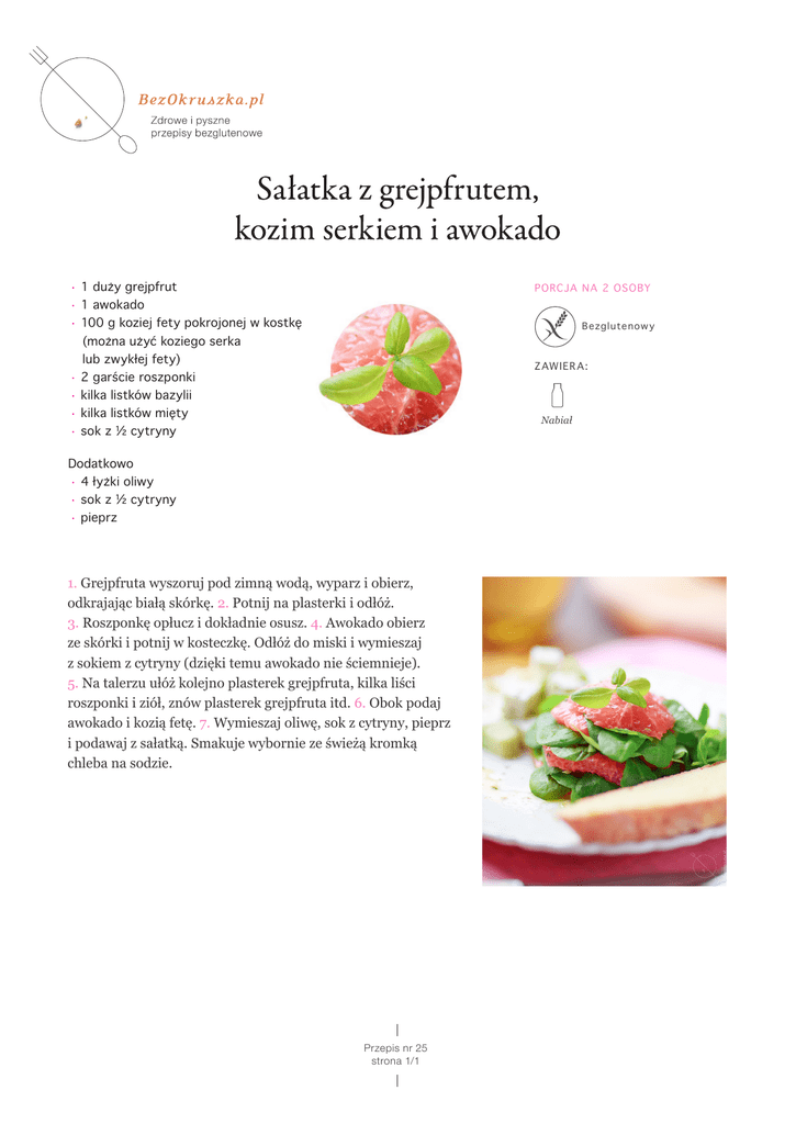 ·· 1 duży grejpfrut ·· 1 awokado ·· 100 g koziej fety pokrojonej w kostkę (można użyć koziego serka· lub zwykłej fety) ·· 2 garście roszponki ·· kilka listków bazylii ·· kilka listków mięty ·· sok z ½ cytryny· PORC JA NA 2 OSOBY Bezglutenow y Z AWIER A: Nabiał Dodatkowo ·· 4 łyżki oliwy ·· sok z ½ cytryny ·· pieprz 1. Grejpfruta wyszoruj pod zimną wodą, wyparz i obierz, odkrajając białą skórkę. 2. Potnij na plasterki i odłóż. 3. Roszponkę opłucz i dokładnie osusz. 4. Awokado obierz ze skórki i potnij w kosteczkę. Odłóż do miski i wymieszaj z sokiem z cytryny (dzięki temu awokado nie ściemnieje). 5. Na talerzu ułóż kolejno plasterek grejpfruta, kilka liści roszponki i ziół, znów plasterek grejpfruta itd. 6. Obok podaj awokado i kozią fetę. 7. Wymieszaj oliwę, sok z cytryny, pieprz i podawaj z sałatką. Smakuje wybornie ze świeżą kromką chleba na sodzie. Przepis nr 25 strona 1/1