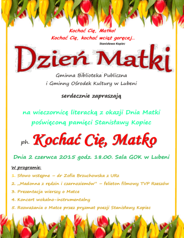 Kochać Cię, Matko! Kochać Cię, kochać wciąż goręcej… Stanisława Kopiec Gminna Biblioteka Publiczna i Gminny Ośrodek Kultury w Lubeni serdecznie zapraszają na wieczornicę literacką z okazji Dnia Matki poświęconą pamięci Stanisławy Kopiec ph. Dnia 2 czerwca 2015 godz. 18.00. Sala GOK w Lubeni W programie: 1. Słowo wstępne – dr Zofia Brzuchowska z URz 2. „Madonna z rędzin i czarnoziemów” – felieton filmowy TVP Rzeszów 3. Prezentacja wierszy o Matce 4. Koncert wokalno-instrumentalny 5. Rozważania o Matce przez pryzmat poezji Stanisławy Kopiec