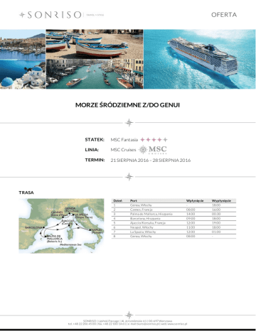 OFERTA MORZE ŚRÓDZIEMNE Z/DO GENUI STATEK: MSC Fantasia LINIA: MSC Cruises TERMIN: 21 SIERPNIA 2016 – 28 SIERPNIA 2016 TRASA Dzień 1 2 3 4 5 6 7 8 Port Genoa, Włochy Cannes, Francja Palma de Mallorca, Hiszpania Barcelona, Hiszpania Ajaccio/Korsyka, Francja Neapol, Włochy La Spazia, Włochy Genoa, Włochy Wpłynięcie 08:00 14:00 09:00 12:00 11:00 12:00 08:00 SONRISO | Lipiński Passage | Al. Jero zo limskie 61 | 00-697 Warszawa tel. +48 22 206 45 00 | fax. +48 22 100 14 61 | e-mail: biuro @so nriso .pl | web: www.so nriso .pl Wypłynięcie 18:00 16:00 00:30 18:00 19:00 18:00 01:00 - OFERTA CENA Typ kabiny Kabina wewnętrzna Kabina z oknem Cena z osobę od 829 EUR od 979 EUR Kabina z balkonem od 1 179 EUR Aurea Suite od 1 829 EUR CENA ZAWIERA DOTATKOWE OPŁATY zakwaterowanie w 2 - os. kabinie wybranej kategorii pełne wyżywienie: 3 posiłki, przekąski między posiłakmi, bufet o północy napoje: woda stołowa, kawa, herbata oraz sok do śniadania dostępne 24 h w restauracji bufetowej oraz w restauracji głównej wyłącznie podczas śniadań serwis bagażowy podczas wejścia i zejścia ze statku 24 godzinny serwis kabinowy korzystanie z urządzeń sportowo - rekreacyjnych dostępnych na pokładzie (baseny, jacuzzi, boiska sportowe, kluby dla dzieci i młodzieży itp.) udział we wszystkich imprezach organizowanych na pokładzie (przedstawienia, pokazy, aukcje, animacje i inne) dojazd/przelot do portu rozpoczęcia i zakończenia rejsu transfery (lotnisko - port - lotnisko) ewentualne noclegi przed lub po rejsie wycieczki fakultatywne napoje: bezalkoholowe, alkoholowe, woda mineralna dostępne w restauracjach i barach (istnieje możliwość wykupienia pakietów napojów, o szczegóły zapytaj w biurze) korzystanie z mini baru w kabinie korzystanie z usług typu: SPA, salon piękności, pralnia itp. wydatki osobiste tj. zakupy w butikach, internet, kasyno itp. obowiązkowe opłaty portowe obowiązkowa opłata serwisowa (napiwki dla obsługi statku ok.8,5 EUR/os. dorosła/dzień, dzieci poniżej 3 lat nie płacą) obowiązkowe ubezpieczenie turystyczne koszt wymaganych wiz ewentualna opłata paliwowa (linia w momencie wzrotu cen ropy zastrzega sobie prawo do dodania oplaty paliwowej do każdej rezerwacji) Na życzenie świadczymy dodatkowo usługi: rezerwacje hotelowe na całym świecie rezerwacje biletów lotniczych, trasferów oraz parkingu w porcie rezerwacje wycieczek fakultatywnych i innych atrakcji SONRISO | Lipiński Passage | Al. Jero zo limskie 61 | 00-697 Warszawa tel. +48 22 206 45 00 | fax. +48 22 100 14 61 | e-mail: biuro @so nriso .pl | web: www.so nriso .pl