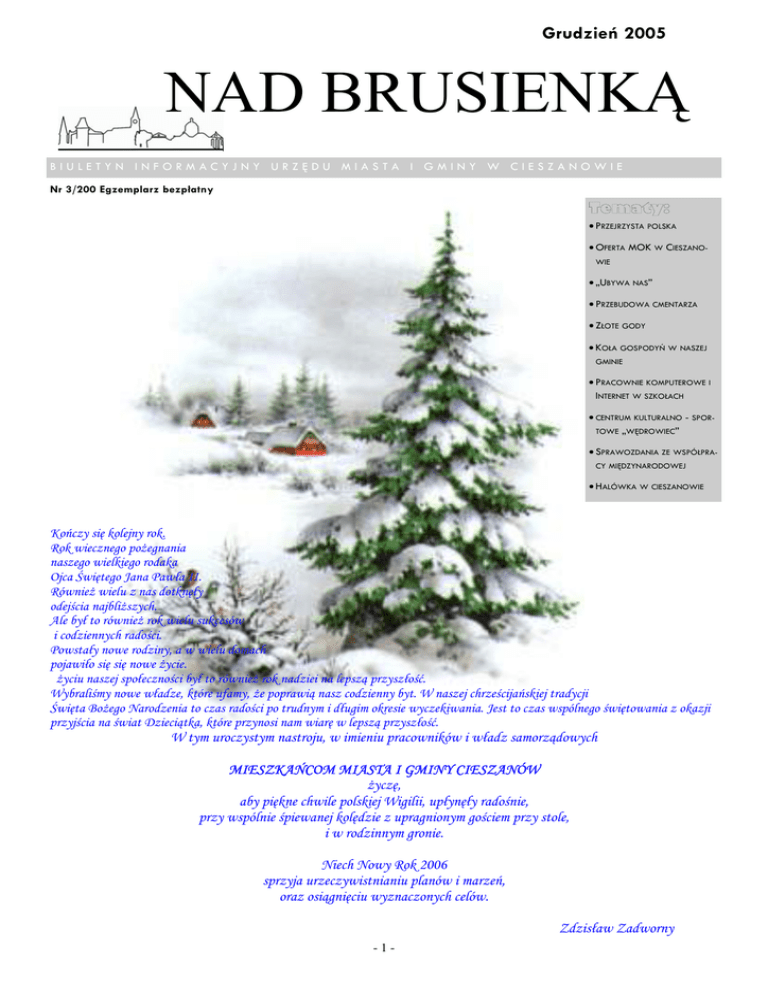 Grudzień 2005 NAD BRUSIENKĄ BIULETYN INFORMACYJNY URZĘDU MIASTA I GMINY W CIESZANOWIE Nr 3/200 Egzemplarz bezpłatny • PRZEJRZYSTA POLSKA • OFERTA MOK W CIESZANOWIE • „UBYWA NAS” • PRZEBUDOWA CMENTARZA • ZŁOTE GODY • KOŁA GOSPODYŃ W NASZEJ GMINIE • PRACOWNIE KOMPUTEROWE I INTERNET W SZKOŁACH • CENTRUM KULTURALNO - SPORTOWE „WĘDROWIEC” • SPRAWOZDANIA ZE WSPÓŁPRACY MIĘDZYNARODOWEJ • HALÓWKA W CIESZANOWIE Kończy się kolejny rok. Rok wiecznego pożegnania naszego wielkiego rodaka Ojca Świętego Jana Pawła II. Również wielu z nas dotknęły odejścia najbliższych. Ale był to również rok wielu sukcesów i codziennych radości. Powstały nowe rodziny, a w wielu domach pojawiło się się nowe życie. życiu naszej społeczności był to również rok nadziei na lepszą przyszłość. Wybraliśmy nowe władze, które ufamy, że poprawią nasz codzienny byt. W naszej chrześcijańskiej tradycji Święta Bożego Narodzenia to czas radości po trudnym i długim okresie wyczekiwania. Jest to czas wspólnego świętowania z okazji przyjścia na świat Dzieciątka, które przynosi nam wiarę w lepszą przyszłość. W tym uroczystym nastroju, w imieniu pracowników i władz samorządowych MIESZKAŃCOM MIASTA I GMINY CIESZANÓW życzę, aby piękne chwile polskiej Wigilii, upłynęły radośnie, przy wspólnie śpiewanej kolędzie z upragnionym gościem przy stole, i w rodzinnym gronie. Niech Nowy Rok 2006 sprzyja urzeczywistnianiu planów i marzeń, oraz osiągnięciu wyznaczonych celów. Zdzisław Zadworny -1- Biuletyn Informacyjny Miasta i Gminy Cieszanów CIESZANÓW W PRZEJRZYSTEJ POLSCE Urząd Miasta i Gminy Cieszanów – jako jeden z 775 samorządów – podjął się wdrażania szeregu zadań w ramach akcji społecznej „Przejrzysta Polska”, których celem jest poprawa funkcjonowania w myśl zasad: przejrzystości, braku tolerancji dla korupcji, partycypacji społecznej, przewidywalności, fachowości i rozliczalności. Realizacja 15 zadań (6 obligatoryjnych i 9 fakultatywnych) w zakresie ww. zasad przyczyni się do stworzenia urzędu przyjaznego mieszkańcom, co jest jednym z priorytetów dla władz samorządowych Cieszanowa. Uczestniczymy w akcji, która jest przedsięwzięciem długofalowym, za pomocą którego promujemy właściwe standardy życia publicznego oraz pobudzamy aktywność obywatelską. Przyjęte w bieżącym roku w ramach akcji procedury wprowadzają na stałe do praktyki samorządu coroczne działania. Prace nad wdrażaniem akcji „Przejrzysta Polska” w gminie Cieszanów dobiegają końca, a obecnie realizacja poszczególnych zasad i zadań przedstawia się następująco: I. ZASADA PRZEJRZYSTOŚCI. Opracowanie opisu usług świadczonych w samorządzie – Zidentyfikowano 63 usługi z których interesanci korzystają najczęściej w tut. urzędzie. Pracownicy opracowali karty usług zawierające wszystkie niezbędne do załatwienia sprawy informacje oraz potrzebne w tym zakresie druki. Karty usług wraz z formularzami wniosków są dostępne do pobrania na stronie internetowej urzędu, a także w formie papierowej w specjalnie do tego celu przeznaczonym regale z wnękami, który umieszczony został na głównym korytarzu urzędu. Zgodnie z procedurą przyjętą Zarządzeniem Nr 88/2005 Burmistrza Miasta i Gminy Cieszanów z dnia 15-11 2005 r. karty usług będą na bieżąco aktualizowane, a ich funkcjonowanie podlegać będzie corocznej ocenie. Uruchomienie samorządowego serwisu informacyjnego – W Urzędzie Miasta i Gminy Cieszanów wyłoniono w drodze konkursu pracownika ds. wdrożenia i prowadzenia samorządowego serwisu informacyjnego w osobie Pana Radosława Pałczyńskiego. Procedurę działania SSI określa Zarządzenie Nr 70A/2005 Burmistrza Miasta i Gminy Cieszanów z dnia 22-08-2005 r. Celem zadania jest umożliwienie społeczności lokalnej udziału w życiu publicznym, poprzez dostęp do informacji zarówno o planowanych przez samorząd działaniach i wydarzeniach, jak i podjętych już decyzjach. Opracowanie systemu oznakowania wewnętrznego w urzędzie – W celu ułatwienia interesantom poruszania się po urzędzie wykonano tablice informacyjne z nazwami komórek organizacyjnych i numerami pokojów, przy drzwiach do poszczególnych pokoi umieszczono informacje o nazwie komórki, osobach, które w danym pokoju pracują, oraz zakresie załatwianych spraw. Wszyscy pracownicy posiadają identyfikatory. Zarządzeniem Nr 70/2005 Burmistrza Miasta i Gminy Cieszanów z dnia 22-08-2005 r. wprowadzona została procedura aktualizacji w systemie oznakowania wewnętrznego tut. urzędu. II.ZASADA BRAKU TOLERANCJI DLA KORUPCJI. Wypracowanie i wdrożenie kodeksu etycznego pracowników urzędu – Kodeks etyczny pracowników Urzędu Miasta i Gminy Cieszanów stanowi zbiór zasad i wartości jakimi kierują się pracownicy podczas wykonywania zadań służbowych w miejscu pracy, a także poza nim. Dokument został stworzony przez pracowników i nie podlegał przyjęciu w formie zarządzenia. W dniu 19 sierpnia br. wszyscy pracownicy Urzędu Miasta i Gminy Cieszanów zaakceptowali ostateczną treść Kodeksu składając pod jego tekstem swoje podpisy. Dokument został oprawiony i umieszczony w głównym korytarzu urzędu (naprzeciw sekretariatu). Przygotowanie i wdrożenie kodeksu etycznego radnego – Złożony z Radnych Rady Miejskiej w Cieszanowie zespół zadaniowy na podstawie wypełnionych przez Radnych ankiet wypracował treść -2- Kodeksu. Dokument ten został przyjęty przez Radnych Rady Miejskiej w Cieszanowie w dniu 30 sierpnia br. Jest on zbiorem zasad postępowania jakimi kierują się Radni sprawując powierzony im mandat. Pełny tekst Kodeksu został umieszczony w sali narad tut. urzędu. III. ZASADA PARTYCYPACJI SPOŁECZNEJ. Opracowanie i wdrożenie programu współpracy z organizacjami pozarządowymi – Opracowana wspólnie z organizacjami pozarządowymi „Karta współpracy….” została przyjęta U