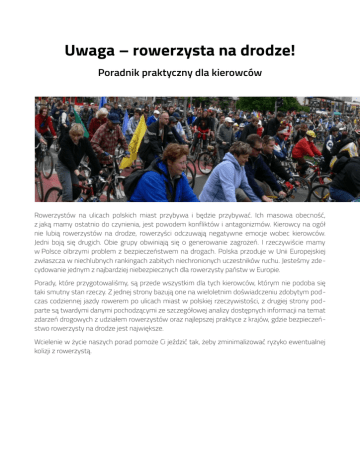 Uwaga – rowerzysta na drodze! Poradnik praktyczny dla kierowców Rowerzystów na ulicach polskich miast przybywa i będzie przybywać. Ich masowa obecność, z jaką mamy ostatnio do czynienia, jest powodem konfliktów i antagonizmów. Kierowcy na ogół nie lubią rowerzystów na drodze, rowerzyści odczuwają negatywne emocje wobec kierowców. Jedni boją się drugich. Obie grupy obwiniają się o generowanie zagrożeń. I rzeczywiście mamy w Polsce olbrzymi problem z bezpieczeństwem na drogach. Polska przoduje w Unii Europejskiej zwłaszcza w niechlubnych rankingach zabitych niechronionych uczestników ruchu. Jesteśmy zdecydowanie jednym z najbardziej niebezpiecznych dla rowerzysty państw w Europie. Porady, które przygotowaliśmy, są przede wszystkim dla tych kierowców, którym nie podoba się taki smutny stan rzeczy. Z jednej strony bazują one na wieloletnim doświadczeniu zdobytym podczas codziennej jazdy rowerem po ulicach miast w polskiej rzeczywistości, z drugiej strony podparte są twardymi danymi pochodzącymi ze szczegółowej analizy dostępnych informacji na temat zdarzeń drogowych z udziałem rowerzystów oraz najlepszej praktyce z krajów, gdzie bezpieczeństwo rowerzysty na drodze jest największe. Wcielenie w życie naszych porad pomoże Ci jeździć tak, żeby zminimalizować ryzyko ewentualnej kolizji z rowerzystą. I. Odrzuć stereotypy i uprzedzenia Nie taki rowerzysta straszny, jak go malują W Polsce dominuje bardzo silny negatywny stereotyp związany z obecnością rowerzystów na drodze. Uważa się rowerzystów za grupę powodującą szczególnie dużo zagrożenia w ruchu. Jednak w świetle faktów rowerzyści są winni mniej niż połowie wypadków, w których uczestniczą. Czyli nie jeżdżą wcale gorzej niż kierowcy, a zagrożenie, jakie generują dla innych, jest nieporównywalnie mniejsze z uwagi na masę i osiągane prędkości. Praktycznie nie notuje się przypadków, kiedy rowerzysta swoim zachowaniem spowodował śmierć kogoś więcej niż samego siebie. Typowe wypadki z rowerzystami Statysty wypadków mówią jednoznacznie. Jest zupełnie inaczej, niż wydaje się większości. Typowy wypadek z udziałem rowerzysty zdarza się w biały dzień, przy dobrej pogodzie, na skrzyżowa niu i ma charakter uderzenie bocznego. Brak oświetlenia i jazda rowerzysty pod wpływem alkoholu, o których trąbią chętnie media i z którymi tak zaciekle walczy polska policja, są przyczyną zaledwie kilku procent ogółu zdarzeń. Nawet gdyby udało się wyeliminować całkowicie takie zachowania, liczba wypadków z rowerzystami nie spadnie w sposób zauważalny, bo główny problem tkwi zupełnie gdzie indziej. II. Zrozum zachowania rowerzysty Rowerzysta się boi Chociaż dużo prawdy jest w stwierdzeniu, że rowerzyści łamią bardzo często przepisy ruchu, to nie zawsze powoduje to zagrożenia. Można powiedzieć nawet, że większość nieprzepisowych zachowań rowerzysty wynika z chęci zapewnienia sobie bezpieczeństwa lub zwiększenia poczucia bezpieczeństwa (nie zawsze jedno idzie z drugim w parze, ale to zupełnie inna kwestia). Rowerzysta na przykład wybiera nieprzepisową jazdę po chodniku, bo na ulicach samochody poruszają się z prędkościami o wiele przekraczającymi dopuszczalne prawem normy i słusznie się ich obawia. Takie nielegalne zachowanie spotyka się akurat ze sporą akceptacją kierowców. Niestety konsekwencją jazdy po chodniku jest przejeżdżanie po pasach, co już jest dla nich problemem. Rowerzysta niechętnie się zatrzymuje Trzeba pamiętać, że rowerzysta, będąc silnikiem pojazdu, w naturalny sposób stara się ograniczyć do minimum liczbę zatrzymań, gdyż ponowne rozpędzanie kosztuje go dużo wysiłku. Gdy będziesz o tym pamiętać, łatwiej przewidzisz również inne prawdopodobne zachowania rowerzysty, zarówno te legalne, jak i nielegalne. Miasto nie jest przyjazne dla rowerzysty Nie można też zapomnieć o tym, że polskie miasta nie są obecnie w pełni przygotowane do ruchu rowerowego. Dominują u nas źle zaprojektowane ścieżki, które wcale nie zwiększają ich bezpieczeństwa. W zasadzie można powiedzieć, że rowerzyści mają w mieście do dyspozycji tor z przeszkodami, po którym jazda absolutnie zgodna z przepisami jest możliwa tylko czysto teoretycznie. Jeśli oburzasz się na to stwierdzeniem, najlepiej spróbuj zamiast samochodem pojeździć rowerem przez tydzień, a przekonasz się, o czym mowa. III. Noga z gazu Najważniejszym grzechem polskich kierowców jest jazda z nadmierną prędkością. Średnia prędkość samochodu jadącego przez polskie miejscowości (według danych MSWiA) wynosi 76 km/h, podczas gdy na obszarze zabudowanym dozwolona jest jazda z szybkością nie większą niż 50km/h! Jeżeli udałoby się zmniejszyć prędkość samochodów o 5 procent, to liczba wypadków zudziałem rowerzystów spadłaby o 10 procent, a liczba wypadków śmiertelnych o 20 procent. Stosowanie się do ograniczeń prędkości spowodowałoby, że jazda rowerem po ulicach stałaby się bezpieczna. IV. Zaakceptuj rowerzystę Prawda jest taka, że rowerzysta ma pełne prawo być na drodze – tak samo, jak Ty. Musisz pogo dzić się z tym faktem. Jazda ulicą jest jego obowiązkiem. Nie wszędzie da się wybudować drogi rowerowe, a te, które istnieją, zawsze gdzieś będą się przecinać z ulicami. Czasy, kiedy ruch rowerowy w polskich miastach był znikomy, przeszły do historii, a w dobie korków i rosnących cen paliwa liczba rowerzystów będzie stale wzrastać. Staraj się patrzeć na rowerzystów pozytywnie, przez pryzmat korzyści, jakie wszyscy czerpią z ich obecności na ulicach. Jeden rower więcej to jedno auto w korku mniej. Rower nie hałasuje, nie zanieczyszcza i nie zabija pieszych. Więcej rowerzystów oznacza lepszą jakość życia również dla ciebie. Nie zapominaj o tym, kiedy mijasz ich na drodze. V. Uważaj na słabszych Dla bezpieczeństwa rowerzysty kluczowe jest