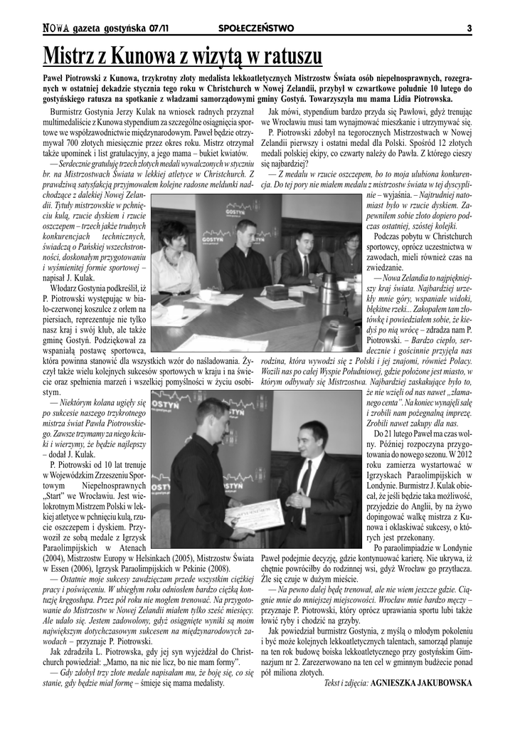 NOWA gazeta gostyñska 07/11 SPO£ECZEÑSTWO Mistrz z Kunowa z wizyt¹ w ratuszu 3 Pawe³ Piotrowski z Kunowa, trzykrotny z³oty medalista lekkoatletycznych Mistrzostw wiata osób niepe³nosprawnych, rozegranych w ostatniej dekadzie stycznia tego roku w Christchurch w Nowej Zelandii, przyby³ w czwartkowe po³udnie 10 lutego do gostyñskiego ratusza na spotkanie z w³adzami samorz¹dowymi gminy Gostyñ. Towarzyszy³a mu mama Lidia Piotrowska. Burmistrz Gostynia Jerzy Kulak na wniosek radnych przyzna³ Jak mówi, stypendium bardzo przyda siê Paw³owi, gdy¿ trenuj¹c multimedalicie z Kunowa stypendium za szczególne osi¹gniêcia spor- we Wroc³awiu musi tam wynajmowaæ mieszkanie i utrzymywaæ siê. towe we wspó³zawodnictwie miêdzynarodowym. Pawe³ bêdzie otrzyP. Piotrowski zdoby³ na tegorocznych Mistrzostwach w Nowej mywa³ 700 z³otych miesiêcznie przez okres roku. Mistrz otrzyma³ Zelandii pierwszy i ostatni medal dla Polski. Sporód 12 z³otych tak¿e upominek i list gratulacyjny, a jego mama bukiet kwiatów. medali polskiej ekipy, co czwarty nale¿y do Paw³a. Z którego cieszy Serdecznie gratulujê trzech z³otych medali wywalczonych w styczniu siê najbardziej? br. na Mistrzostwach wiata w lekkiej atletyce w Christchurch. Z Z medalu w rzucie oszczepem, bo to moja ulubiona konkurenprawdziw¹ satysfakcj¹ przyjmowa³em kolejne radosne meldunki nad- cja. Do tej pory nie mia³em medalu z mistrzostw wiata w tej dyscyplichodz¹ce z dalekiej Nowej Zelannie wyjania. Najtrudniej natodii. Tytu³y mistrzowskie w pchniêmiast by³o w rzucie dyskiem. Zaciu kul¹, rzucie dyskiem i rzucie pewni³em sobie z³oto dopiero podoszczepem trzech jak¿e trudnych czas ostatniej, szóstej kolejki. konkurencjach technicznych, Podczas pobytu w Christchurch wiadcz¹ o Pañskiej wszechstronsportowcy, oprócz uczestnictwa w noci, doskona³ym przygotowaniu zawodach, mieli równie¿ czas na i wymienitej formie sportowej zwiedzanie. napisa³ J. Kulak. Nowa Zelandia to najpiêkniejW³odarz Gostynia podkreli³, i¿ szy kraj wiata. Najbardziej urzeP. Piotrowski wystêpuj¹c w biak³y mnie góry, wspania³e widoki, ³o-czerwonej koszulce z or³em na b³êkitne rzeki... Zakopa³em tam z³opiersiach, reprezentuje nie tylko tówkê i powiedzia³em sobie, ¿e kienasz kraj i swój klub, ale tak¿e dy po ni¹ wrócê zdradza nam P. gminê Gostyñ. Podziêkowa³ za Piotrowski. Bardzo ciep³o, serwspania³¹ postawê sportowca, decznie i gocinnie przyjê³a nas która powinna stanowiæ dla wszystkich wzór do naladowania. ¯y- rodzina, która wywodzi siê z Polski i jej znajomi, równie¿ Polacy. czy³ tak¿e wielu kolejnych sukcesów sportowych w kraju i na wie- Wozili nas po ca³ej Wyspie Po³udniowej, gdzie po³o¿one jest miasto, w cie oraz spe³nienia marzeñ i wszelkiej pomylnoci w ¿yciu osobi- którym odbywa³y siê Mistrzostwa. Najbardziej zaskakuj¹ce by³o to, stym. ¿e nie wziêli od nas nawet z³ama Niektórym kolana ugiê³y siê nego centa. Na koniec wynajêli salê po sukcesie naszego trzykrotnego i zrobili nam po¿egnaln¹ imprezê. mistrza wiat Paw³a PiotrowskieZrobili nawet zakupy dla nas. go. Zawsze trzymamy za niego kciuDo 21 lutego Pawe³ ma czas wolki i wierzymy, ¿e bêdzie najlepszy ny. Póniej rozpoczyna przygo doda³ J. Kulak. towania do nowego sezonu. W 2012 P. Piotrowski od 10 lat trenuje roku zamierza wystartowaæ w w Wojewódzkim Zrzeszeniu SporIgrzyskach Paraolimpijskich w towym Niepe³nosprawnych Londynie. Burmistrz J. Kulak obieStart we Wroc³awiu. Jest wieca³, ¿e jeli bêdzie taka mo¿liwoæ, lokrotnym Mistrzem Polski w lekprzyjedzie do Anglii, by na ¿ywo kiej atletyce w pchniêciu kul¹, rzudopingowaæ walkê mistrza z Kucie oszczepem i dyskiem. Przynowa i oklaskiwaæ sukcesy, o któwozi³ ze sob¹ medale z Igrzysk rych jest przekonany. Paraolimpijskich w Atenach Po paraolimpiadzie w Londynie (2004), Mistrzostw Europy w Helsinkach (2005), Mistrzostw wiata Pawe³ podejmie decyzjê, gdzie kontynuowaæ karierê. Nie ukrywa, i¿ w Essen (2006), Igrzysk Paraolimpijskich w Pekinie (2008). chêtnie powróci³by do rodzinnej wsi, gdy¿ Wroc³aw go przyt³acza. Ostatnie moje sukcesy zawdziêczam przede wszystkim ciê¿kiej le siê czuje w du¿ym miecie. pracy i powiêceniu. W ubieg³ym roku odnios³em bardzo ciê¿k¹ kon Na pewno dalej bêdê trenowa³, ale nie wiem jeszcze gdzie. Ci¹tuzjê krêgos³upa. Przez pó³ roku nie mog³em trenowaæ. Na przygoto- gnie mnie do mniejszej miejscowoci. Wroc³aw mnie bardzo mêczy wanie do Mistrzostw w Nowej Zelandii mia³em tylko szeæ miesiêcy. przyznaje P. Piotrowski, który oprócz uprawiania sportu lubi tak¿e Ale uda³o siê. Jestem zadowolony, gdy¿ osi¹gniête wyniki s¹ moim ³owiæ ryby i chodziæ na grzyby. najwiêkszym dotychczasowym sukcesem na miêdzynarodowych zaJak powiedzia³ burmistrz Gostynia, z myl¹ o m³odym pokoleniu wodach przyznaje P. Piotrowski. i byæ mo¿e kolejnych lekkoatletycznych talentach, samorz¹d planuje Jak zdradzi³a L. Piotrowska, gdy jej syn wyje¿d¿a³ do Christ- na ten rok budowê boiska lekkoatletycznego przy gostyñskim Gimchurch powiedzia³: Mamo, na nic nie licz, bo nie mam formy. nazjum nr 2. Zarezerwowano na ten cel w gminnym bud¿ecie ponad Gdy zdoby³ trzy z³ote medale napisa³am mu, ¿e bojê siê, co siê pó³ miliona z³otych. stanie, gdy bêdzie mia³ formê mieje siê mama medalisty. Tekst i zdjêcia: AGNIESZKA JAKUBOWSKA
