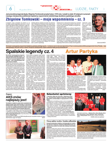 6 LUDZIE, FAKTY 18 grudnia 2014 r. Jest prawdziwą legendą Spały. Zbigniew Tomkowski przybył tutaj w 1970 roku i osiadł na stałe.W kolejnych numerach naszego miesięcznika publikować będziemy wspomnienia wieloletniego dyrektora spalskiego ośrodka. Zbigniew Tomkowski – moje wspomnienia – cz. 3 Z biegiem czasu przestało nas dziwić to, że do Spały zaczęli przyjeżdżać sportowcy z innych krajów. Byli piłkarze Bolton Wanderers, ekipy klubowe z Niemiec czy Australii. Także rugbiści z Irlandii. To też trochę dzięki nim Spała zawdzięcza powstanie kriokomory. Dla odnowy biologicznej zmrożenie organizmu ma bardzo istotne znaczenie. Rugbiści, którzy przyjechali do Spały, trenowali naprawdę bardzo ciężko – trzy razy dziennie. W Spale pojawili się z rekomendacji naszego byłego świetnego długodystansowca Zbyszka Orywała. Znosili tu u nas ogromne obciążenia. Po trzecim pobycie uznali, że nie mogą obyć się bez kriokomory.Taką samą dawkę treningową szkoleniowcy zaaplikowali im w Irlandii bez odświeżających zabiegów.W drużynie doszło do buntu, bo bez odpo- wiedniej odnowy mięśnie po prostu nie wytrzymywały. I dlatego jak Irlandczycy chcą ciężko popracować to przyjeżdżają do Spały.Czy na Zachodzie nie mogliby zastosować krioterapii? Ależ oczywiście, że by mogli. Kriokomory zaczęły masowo powstawać w Szwecji czy Niemczech.Tu jednak chodzi o biznes. Zdają sobie sprawę z tego zwłaszcza w Stanach Zjednoczonych.Gdyby tam na szeroką skalę zastosowano krioterapię, to spadłaby u nich bardzo dochodowa sprzedaż leków.To nie jest tak, że mamy jakąś wybitną technikę. Prawda jest taka – nam to się opłaca, a im niezupełnie. Zresztą ta nasza kriokomora jest wykorzystywana nie tylko przez sportowców. Na zabiegi przyjeżdżają biznesmeni, menedżerowie. Mają po 10-15 posiedzeń, a potem wyjeżdżają. Ostatecznie na stworzenie kriokomory namówił mnie trener reprezentacji polskich czterystumetrowców Józef Lisowski. Chodził za mną pół roku, aż się przekonałem. Pojechałem specjalnie do profesora Zagrobelnego doWrocławia.O tym jak krioterapia jest korzystna dla organizmu przekonałem się na własnej skórze. Załatwić sprawę pomógł mi ostatecznie ówczesny minister sportu Jacek Dębski.Może, jak się później okazało nie była to postać świetlana, ale mnie wtedy pomógł. Standardy w środku mamy zróżnicowane. W luksusach mieszkali i mieszkali najwięksi mistrzowie. Oni jednak na to zasługują i mieszkają tak jak chcą. Pokoje o niższym standardzie także wyglądają lepiej. Wzmocnione zostały ścianki gipsowe, większość pokojów to pomieszczenia dwu- i trzyosobowe. Naszą zaletą jest także metodologia żywienia, a na pewno fakt, że menu mogą kształtować sami sportowcy. Zawsze robiliśmy wszystko, aby nasi goście czuli się jak u siebie w domu. Nasza zasada brzmiała: – Nigdy nie jest tak dobrze, żeby nie mogło być jeszcze lepiej. I to się sprawdzało przez te wszystkie lata. Opracował MIOS Na łamach naszej gazety przypominać będziemy gwiazdy polskiego sportu – te obecne oraz te nieco już zapomniane.W tym numerze postanowiliśmy przypomnieć Artura Partykę – nasz najwybitniejszy skoczek wzwyż w historii. Partyka do dzisiaj bardzo chętnie odwiedza Spałę, jest jej ambasadorem. Spalskie legendy cz. 4 Na łamach naszej gazety przypominamy gwiazdy polskiego sportu – te obecne oraz te nieco już zapomniane. W tym numerze będzie to Artur Partyka – nasz najwybitniejszy skoczek wzwyż w historii. Partyka do dzisiaj bardzo chętnie odwiedza Spałę, jest jej ambasadorem. Wcześniej przez lata odwiedzał COS w poszukiwaniu sportowej formy. Prawie zawsze z medalowym powodzeniem. Był jednym z pomysłodawców lekkoatletycznych mitingów skoku wzwyż „Opoczno”, które w latach 19942001 odbywały się w Spale. Partyka bardzo szybko wypełnił pustkę w polskim męskim skoku wzwyż po Jacku Wszole. Mistrz olimpijski z Montrealu (1976) i wicemistrz (Moskwa 1980) kończył karierę, a Partyka dopiero wypływał na szerokie wody.Zaczął rewelacyjnie – od tytułu mistrza Europy juniorów (Birmingham 1987) i tytułu mistrza świata (Sudbury 1988).19-latek pojechał na Igrzyska Olimpijskie w Seulu gdzie jednak zjadła go młodzieńcza trema. Podopieczny Edwarda Hatali szybko wyciągnął z tego nieudanego startu wnioski i już dwa lata później został halowym mistrzem Europy w Glasgow (2,33). Najważniejsze jego sukcesy to dwa medale olimpijskie (brąz – Barcelona 1992 i srebro – Atlanta 1996).W Stanach Zjednoczonych był bliski złota. Przeskoczył go w ostatniej próbie Charles Austin, który skoczył aż 2,39. Partyka wyrównał swój rekord Polski (2,37), ale wystarczyło to tylko do srebra. Niespełna miesiąc później na mitingu w Eberstadt dołożył centymetr do swojego rekordowego osiągnięcia – 2,38.To do dziś rekord Polski. Zawodnik ŁKS Łódź zdobył również trzy medale mistrzostw świata na otwartym stadionie (2 srebrne i brąz), mistrzostwo i wicemistrzostwo Europy oraz srebro halowych mistrzostw świata. Partyka należał do najpopularniejszych polskich sportowców ostatniej dekady XX wieku – był laureatem Plebiscytu Przeglądu Sportowego nieprzerwanie w latach 1992-1998. 6-krotnie zdobywał Złote Kolce – nagrodę dla najlep- szego lekkoatlety sezonu w Polsce (1991-1995, 1998). Ośmiokrotnie (1991-1998) był notowany w dziesiątce rankingu światowego Track and Field News. 12-krotny mistrz Polski (19892000). Jeszcze zimą 2000 roku wydawało się, że Partyka będzie jednym z faworytów do zwycięstwa w Sydney. W halowych zawodach w Spale skoczył aż 2,37. W sezonie letnim nie było jednak już tak wspaniale. Partyka bezskutecznie szukał najwyższej formy, która pozwalałaby mu walczyć o trzeci olimpijski medal. Ostatecznie zrezygnował z wyjazdu na Igrzyska. Nie chciał być turystą. – W obecnej dyspozycji nie jestem w stanie powalczyć o
