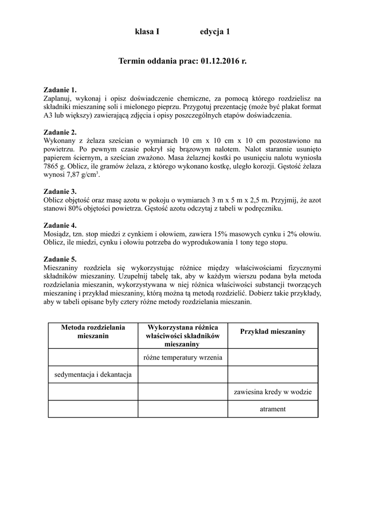 klasa I edycja 1 Termin oddania prac: 01.12.2016 r. Zadanie 1. Zaplanuj, wykonaj i opisz doświadczenie chemiczne, za pomocą którego rozdzielisz na składniki mieszaninę soli i mielonego pieprzu. Przygotuj prezentację (może być plakat format A3 lub większy) zawierającą zdjęcia i opisy poszczególnych etapów doświadczenia. Zadanie 2. Wykonany z żelaza sześcian o wymiarach 10 cm x 10 cm x 10 cm pozostawiono na powietrzu. Po pewnym czasie pokrył się brązowym nalotem. Nalot starannie usunięto papierem ściernym, a sześcian zważono. Masa żelaznej kostki po usunięciu nalotu wyniosła 7865 g. Oblicz, ile gramów żelaza, z którego wykonano kostkę, uległo korozji. Gęstość żelaza wynosi 7,87 g/cm3. Zadanie 3. Oblicz objętość oraz masę azotu w pokoju o wymiarach 3 m x 5 m x 2,5 m. Przyjmij, że azot stanowi 80% objętości powietrza. Gęstość azotu odczytaj z tabeli w podręczniku. Zadanie 4. Mosiądz, tzn. stop miedzi z cynkiem i ołowiem, zawiera 15% masowych cynku i 2% ołowiu. Oblicz, ile miedzi, cynku i ołowiu potrzeba do wyprodukowania 1 tony tego stopu. Zadanie 5. Mieszaniny rozdziela się wykorzystując różnice między właściwościami fizycznymi składników mieszaniny. Uzupełnij tabelę tak, aby w każdym wierszu podana była metoda rozdzielania mieszanin, wykorzystywana w niej różnica właściwości substancji tworzących mieszaninę i przykład mieszaniny, którą można tą metodą rozdzielić. Dobierz takie przykłady, aby w tabeli opisane były cztery różne metody rozdzielania mieszanin. Metoda rozdzielania mieszanin Wykorzystana różnica właściwości składników mieszaniny Przykład mieszaniny różne temperatury wrzenia sedymentacja i dekantacja zawiesina kredy w wodzie atrament
