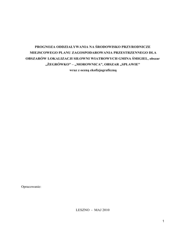 PROGNOZA ODDZIAŁYWANIA NA ŚRODOWISKO PRZYRODNICZE MIEJSCOWEGO PLANU ZAGOSPODAROWANIA PRZESTRZENNEGO DLA OBSZARÓW LOKALIZACJI SIŁOWNI WIATROWYCH GMINA ŚMIGIEL, obszar „śEGRÓWKO” – „MOROWNICA”, OBSZAR „SPŁAWIE” wraz z oceną ekofizjograficzną Opracowanie: LESZNO - MAJ 2010 1 SPIS TREŚCI 1. OGÓLNA CHARAKTERYSTYKA, PRZEDMIOT , CEL I METODYKA OPRACOWANIA PROGNOZY.........3 2. PODSTAWY PRAWNE OPRACOWANIA.....................................................................................................................7 3.OCENA EKOFIZJOGRAFICZNA REJONU OPRACOWANIA..................................................................................11 3.1 CHARAKTERYSTYKA ŚRODOWISKA PRZYRODNICZEGO................................................................................11 a/ PołoŜenie geograficzne i ukształtowanie powierzchni…………………………………………......…………..……..11 b/ Budowa geologiczna………………………………………………………………………………………...……..…….11 c/ Stosunki wodne................................................................................................................................................................12 - wody powierzchniowe.................................................................................................................12 - wody podziemne.........................................................................................................................15 d/ Gleby……………………………………………………………………………………………………....................…17 e/ Warunki klimatyczne………………………………………………………………………..........................................17 f/ Szata roślinna i świat zwierzęcy.....................................................................................................................................18 3.1 POŁOśENIE W SYSTEMIE PRZYRODNICZYM.........................................................................................................19 3.2 OCENA PRZYDATNOŚCI TERENU ORAZ WARUNKI ZAGOSPODAROWANIA.................................................25 4. Prognoza skutków wpływu ustaleń planu na środowisko przyrodnicze......................................25 a/ Charakterystyka obszaru objętego planem...........................................................................................................................25 a.1. Teren opracowania....................................................................................................................................................25 a.2. Projektowany zakres zmian........................................................................................................................................26 b/ Analiza ustaleń i rozwiązań zawartych w projekcie planu. Identyfikacja potencjalnych kategorii oddziaływani na środowisko –przewidywane znaczące oddziaływanie na środowisko……………….... ……………………………………..29 b.1. Analiza ustaleń i rozwiązań zawartych w projekcie…………………………………………………….……………29 b.2. Przekształcenie powierzchni ziemi, klimatu, krajobrazu.......................................................................................... ..42 b.3. Wpływ zmian na stosunki wodne............................................................................................................................. ..44 b.4. Zanieczyszczenie powietrza.................................................................................................................................... ...45 b.5. Hałas..................................................................................................................................................................... ......50 b.6. Środowisko biotyczne..................................................................................................................................................53 b.7 Strefa "W".....................................................................................................................................................................53 b.8. Pole elektromagnetyczne............................................................................................................................................ .53 b.9. Ryzyko powstawania awarii.........................................................................................................................................54 5. OCENA STANU I FUNKCJONOWANIA ŚRODOWISKA W RELACJI Z USTALENIAMI PROJEKYU PLANU......................... ……......................................................................................................................................................55 a.1. Ocena odporności na degradację i zdolności do regeneracji środowiska, wynikająca z uwarunkowań określonych w opracowaniu ekofizjograficznym przy braku realizacji ustaleń planu............................................................................58 a.2. Ocena rozwiązań funkcjonalno-przestrzennych ............................................................................................................58 a.3 Ocena warunków zagospodarowania określonych w projekcie ......................................................................................58 a.4.Ocena zagroŜeń dla środowiska.......................................................................................................................................59 a.5. Ocena skutków dla istniejących form ochrony i innych obszarów chronionych.............................................................61 a..6. Ocena zmian w krajobrazie............................................................................................................................................61 6