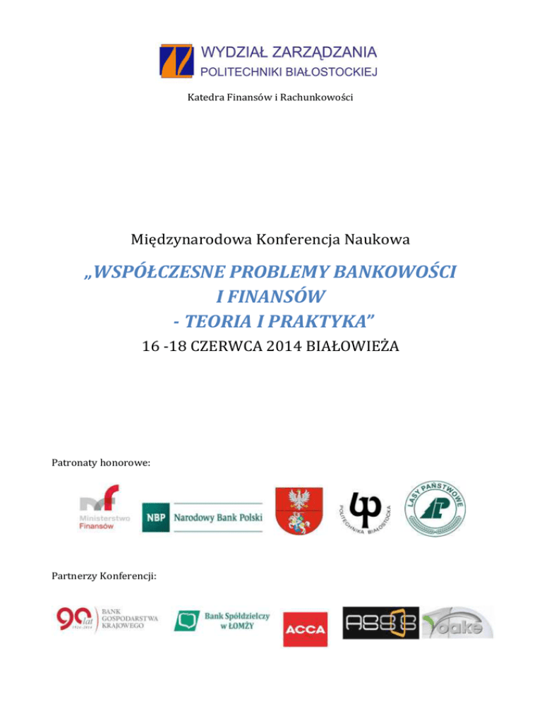 Katedra Finansów i Rachunkowości Międzynarodowa Konferencja Naukowa „WSPÓŁCZESNE PROBLEMY BANKOWOŚCI I FINANSÓW - TEORIA I PRAKTYKA” 16 -18 CZERWCA 2014 BIAŁOWIEŻA Patronaty honorowe: Partnerzy Konferencji: SZCZEGÓŁOWY PROGRAM KONFERENCJI BEST WESTERN HOTEL ŻUBRÓWKA W BIAŁOWIEŻY, UL. OLGI GABIEC 6, 17-230 BIAŁOWIEŻA WWW.HOTEL-ZUBROWKA.PL PONIEDZIAŁEK 16.06.2014 od 13:00 rejestracja uczestników 14:00 –15:00 obiad w restauracji (sala bankietowa) 15:00 –16.00 uroczyste otwarcie konferencji J. Z. Dworzański, Marszałek Województwa Podlaskiego prof. dr hab. inż. Jan Dorosz, Prorektor ds. Nauki dr hab. G. Łaska, prof. PB, Prorektor ds. Studenckich i Dydaktyki prof. zw. dr hab. inż. J. Nazarko, Dziekan Wydziału Zarządzania PB S. A. Grudzińska, Dyrektor PROT, Prezentacja województwa podlaskiego i Białowieży 16.00– 17:00 SESJA PLENARNA I (j. angielski, j. polski) Prowadzący: prof. dr hab. J. Nowakowski (SGH w Warszawie) prof. dr hab. M. Zaleska, Banki na krawędzi – upadłość czy resolution?, Narodowy Bank Polski prof. dr hab. A. Janc, Kanały promocji usług bankowych i ich postrzeganie przez klientów banków, Uniwersytet Ekonomiczny w Poznaniu prof. dr hab. M. Żukowski, Dobra kondycja finansowa sektora banków zobowiązuje do wspierania rozwoju gospodarki, Katolicki Uniwersytet Lubelski Jana Pawła II 17.00 –17.30 przerwa kawowa 17:30– 18:30 SESJA PLENARNA II (j. angielski) Prowadzący: prof. dr hab. B. Nita (UE we Wrocławiu) prof. F. Javier Sánchez Vidal, Do financially conservative companies create proportionally more jobs than the rest of the firms?, Universidad Politécnica de Cartagena, Spain prof. A. Madrid Guijarro, How financing constraints are affecting SMEs’ innovation?, Universidad Politécnica de Cartagena, Spain prof. dr hab. S. Pankova, Auditing of the financial information of the investment projects, Orenburg State University, Russia prof. M. Escat Cortés, Entrepreneurship and creativity as tools for resolve the problems of banking and finance, Autonomuos University of Madrid, Spain 20:00 uroczysta kolacja oraz wręczenie nagród w konkursie dla studentów i doktorantów (główna sala restauracyjna) WTOREK 17.06.2014 7:30 – 9:00 śniadanie 9:00 – 11:00 I SESJA PANELOWA BANKOWOŚĆ (j. polski, j. angielski) Prowadzący: dr hab. Z. Korzeb (PB) M. Kozłowski, FCCA, The review of main changes introduced to CRD IV – Basel III, BT&A Professional Advisors (ACCA Accredited Employer) dr M. Golec, Zmiany regulacyjne w spółdzielczych kasach oszczędnościowo-kredytowych a ich oferta depozytowa, Wyższa Szkoła Bankowa w Poznaniu dr M. Węgrzyńska, Dr A. Stefański, Krajowe i międzynarodowe regulacje prawa bilansowego a poziom ryzyka kredytowego, Wyższa Szkoła Bankowa w Poznaniu dr A. Sulik-Górecka, Ocena tendencji rozwojowych zamkniętych funduszy inwestycyjnych w Polsce w latach 2008-2013, Uniwersytet Ekonomiczny w Katowicach T. Kurzynka, Dyrektor Oddziału BGK w Białymstoku, BGK jako państwowy bank rozwoju 11:00 – 11:30 przerwa kawowa 11:30 – 13:30 II SESJA PANELOWA FINANSE I RACHUNKOWOŚĆ (j. polski, j. angielski) Prowadząca: dr W. Czemiel-Grzybowska (PB) prof. dr hab. W. Janik, Rola podatku dochodowego od osób prawnych w tworzeniu dochodów budżetowych i rozwoju przedsiębiorstw, Politechnika Lubelska dr hab. S. Vegera, Concept of ,,green” land accounting within the context of the state-of-the-art rent theory, Polotsk State University, Belarus dr J. Poteraj, Aktywa powszechnych towarzystw emerytalnych, Państwowa Wyższa Szkoła Informatyki i Przedsiębiorczości w Łomży dr A. Dyhdalewicz, Próba identyfikacji czynników kosztotwórczych w przedsiębiorstwach handlowych branży informatycznej na podstawie raportów rocznych, Politechnika Białostocka mgr T. Pawlonka, Struktura kapitału a koszt kapitału obcego w przedsiębiorstwach branży mięsnej w Polsce, Szkoła Główna Gospodarstwa Wiejskiego dr A. Bagieńska, Raport roczny jako narzędzie pozyskania informacji o kapitale ludzkim przedsiębiorstwa, Politechnika Białostocka 13:30 – 14:30 obiad w restauracji (sala bankietowa) 14:30 – 18:00 wycieczki fakultatywne 18:00 – 20:00 czas wolny – korzystanie z kompleksu basenowego i Centrum SPA 20:00 kolacja w restauracji (sala bankietowa) 7:30 – 9:00 śniadanie 9:00 – 11:30 III SESJA PANELOWA FINANSE MIĘDZYNARODOWE (j. rosyjski) Prowadzący: prof. dr hab. D. Pankou (PB) ŚRODA 18.06.2014 prof. dr hab. А. Bobrova, Возможности оптимизации налогов предприятием на основе международного опыта (Республика Польша и Российская Федерация), South Ural State University, Russia prof. dr hab. В. Usosky, Особенности модели экономики Беларуси и экономической политики, проводимой государством в период трансформации в рынок, Minsk State Linguistic University, Belarus prof. dr hab. I. Solskaya, prof. dr hab. E. Iwanowskaya, Трансформация инструментов финансового управления дочерними обществами в холдинге ОАО «Российские железные дороги», Irkutsk State University of Communications, Russia dr hab. L. Stefanovich, Рынок карточек и безналичных платежей в Беларуси, National Bank of the Republic of Belarus dr B. Bieriezowski, Методологические аспекты совершенствования аудита в республике Беларусь в контексте международных cтандартов аудита, Belarusian State University of Economics, Belarus 11.30-11.45 serwis kawowy 11:45 – 12:15 zakończenie konferencji 12:15 – 13:15 obiad w restauracji (sala bankietowa)