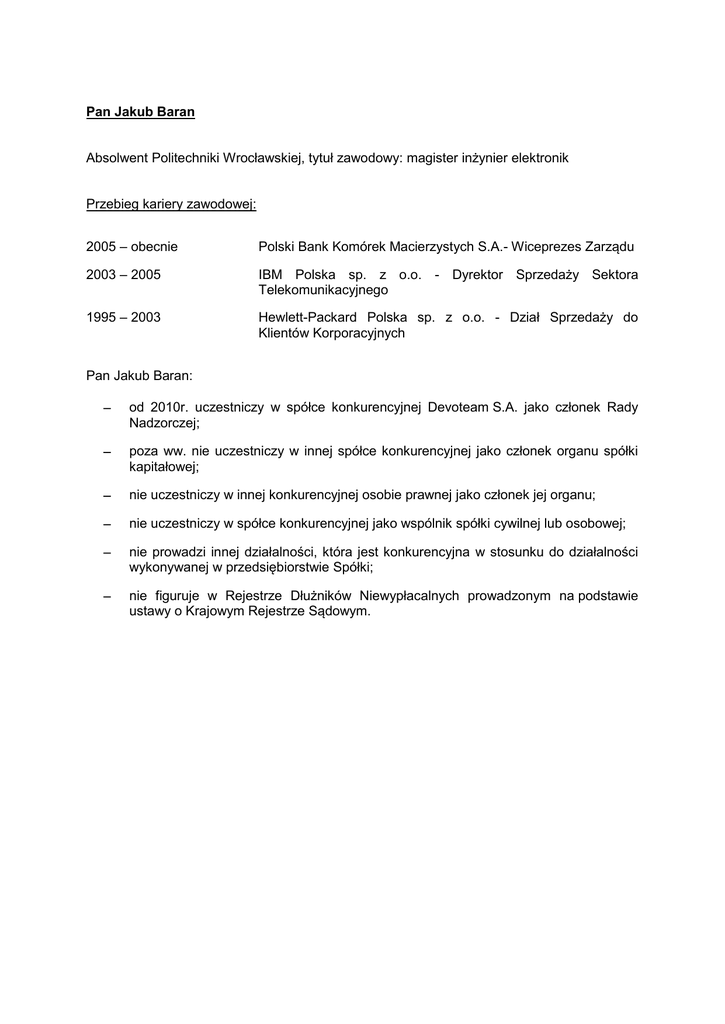 Pan Jakub Baran Absolwent Politechniki Wrocławskiej, tytuł zawodowy: magister inżynier elektronik Przebieg kariery zawodowej: 2005 – obecnie Polski Bank Komórek Macierzystych S.A.- Wiceprezes Zarządu 2003 – 2005 IBM Polska sp. z o.o. - Dyrektor Sprzedaży Sektora Telekomunikacyjnego 1995 – 2003 Hewlett-Packard Polska sp. z o.o. - Dział Sprzedaży do Klientów Korporacyjnych Pan Jakub Baran: od 2010r. uczestniczy w spółce konkurencyjnej Devoteam S.A. jako członek Rady Nadzorczej; poza ww. nie uczestniczy w innej spółce konkurencyjnej jako członek organu spółki kapitałowej; nie uczestniczy w innej konkurencyjnej osobie prawnej jako członek jej organu; nie uczestniczy w spółce konkurencyjnej jako wspólnik spółki cywilnej lub osobowej; nie prowadzi innej działalności, która jest konkurencyjna w stosunku do działalności wykonywanej w przedsiębiorstwie Spółki; nie figuruje w Rejestrze Dłużników Niewypłacalnych prowadzonym na podstawie ustawy o Krajowym Rejestrze Sądowym.