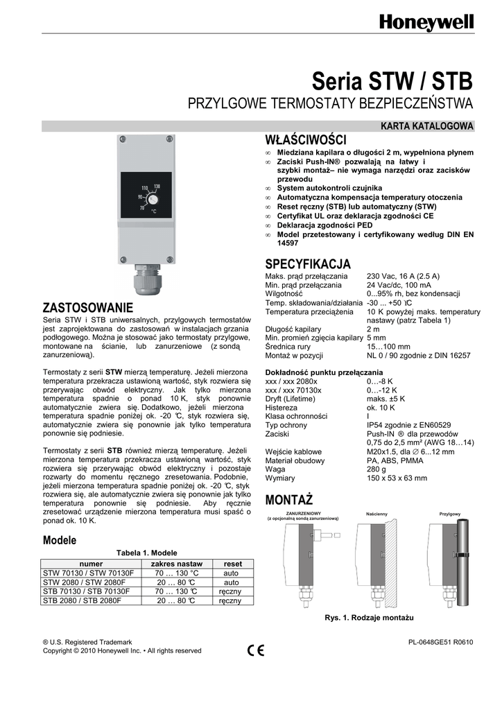 Seria STW / STB PRZYLGOWE TERMOSTATY BEZPIECZEŃSTWA KARTA KATALOGOWA WŁAŚCIWOŚCI • • • • • • • • Miedziana kapilara o długości 2 m, wypełniona płynem Zaciski Push-IN® pozwalają na łatwy i szybki montaŜ– nie wymaga narzędzi oraz zacisków przewodu System autokontroli czujnika Automatyczna kompensacja temperatury otoczenia Reset ręczny (STB) lub automatyczny (STW) Certyfikat UL oraz deklaracja zgodności CE Deklaracja zgodności PED Model przetestowany i certyfikowany według DIN EN 14597 SPECYFIKACJA ZASTOSOWANIE Seria STW i STB uniwersalnych, przylgowych termostatów jest zaprojektowana do zastosowań w instalacjach grzania podłogowego. Można je stosować jako termostaty przylgowe, montowane na ścianie, lub zanurzeniowe (z sondą zanurzeniową). Termostaty z serii STW mierzą temperaturę. JeŜeli mierzona temperatura przekracza ustawioną wartość, styk rozwiera się przerywając obwód elektryczny. Jak tylko mierzona temperatura spadnie o ponad 10 K, styk ponownie automatycznie zwiera się. Dodatkowo, jeŜeli mierzona temperatura spadnie poniŜej ok. -20 °C, styk rozwiera się, automatycznie zwiera się ponownie jak tylko temperatura ponownie się podniesie. Termostaty z serii STB równieŜ mierzą temperaturę. JeŜeli mierzona temperatura przekracza ustawioną wartość, styk rozwiera się przerywając obwód elektryczny i pozostaje rozwarty do momentu ręcznego zresetowania. Podobnie, jeŜeli mierzona temperatura spadnie poniŜej ok. -20 °C, styk rozwiera się, ale automatycznie zwiera się ponownie jak tylko temperatura ponownie się podniesie. Aby ręcznie zresetować urządzenie mierzona temperatura musi spaść o ponad ok. 10 K. 230 Vac, 16 A (2.5 A) 24 Vac/dc, 100 mA 0...95% rh, bez kondensacji -30 ... +50 °C 10 K powyŜej maks. temperatury nastawy (patrz Tabela 1) Długość kapilary 2m Min. promień zgięcia kapilary 5 mm Średnica rury 15…100 mm MontaŜ w pozycji NL 0 / 90 zgodnie z DIN 16257 Maks. prąd przełączania Min. prąd przełączania Wilgotność Temp. składowania/działania Temperatura przeciąŜenia Dokładność punktu przełączania xxx / xxx 2080x 0…-8 K xxx / xxx 70130x 0…-12 K Dryft (Lifetime) maks. ±5 K Histereza ok. 10 K Klasa ochronności I Typ ochrony IP54 zgodnie z EN60529 Zaciski Push-IN ® dla przewodów 0,75 do 2,5 mm² (AWG 18…14) Wejście kablowe M20x1.5, dla ∅ 6...12 mm Materiał obudowy PA, ABS, PMMA Waga 280 g Wymiary 150 x 53 x 63 mm MONTAś ZANURZENIOWY (z opcjonalną sondą zanurzeniową) Naścienny Przylgowy Modele Tabela 1. Modele numer zakres nastaw STW 70130 / STW 70130F 70 … 130 °C STW 2080 / STW 2080F 20 … 80 °C STB 70130 / STB 70130F 70 … 130 °C STB 2080 / STB 2080F 20 … 80 °C reset auto auto ręczny ręczny Rys. 1. Rodzaje montaŜu ® U.S. Registered Trademark Copyright © 2010 Honeywell Inc. • All rights reserved PL-0648GE51 R0610 PRZYLGOWE TERMOSTATY BEZPIECZEŃSTWA STB / STW Termostaty z serii STB/STW mogą być wykorzystywane jako termostaty przylgowe, naścienne lub zanurzeniowe (z opcjonalną sondą zanurzeniową) (Patrz Rys. 1). UWAGA Wszystkie operacje wykonywane na termostacie – włączając okablowanie, testowanie i konserwację – muszą być wykonywane bez podłączonego zasilania do termostatu i zgodnie z lokalnymi regulacjami elektrycznymi. Wszystkie prace mają być wykonywane przez wykwalifikowanych fachowców. Honeywell nie jest odpowiedzialny za moŜliwe szkody spowodowane przez nieodpowiednią instalację. Nie montować spodem do góry (patrz Rys. 2). Rys. 2. Sposoby montaŜu Przy rozwijaniu i rozmieszczaniu kapilary naleŜy zachować promień krzywizny równy przynajmniej 5 mm, i zadbać, aby nie uszkodzić przewodu. W przypadku uszkodzenia, np., jeŜeli z przewodu kapilary wycieka ciecz rozszerzalna, przekaźnik otworzy się i tak pozostanie (zresetowanie nie będzie moŜliwe). Okablowanie 2 4 1 KONFIGUROWANIE I RESETOWANIE Temperatura przełączania moŜe być ustawiona przez odkręcenie i usunięcie pokrywy i przy uŜyciu narzędzia obrócenie pokrętła regulacyjnego na poŜądaną wartość. Aby zresetować model z resetem ręcznym, najpierw naleŜy odkręcić pokrywę ochronną na przedzie termostatu (patrz Rys. 3), aby uzyskać dostęp do przycisku resetującego, następnie naleŜy uŜyć narzędzia w celu delikatnego podniesienia (wyraźny klik) i zwolnienia przycisku resetu. Rys. 4. Okablowanie DOŁĄCZONE W DOSTAWIE Metalowa opaska, wkręt, dławik M20 X 1.5, dla ∅ 6...12 mm. AKCESORIA DODATKOWE Sonda zanurzeniowa z mosiądzu niklowanego G ½” (typ katalogowy: STG12-100 i STG12-100F), dostępna jako akcesoria dodatkowe. WYMIARY 22 Ø 4. 5 53 100 58 PROTECTIVE COVER OF RESET SWITCH 130 70 15 90 °C G1/2 G1/2 100 °C 150 70 110 120 110 130 90 OPTION M20 X 1.5 Ø8 Ø8 Rys. 3. STW/STB, wymiary w mm 15 Rys. 5. Sonda zanurzeniowa, wymiary w mm Nominalne ciśnienie przy uŜyciu płaskiej uszczelki DIN 7603, paragraf A: 48 bar; Maks. temperatura przy uŜyciu płaskiej uszczelki DIN 7603, paragraf A: 150 °C; Nominalne ciśnienie przy uŜyciu uszczelki z włókniny: 16 bar; Maks. temperatura przy uŜyciu uszczelki z włókniny: 130 °C Stała czasowa (τ = 0.632 sek.) w wodzie; olej, powietrze/para: 45 / 60 / 120 sekund. Honeywell Sp. z o.o. ul. Domaniewska 39B 02-672 WARSZAWA Tel. (48)(22) 606 09 00 Fax (48)(22) 606 09 01 http://www.honeywell.com.pl http://www.europe.hbc.honeywell.com Zastrzegamy sobie prawo wprowadzania zmian bez powiadomienia Fabryka posiada certyfikat
