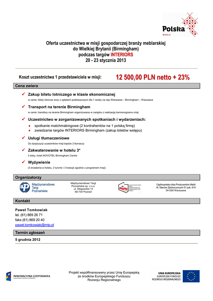 Oferta uczestnictwa w misji gospodarczej branŜy meblarskiej do Wielkiej Brytanii (Birmingham) podczas targów INTERIORS 20 - 23 stycznia 2013 Koszt uczestnictwa 1 przedstawiciela w misji: 12 500,00 PLN netto + 23% Cena zwiera Zakup biletu lotniczego w klasie ekonomicznej w cenie: bilety lotnicze wraz z opłatami podstawowymi dla 1 osoby na rejs Warszawa – Birmingham – Warszawa Transport na terenie Birmingham w cenie: transfery na terenie Birmingham organizowane w związku z realizacją harmonogramu misji Uczestnictwo w zorganizowanych spotkaniach i wydarzeniach: ♦ ♦ spotkanie matchmakingowe (2 kontrahentów na 1 polską firmę) zwiedzanie targów INTERIORS Birmingham (zakup biletów wstępu) Usługi tłumaczeniowe Do dyspozycji uczestników misji będzie 2 tłumaczy Zakwaterowanie w hotelu 3* 3 doby, hotel NOVOTEL Birmingham Centre WyŜywienie (3 śniadania w hotelu, 3 lunche i 3 kolacje zgodnie z programem misji) Organizatorzy Międzynarodowe Targi Poznańskie sp. z o.o. ul. Głogowska 14 60-734 Poznań Kontakt Paweł Tomkowiak tel. (61) 869 26 71 faks (61) 869 20 40 [email protected] Termin zgłoszeń 5 grudnia 2012 Projekt współfinansowany przez Unię Europejską ze środków Europejskiego Funduszu Rozwoju Regionalnego Ogólnopolska Izba Producentów Mebli Al. Stanów Zjednoczonych 51 pok. 614 04-028 Warszawa