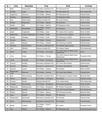 lp Imię Nazwisko Kraj Klub Funkcja 1 Mark Krawczynski Nie jestem członkiem ICC RC Warszawa City Członek Zarządu klubu 2 Andrzej Ludek ICC Polska – Niemcy RC Warszawa City Past Gubernator 3 Eugeniusz Gorczyca ICC Polska – Niemcy RC Warszawa City Członek klubu 4 Elżbieta Nowikiewicz Wybierz Komitet ICC RC Bydgoszcz Brda Członek klubu 5 Ewa Radomińska Wybierz Komitet ICC RC Łódź Centrum Oficer D-2230 6 Roman Rogoziński ICC Polska – Niemcy RC Szczecin Członek klubu 7 Hanka Rak ICC Polska – Niemcy RC Bydgoszcz Brda Członek klubu 8 ZBIGNIEW ROGOWSKI ICC Polska – Czech i Słowacja RC Katowice Oficer D-2230 9 Adam Czajkowski ICC Polska – Izrael RC Jelenia Góra-Cieplice Oficer D-2230 10 Małgorzata Pryjma-Czajkowska ICC Polska – Izrael RC Jelenia Góra-Cieplice Oficer D-2230 11 Izabela Olesiejuk ICC Polska – Izrael RC Warszawa Józefów Sekretarz klubu 12 Genello Jerzy ICC Polska – Francja Wybierz klub Członek klubu 13 Witold Szykula ICC Polska – Ukraina RC Warszawa Józefów Członek klubu 14 Boleslaw Kosciukiewicz Nie jestem członkiem ICC RC Gdańsk Sopot Gdynia Członek klubu 15 JAN WRANA Wybierz Komitet ICC RC Krakow Wawel Past Gubernator 16 Albert Czajka ICC Polska – Chorwacja RC Lublin Centrum Maria Curie Skłodowska CICO 17 Jerzy Kargol ICC Polska – Francja RC Lublin Centrum Maria Curie Skłodowska Prezydent Elekt 18 Jacek Woźniak ICC Polska – Szwajcaria RC Lublin Centrum Maria Curie Skłodowska Prezydent klubu 19 Andrzej Boublej Nie jestem członkiem ICC RC Lublin Stare Miasto Członek klubu 20 Barbara Pawlisz Nie jestem członkiem ICC RC Sopot International Gubernator 21 Ryszard Łuczyn ICC Polska – Ukraina RC Zamość Oficer D-2230 22 Małgorzata Julia Willaume ICC Polska – Ukraina RC Lublin Stare Miasto Członek klubu 23 Ewa Wierzchowska Nie jestem członkiem ICC RC Warszawa Fryderyk Chopin Skarbnik klubu 24 Marian Demel ICC Polska – Chorwacja RC Kraków Wybierz funkcję 25 Guenter Koenig Wybierz Komitet ICC Inny: Nazwa klubu... Past Gubernator 26 Tomasz Wyrozumski ICC Polska – Szwajcaria RC Kraków Wyspiański Oficer D-2230 27 Małgorzata Radziejowska ICC Polska – Szwajcaria RC Kraków Wyspiański Członek klubu 28 Gianni Jandolo Wybierz Komitet ICC Inny: San Donato Milanese Past Gubernator 29 Roland Sprung ICC Polska – Niemcy RC Warszawa Goethe Skarbnik klubu 30 adam Sadecki ICC Polska – Ukraina RC Rzeszów Skarbnik klubu 31 Włodzimierz Bentkowski Nie jestem członkiem ICC RC Zamość Członek klubu 32 Anna Kaczmarczyk Nie jestem członkiem ICC RC Zamość Członek klubu 33 Marek Cydejko ICC Polska – Czech i Słowacja RC Chełm Prezydent klubu 34 Alex Kartsel ICC Polska – Białoruś RC Warszawa City Członek Zarządu klubu