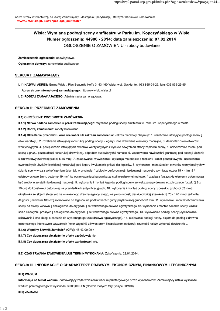 1z3 http://bzp0.portal.uzp.gov.pl/index.php?ogloszenie=show&pozycja=44... Adres strony internetowej, na której Zamawiający udostępnia Specyfikację Istotnych Warunków Zamówienia: www.um.wisla.pl/SIWZ/podloga_amfiteatr/ Wisła: Wymiana podłogi sceny amfiteatru w Parku im. Kopczyńskiego w Wiśle Numer ogłoszenia: 44986 - 2014; data zamieszczenia: 07.02.2014 OGŁOSZENIE O ZAMÓWIENIU - roboty budowlane Zamieszczanie ogłoszenia: obowiązkowe. Ogłoszenie dotyczy: zamówienia publicznego. SEKCJA I: ZAMAWIAJĄCY I. 1) NAZWA I ADRES: Gmina Wisła , Plac Bogumiła Hoffa 3, 43-460 Wisła, woj. śląskie, tel. 033 855-24-25, faks 033 855-29-95. Adres strony internetowej zamawiającego: http://www.bip.wisla.pl I. 2) RODZAJ ZAMAWIAJĄCEGO: Administracja samorządowa. SEKCJA II: PRZEDMIOT ZAMÓWIENIA II.1) OKREŚLENIE PRZEDMIOTU ZAMÓWIENIA II.1.1) Nazwa nadana zamówieniu przez zamawiającego: Wymiana podłogi sceny amfiteatru w Parku im. Kopczyńskiego w Wiśle. II.1.2) Rodzaj zamówienia: roboty budowlane. II.1.4) Określenie przedmiotu oraz wielkości lub zakresu zamówienia: Zakres rzeczowy obejmuje: 1. rozebranie istniejącej podłogi sceny [ obie warstwy ], 2. rozebranie istniejącej konstrukcji podłogi sceny - legary i inne drewniane elementy mocujące, 3. demontaż osłon otworów wentylacyjnych, 4. powiększenie istniejących otworów wentylacyjnych i wykucie nowych od strony zaplecza sceny, 5. oczyszczenie terenu pod sceną z gruzu, pozostałości konstrukcji drewnianej, odpadów budowlanych i humusu, 6. wapnowanie nawierzchni gruntowej pod sceną i ułożenie 5 cm warstwy żwirowej [frakcji 5-15 mm], 7. załadowanie, wywiezienie i utylizacja materiałów z rozbiórki i robót porządkowych . uzupełnienie ewentualnych ubytków istniejącej konstrukcji pod legary i wykonanie gniazd dla legarów, 8. wykonanie i montaż osłon otworów wentylacyjnych w ścianie sceny wraz z wykończeniem ścian jak w oryginale: * z blachy perforowanej nierdzewnej matowej o wymiarze oczka 15 x 4 [mm] / odstępy osiowe 8mm, poziome 19 mm] /w obramowaniu z kątownika ze stali nierdzewnej matowej, * z żaluzją [wszystkie elementy osłon muszą być zrobione ze stali nierdzewnej matowej], 9. wykonanie i montaż legarów podłogi sceny ze wskazanego drewna egzotycznego [przekrój 8 x 16 cm] do konstrukcji betonowej na przekładkach antywibracyjnych, 10. wykonanie i montaż podłogi sceny z desek o grubości 52 mm [ okrętówka ze słojem stojącym] ze wskazanego drewna egzotycznego, na pióro -wpust; deski jednolitej szerokości [ 70 - 140 mm] i jednolitej długości [ minimum 100 cm] montowane do legarów na podkładkach z gumy prążkowanej grubości 3 mm, 11. wykonanie i montaż obramowania sceny od strony widowni [ analogicznie do oryginału ] ze wskazanego drewna egzotycznego 12. wykonanie i montaż cokolika sceny wzdłuż ścian łukowych i prostych [ analogicznie do oryginału ] ze wskazanego drewna egzotycznego, 13. wyrównanie podłogi sceny [cyklinowanie, szlifowanie i inne zbiegi stosownie do wybranego gatunku drzewa egzotycznego], 14. olejowanie podłogi sceny, olejem do podłóg z drewna egzotycznego intensywnie używanych [kolor uzgodnić z inwestorem i inspektorem nadzoru]; czynność należy wykonać dwukrotnie .. II.1.6) Wspólny Słownik Zamówień (CPV): 45.43.00.00-4. II.1.7) Czy dopuszcza się złożenie oferty częściowej: nie. II.1.8) Czy dopuszcza się złożenie oferty wariantowej: nie. II.2) CZAS TRWANIA ZAMÓWIENIA LUB TERMIN WYKONANIA: Zakończenie: 28.04.2014. SEKCJA III: INFORMACJE O CHARAKTERZE PRAWNYM, EKONOMICZNYM, FINANSOWYM I TECHNICZNYM III.1) WADIUM Informacja na temat wadium: Zamawiający żąda wniesienia wadium przetargowego przez Wykonawców. Zamawiający ustala wysokość wadium przetargowego w wysokości 3.000,00 PLN (słownie złotych: trzy tysiące 00/100) III.2) ZALICZKI 2z3 http://bzp0.portal.uzp.gov.pl/index.php?ogloszenie=show&pozycja=44... III.3) WARUNKI UDZIAŁU W POSTĘPOWANIU ORAZ OPIS SPOSOBU DOKONYWANIA OCENY SPEŁNIANIA TYCH WARUNKÓW III.3.4) Osoby zdolne do wykonania zamówienia Opis sposobu dokonywania oceny spełniania tego warunku dysponują osobą posiadającą uprawnienia do pełnienia samodzielnych funkcji technicznych w budownictwie w specjalności konstrukcyjno-budowlanej, tj. osobą, która będzie pełniła funkcję kierownika budowy III.4) INFORMACJA O OŚWIADCZENIACH LUB DOKUMENTACH, JAKIE MAJĄ DOSTARCZYĆ WYKONAWCY W CELU POTWIERDZENIA SPEŁNIANIA WARUNKÓW UDZIAŁU W POSTĘPOWANIU ORAZ NIEPODLEGANIA WYKLUCZENIU NA PODSTAWIE ART. 24 UST. 1 USTAWY III.4.1) W zakresie wykazania spełniania przez wykonawcę warunków, o których mowa w art. 22 ust. 1 ustawy, oprócz oświadczenia o spełnianiu warunków udziału w postępowaniu należy przedłożyć: wykaz osób, które będą uczestniczyć w wykonywaniu zamówienia, w szczególności odpowiedzialnych za świadczenie usług, kontrolę jakości lub kierowanie robotami budowlanymi, wraz z informacjami na temat ich kwalifikacji zawodowych, doświadczenia i wykształcenia niezbędnych do wykonania zamówienia, a także zakresu wykonywanych przez nie czynności, oraz informacją o podstawie do dysponowania tymi osobami; oświadczenie, że osoby, które będą uczestniczyć w wykonywaniu zamówienia, posiadają wymagane uprawnienia, jeżeli ustawy nakładają obowiązek posiadania takich uprawnień; III.4.2) W zakresie potwierdzenia niepodlegania wykluczeniu na podstawie art. 24 ust. 1 ustawy, należy przedłożyć: oświadczenie o braku podstaw do wykluczenia; aktualny odpis z właściwego rejestru lub z centralnej ewidencji i informacji o działalności gospodarczej, jeżeli odrębne przepisy wymagają wpisu do rejestru lub ewidencji, w celu wykazania braku podstaw do wykluczenia w oparciu o art. 24 ust. 1 pkt 2 ustawy, wystawiony nie wcześniej niż 6 miesięcy przed upływem terminu składania wniosków o dopuszczenie do udziału w postępowaniu o udzielenie zamówienia albo składania 